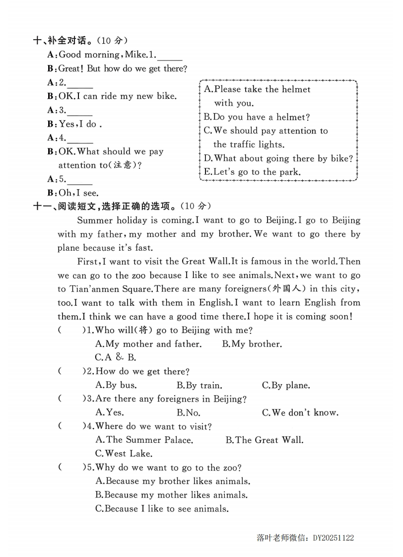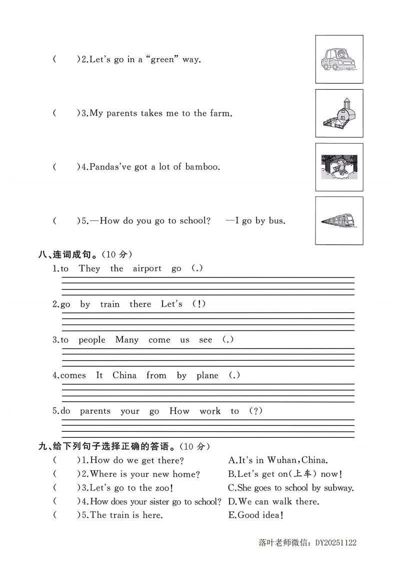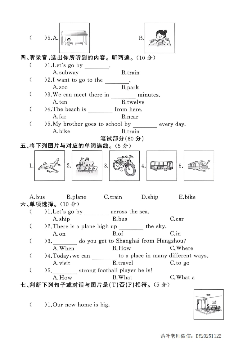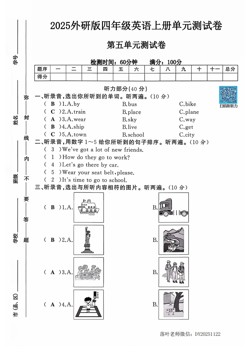 2025外研版四年级英语上册单元测试卷第五单元测试卷霸检测时间:60分钟满分:100分题序三四五六七八九十十一总分得分听力部分(40分)弥一、听录音,选出你所听到的单词。听两遍。(10分)()1.A.byB.busC.bike扫码听听力()2.A.trainB.placeC.plane封()3.A.wearB.skyC.way()4.A.shipB.liveC.get()5.A.town线B.schoolC.city二、听录音,用数字1~5给你所听到的句子排序。听两遍。(10分))We've got a lot of new friends.内()How do they go to work?()Let's go there by car.)Wear your seat belt,please.蠻不()It's time to go to school.三、听录音,选出与所听内容相符的图片。听两遍。(10分)要)1.A00B⑨@@答荞题)2.AB)3.A☒)4.AB落叶老师微信:DY20251122