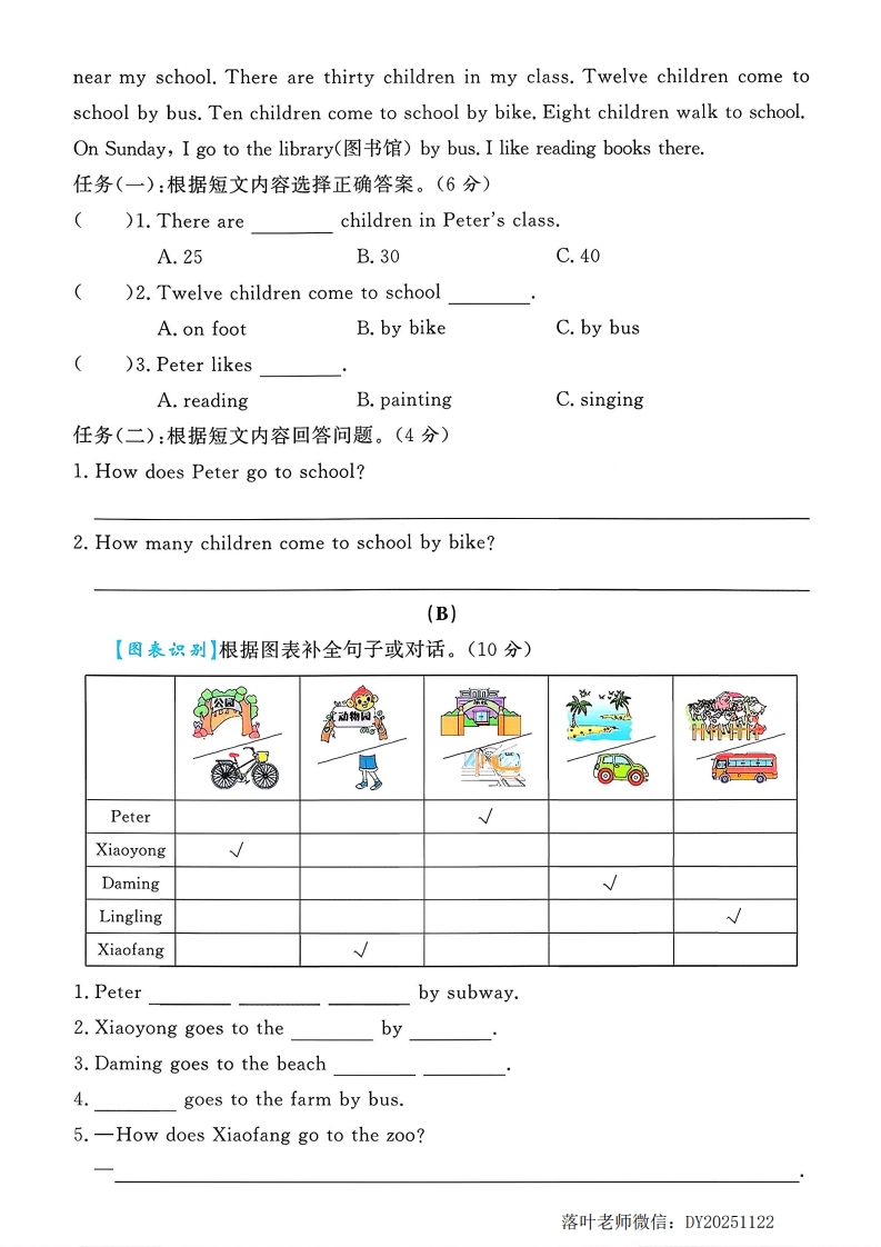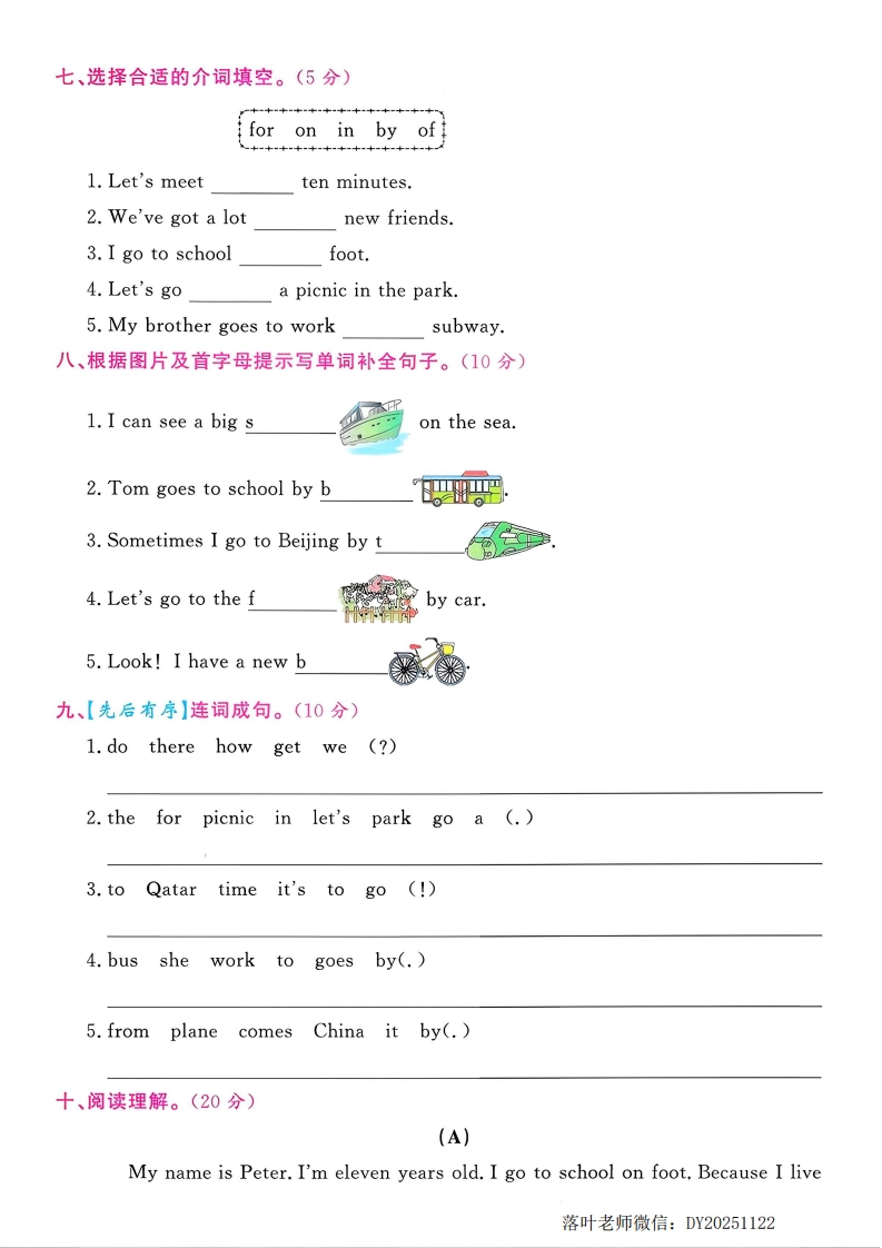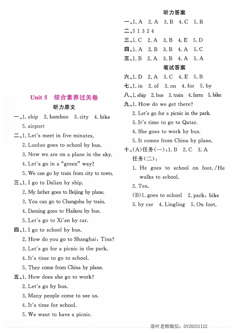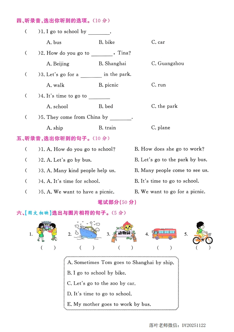 2025外研版四年级英语上册单元测试卷Unit5综合素养过关卷时间:60分钟书写等级:质量等级:听力部分(50分)[所力音频]一、【听音选图】听录音,选出与你所听单词相符的图片。(10分)锅新()1.B.)2.A)3.A.布金)4.A)5.A二、【先后有序】听录音,给下列句子标序号。(10分)()We can go by train from city to town.)Let's meet in five minutes.)Now we are on a plane in the sky.毁()Luoluo goes to school by bus.)Let's go in a“green”wayl三、【一一对应】听录音,根据所听句子将相关内容连线。(10分)1.Dalian2.Beijing3.Changsha4.Haikou5.Xi'anA.落叶老师微信:DY20251122