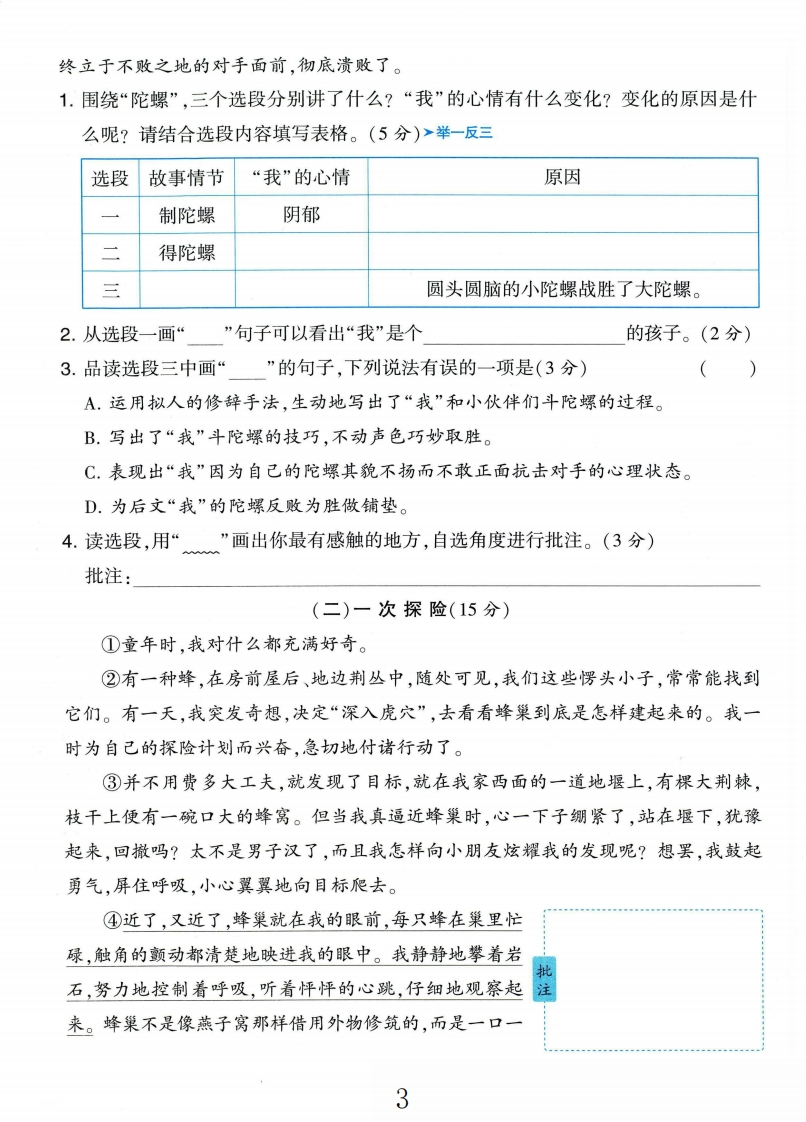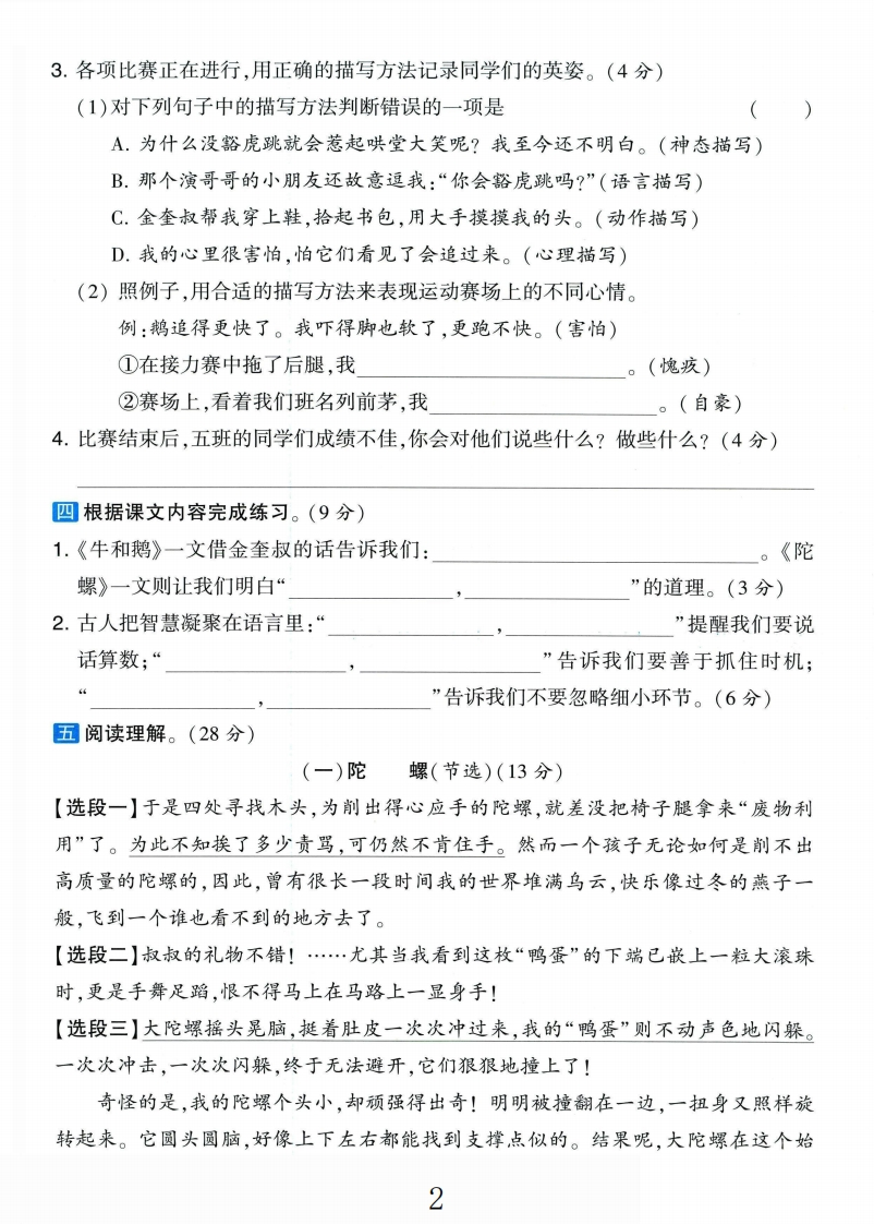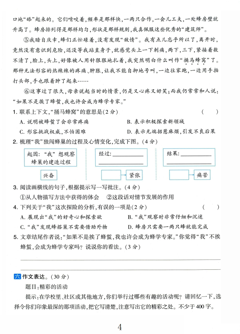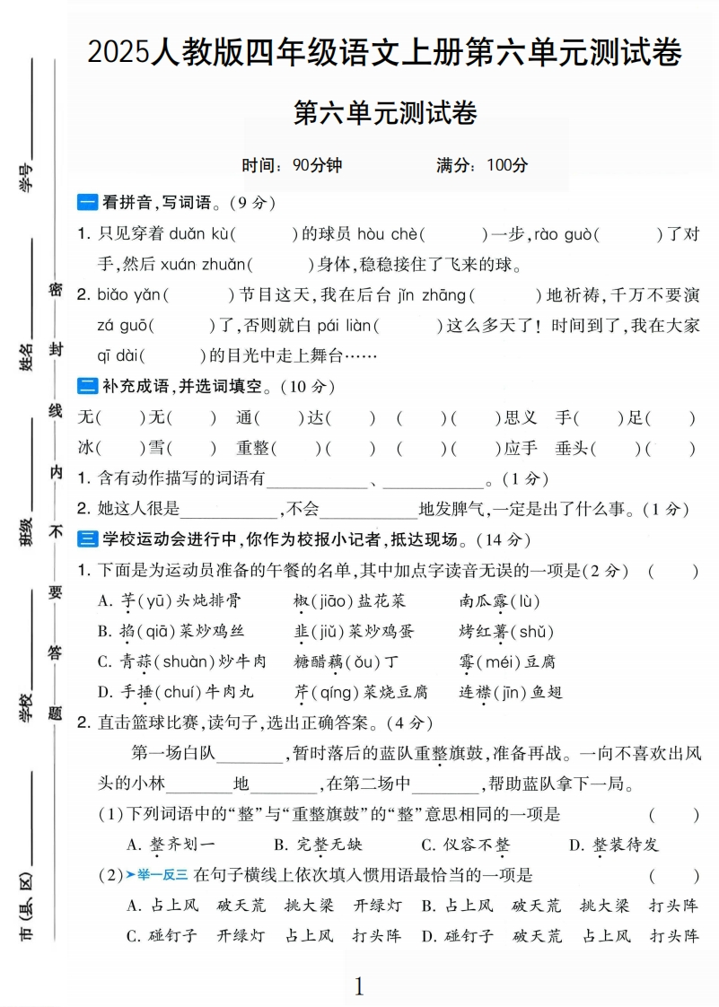 2025人教版四年级语文上册第六单元测试卷第六单元测试卷霸时间:90分钟满分:100分看拼音,写词语。(9分)》1.只见穿着duǎnkù()的球员hou che()一步,ràoguò()了对手,然后xuan zhuan()身体,稳稳接住了飞来的球。密2.biao yan()节目这天,我在后台jin zhang()地祈祷,千万不要演za guo()了,否则就白paiiàn()这么多天了!时间到了,我在大家毁封qi dai()的目光中走上舞台…日补充成语,并选词填空。(10分)线无()无()通()达()()()思义手()足(冰()雪()重整()()()()应手垂头()()内1.含有动作描写的词语有。(1分)2.她这人很是,不会地发脾气,一定是出了什么事。(1分)不目学校运动会进行中,你作为校报小记者,抵达现场。(14分)1.下面是为运动员准备的午餐的名单,其中加点字读音无误的一项是(2分)(要A.芋(yū)头炖排骨椒(jiao)盐花莱南瓜露(ù)B.掐(qio)菜炒鸡丝韭(iǔ)菜炒鸡蛋烤红薯(shǔ)答C.青蒜(shuan)炒牛肉糖醋藕(ǒu)丁霉(mei)豆腐D.手捶(chui)牛肉丸靠芹(qing)菜烧豆腐连襟(jin)鱼翅题2.直击篮球比赛,读句子,选出正确答案。(4分)第一场白队,暂时落后的蓝队重整旗鼓,准备再战。一向不喜欢出风头的小林地在第二场中,帮助蓝队拿下一局。(1)下列词语中的“整”与“重整旗鼓”的“整”意思相同的一项是A.整齐划一B.完整无缺C.仪容不整D.整装待发因(2))举一反三在句子横线上依次填入惯用语最恰当的一项是∮A.占上风破天荒挑大梁开绿灯B.占上风破天荒挑大梁打头阵eC.碰钉子开绿灯占上风打头阵D.碰钉子破天荒占上风打头阵1