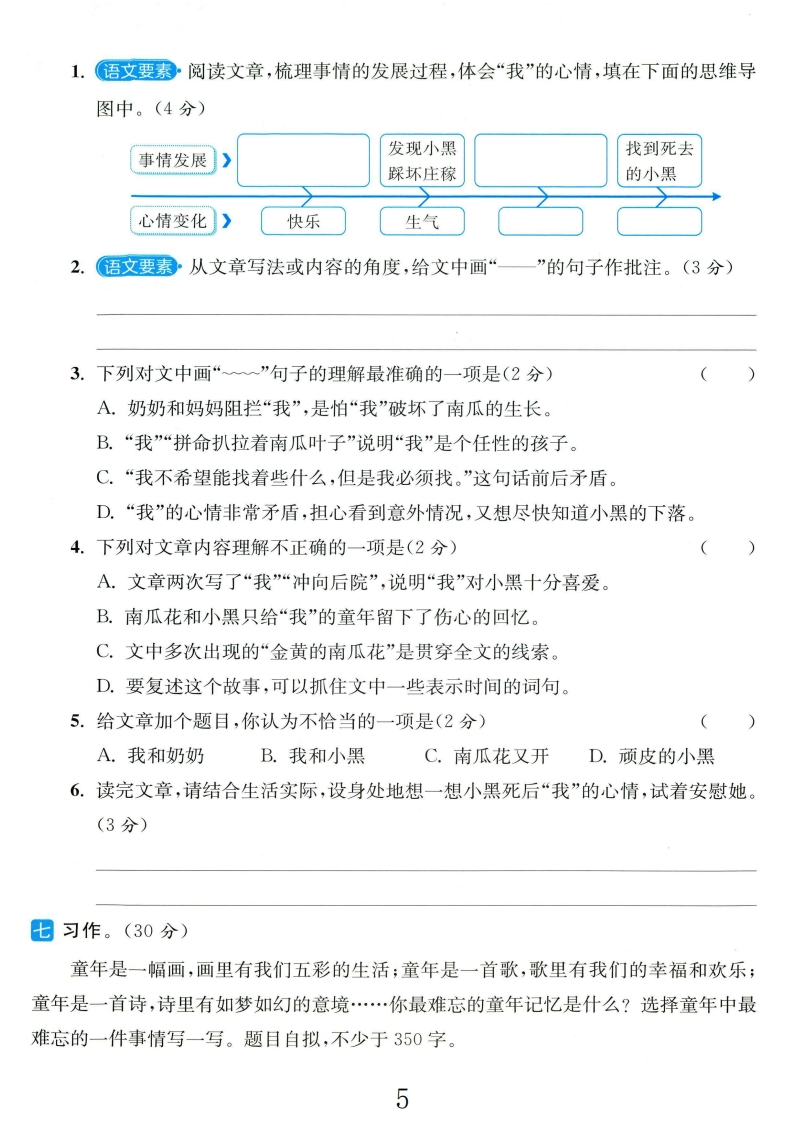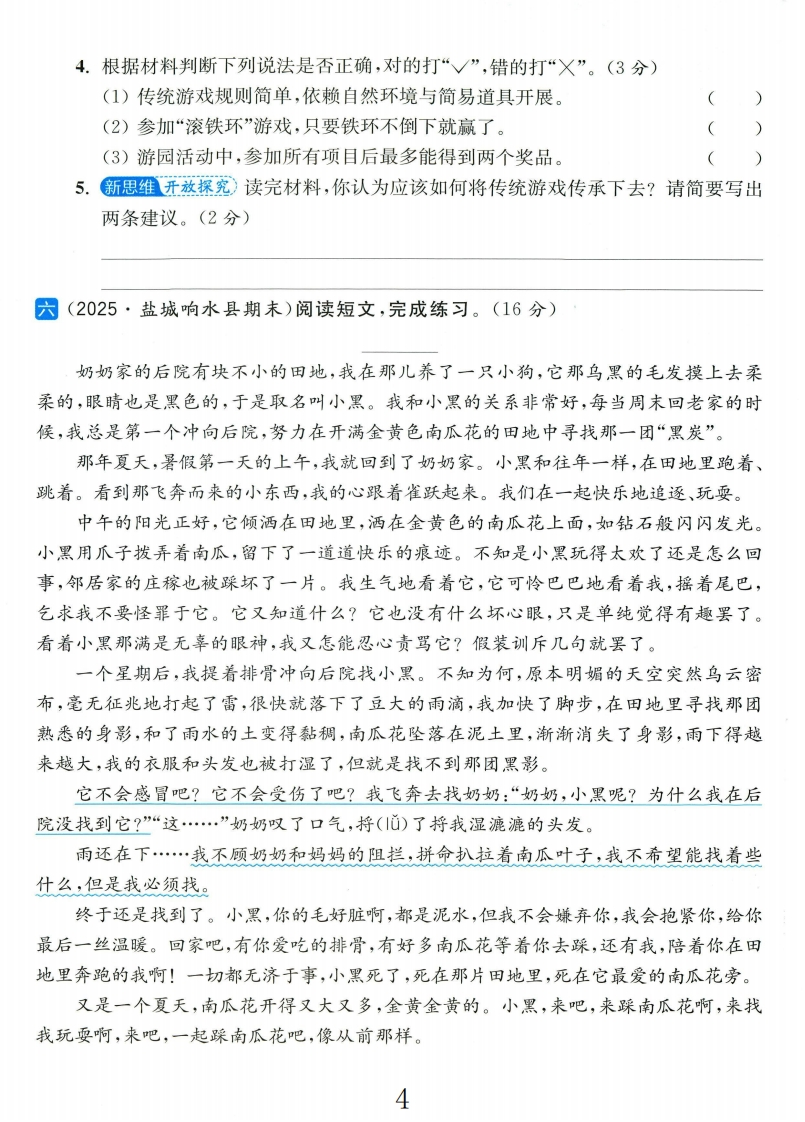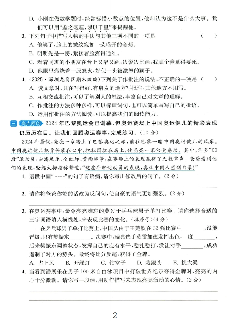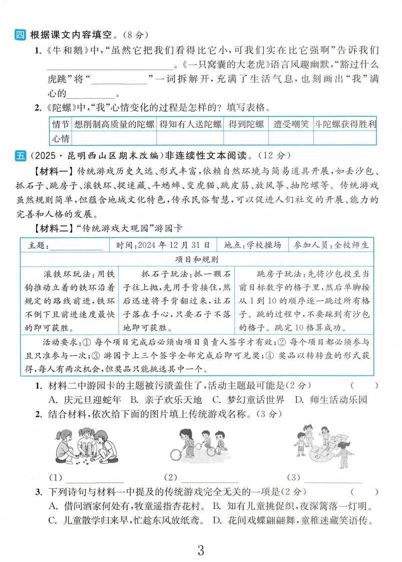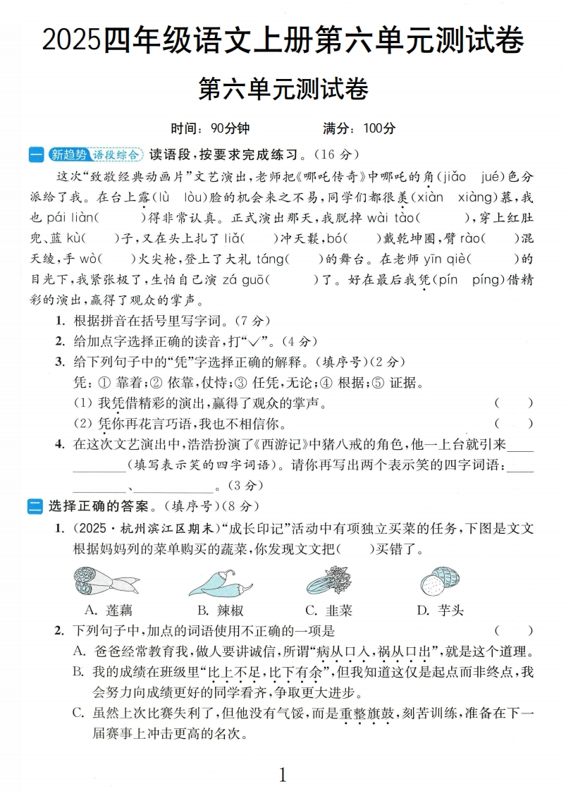 2025四年级语文上册第六单元测试卷第六单元测试卷时间:90分钟满分:100分新趋势语段综合)读语段,按要求完成练习。(16分)这次“致敬经典动画片”文艺演出,老师把《哪吃传奇》中哪吃的角(jiǎ0jué)色分派给了我。在台上露(IùIòu)脸的机会来之不易,同学们都很美(Xiànxiàng)慕,我也pai licàn()得非常认真。正式演出那天,我脱掉wàitào(),穿上红肚兜、蓝kù()子,又在头上扎了iǎ()冲天鬏,b6()戴乾坤圈,臂rào()混天绫,手wò()火尖枪,登上了大礼táng()的舞台。在老师yin gie()的目光下,我紧张极了,生怕自己演zágu6()了。好在最后我凭(pin ping)借精彩的演出,赢得了观众的掌声。1.根据拼音在括号里写字词。(7分)2.给加点字选择正确的读音,打“√/”。(4分)3.给下列句子中的“凭”字选择正确的解释。(填序号)(2分)凭:①靠着;②依靠,仗恃;③任凭,无论;④根据;⑤证据。(1)我凭借精彩的演出,赢得了观众的掌声。()(2)凭你再花言巧语,我也不相信你。4.在这次文艺演出中,浩浩扮演了《西游记》中猪八戒的角色,他一上台就引来(填写表示笑的四字词语)。请你再写出两个表示笑的四字词语:。(3分)日选择正确的答案。(填序号)(8分)1.(2025·杭州滨江区期末)“成长印记”活动中有项独立买菜的任务,下图是文文根据妈妈列的菜单购买的蔬菜,你发现文文把()买错了。A.莲藕B.辣椒C.韭菜D.芋头2.下列句子中,加点的词语使用不正确的一项是A.爸爸经常教育我,做人要讲诚信,所谓“病从口人,祸从口出”,就是这个道理。B.我的成绩在班级里“比上不足,比下有余”,但我知道这仅是起点而非终点,我会努力向成绩更好的同学看齐,争取更大进步。C.虽然上次比赛失利了,但他没有气馁,而是重整旗鼓,刻苦训练,准备在下一届赛事上冲击更高的名次。1
