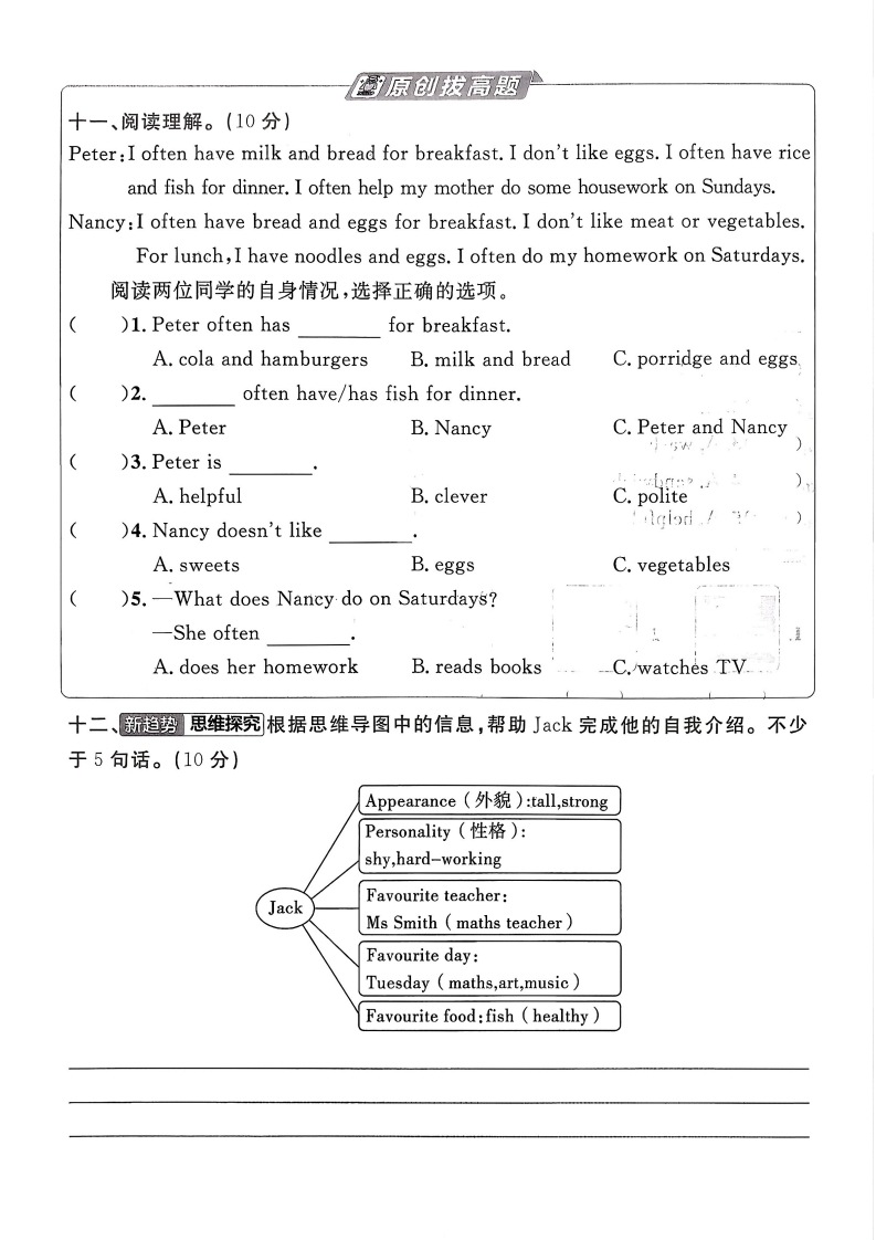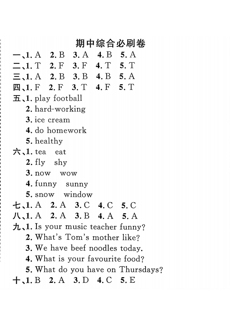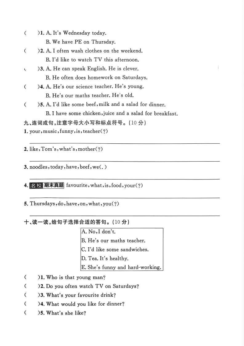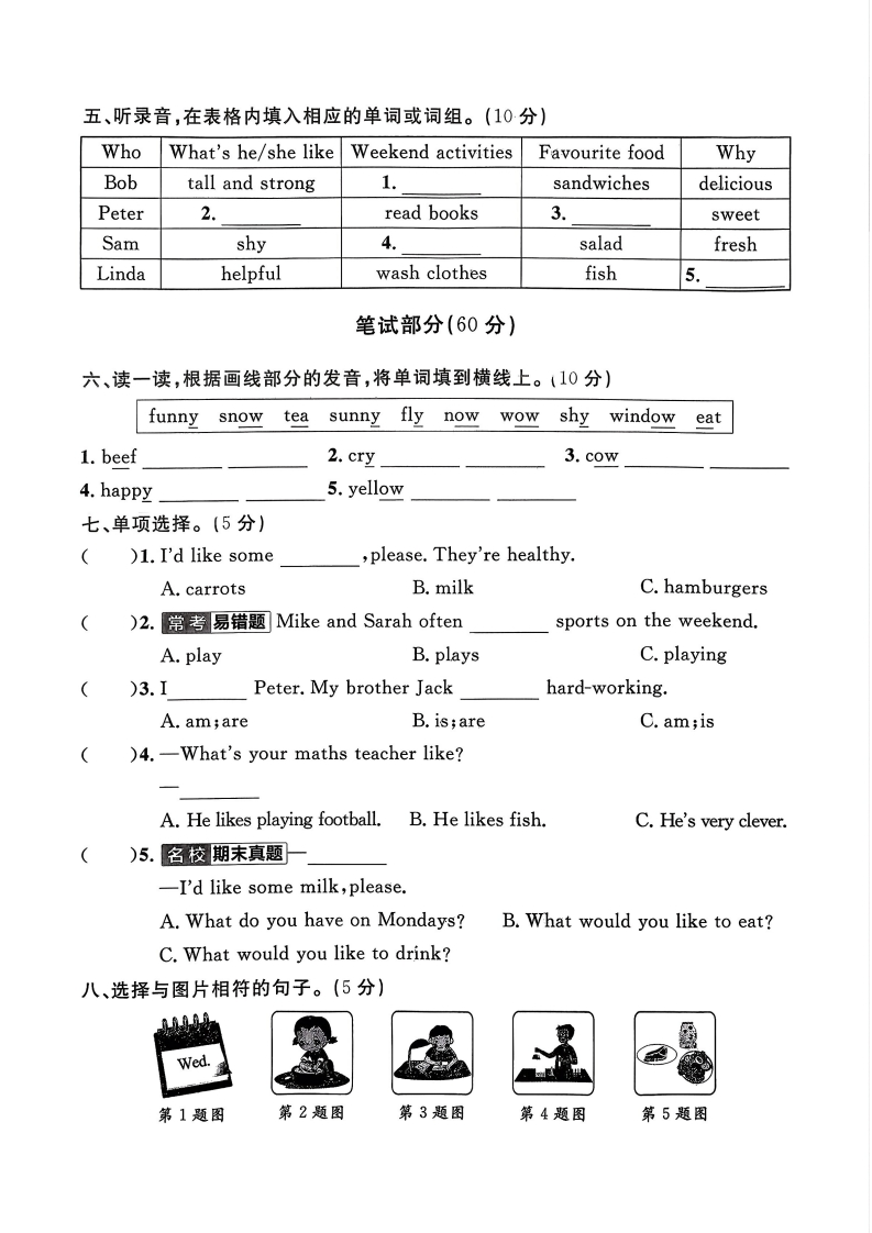 2025年人教版五年级英语上册期中测试卷繁期中测试卷听力部分(40分)一、听录音,选出句子中所包含的单词。(5分)()1.A.shyB.strict)2.A.ThursdaysB.Tuesdays)3.A.washB.watch)4.A.sandwichB.salad)5.A.helpfulB.healthy二、听录音,判断图片与句意是(T)否(F)相符。(5分)L Friday6+xWednesdayChinese3mathsEnglish三、听录音,选择正确的答语。(10分))1.A.He is Mr Jones.B.He's tall and thin.()2.A.I'd like a salad,please.B.I'd like some water,please.()3.A.We often play sports.B.We have maths,English and art.)4.A.Yes,I am.B.No,I don't.斜()5.A.Noodles.They're delicious.B.I would like some noodles.四、听录音,根据短文内容判断句子正(T)误(F)。(10分))1.Tom is shy and helpful.()2.Tom often helps his mother clean the room at home on weekends.()3.Tom often has bread and milk for breakfast.)4.Tom has fish and rice for lunch on Wednesdays.)5.Tom has PE and art on Fridays.