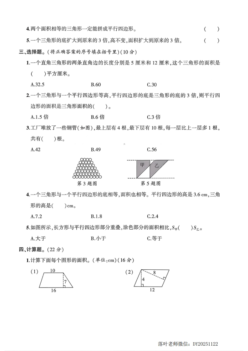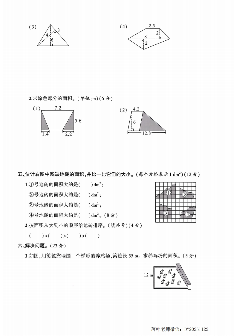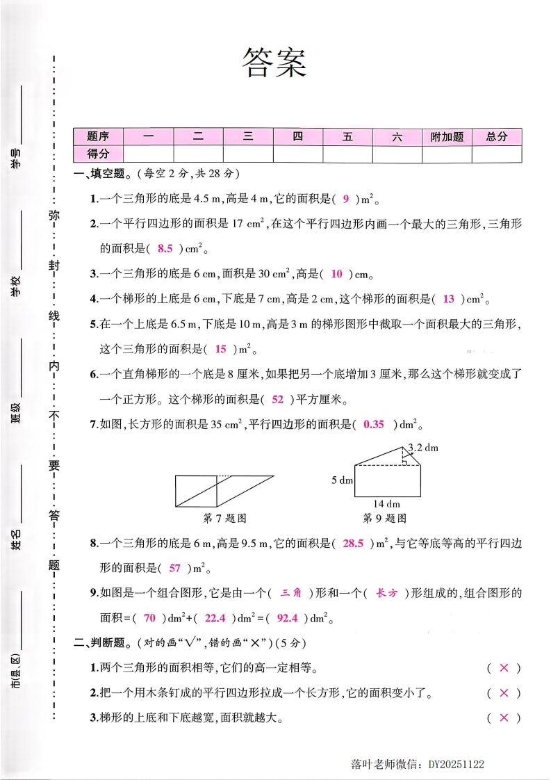 2025人教版五年级数学上册单元测试卷第六单元测试卷:时间:90分钟满分:100分+10分题序二三四五六附加题总分得分一、填空题。(每空2分,共28分)1.一个三角形的底是4.5m,高是4m,它的面积是()m2。弥2.一个平行四边形的面积是17cm2,在这个平行四边形内画一个最大的三角形,三角形的面积是()cm2。封3.一个三角形的底是6cm,面积是30cm㎡2,高是()cmo那4.一个梯形的上底是6cm,下底是7cm,高是2cm,这个梯形的面积是()cm2。线5.在一个上底是6.5m,下底是10m,高是3m的梯形图形中截取一个面积最大的三角形,这个三角形的面积是()m2。内6.一个直角梯形的一个底是8厘米,如果把另一个底增加3厘米,那么这个梯形就变成了一个正方形。这个梯形的面积是()平方厘米。不7.如图,长方形的面积是35cm2,平行四边形的面积是()dm2。3.2dm要5 dm14 dm答第7题图第9题图权8.一个三角形的底是6m,高是9.5m,它的面积是()m2,与它等底等高的平行四边题形的面积是()m2。9.如图是一个组合图形,它是由一个()形和一个()形组成的,组合图形的面积=()dm2+()dm2=()dm2。二、判断题。(对的画“V”,错的画“X”)(5分)☒1.两个三角形的面积相等,它们的高一定相等。2.把一个用木条钉成的平行四边形拉成一个长方形,它的面积变小了。3梯形的上底和下底越宽,面积就越大。落叶老师微信:DY20251122