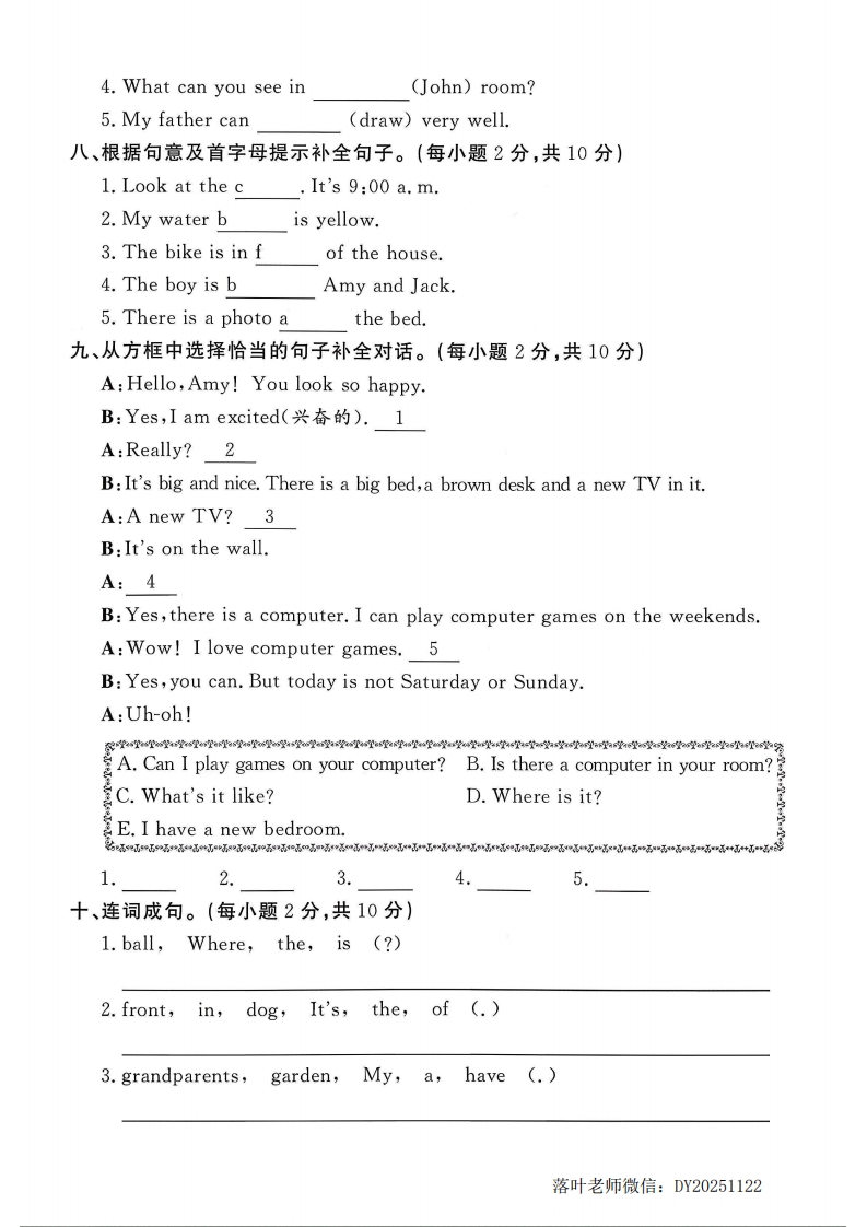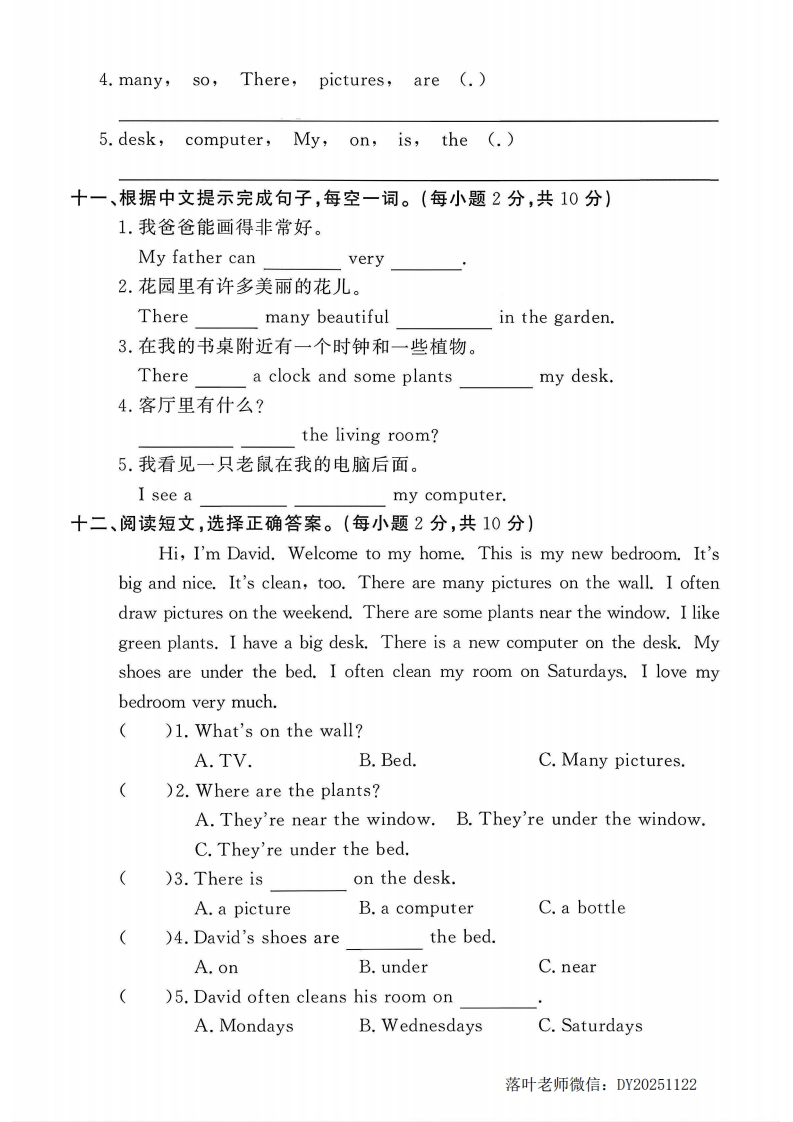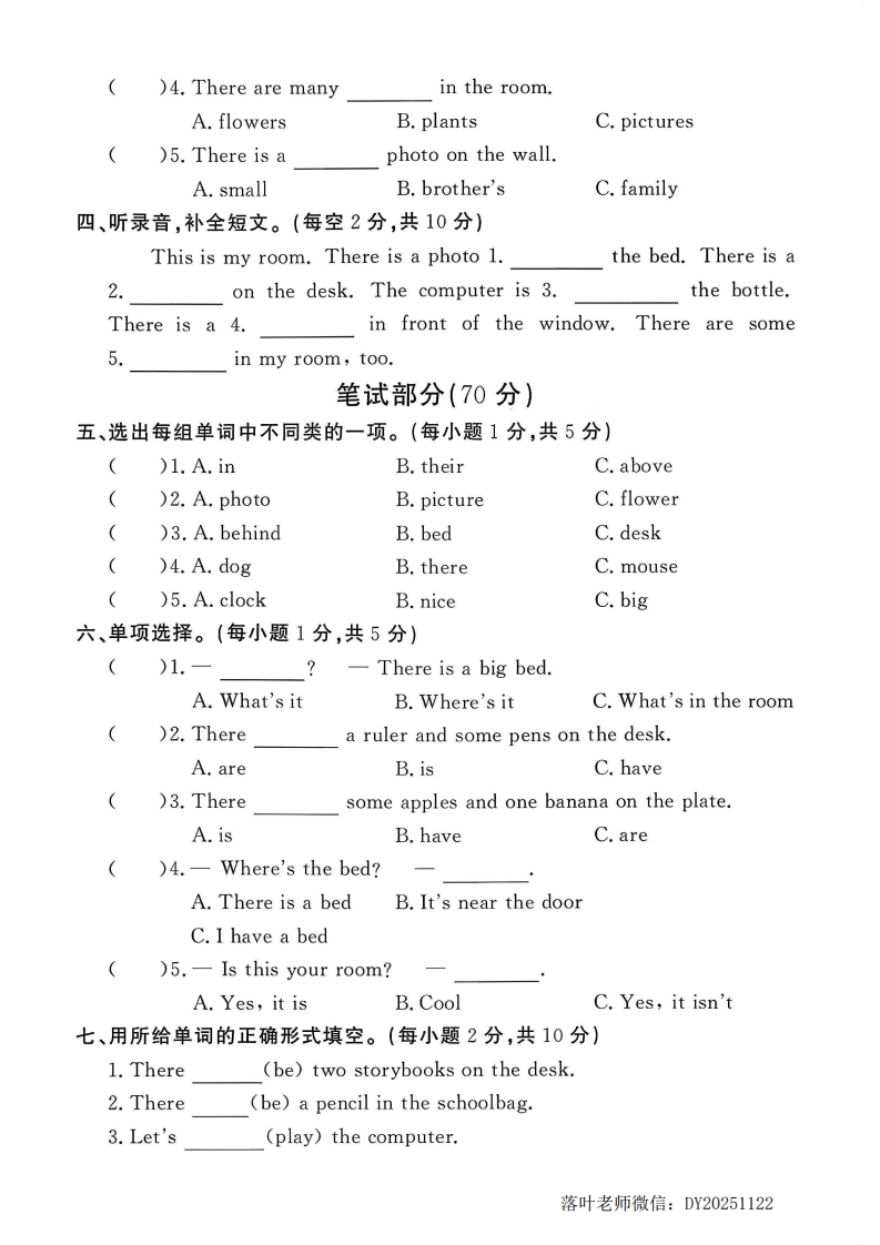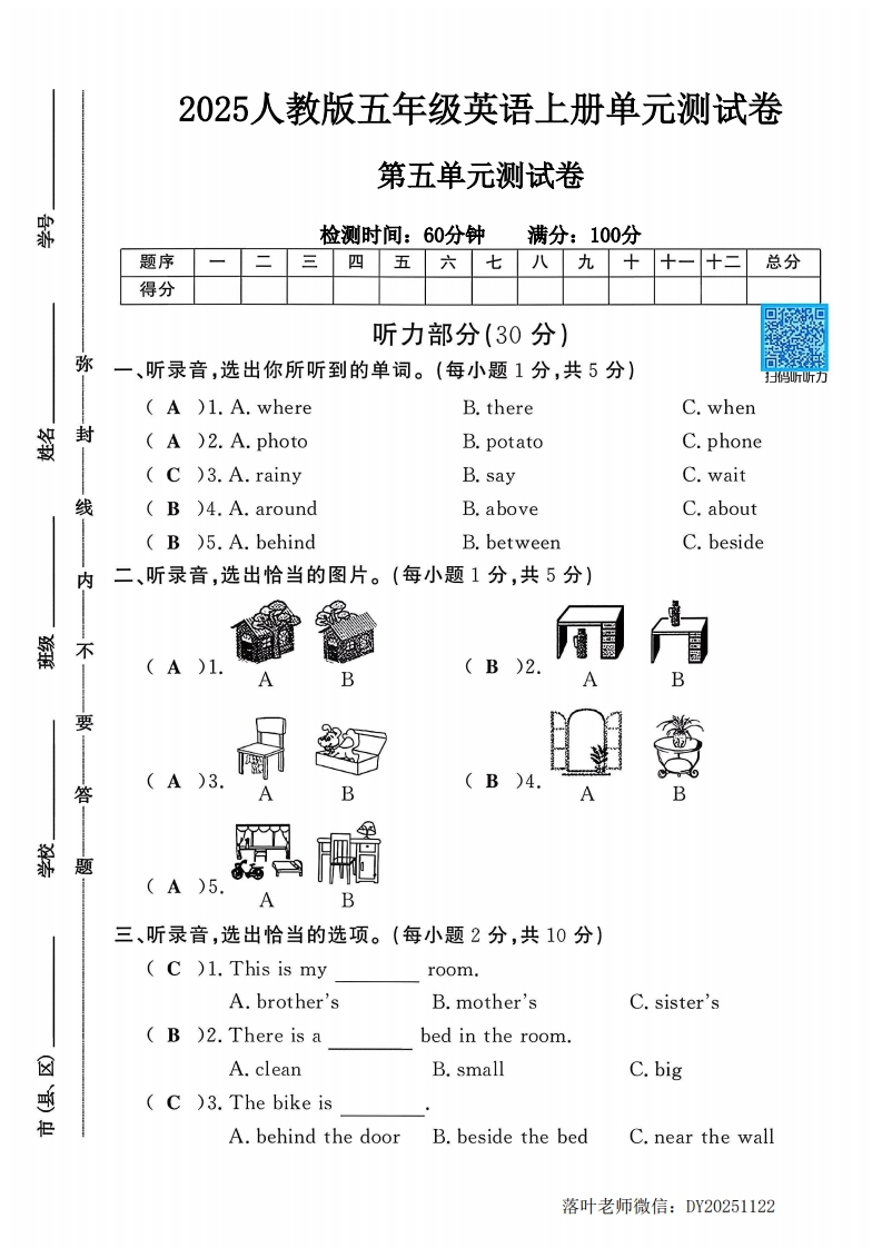 2025人教版五年级英语上册单元测试卷第五单元测试卷邪检测时间:60分钟满分:100分题序三四五六七八九十十总分得分听力部分(30分)弥一、听录音,选出你所听到的单词。(每小题1分,共5分)码听听方()1.A.whereB.thereC.when蟹封()2.A.photoB.potatoC.phone()3.A.rainyB.sayC.wait线()4.A.aroundB.aboveC.about()5.A.behindB.betweenC.beside内二、听录音,选出恰当的图片。(每小题1分,共5分)】蠻不)1.)2BB要)3.)4.答B靠题)5AB三、听录音,选出恰当的选项。(每小题2分,共10分)()1.This is myroom.A.brother'sB.mother'sC.sister's()2.There is abed in the room.☒A.cleanB.smallC.big)3.The bike isA.behind the doorB.beside the bedC.near the wall落叶老师微信:DY20251122