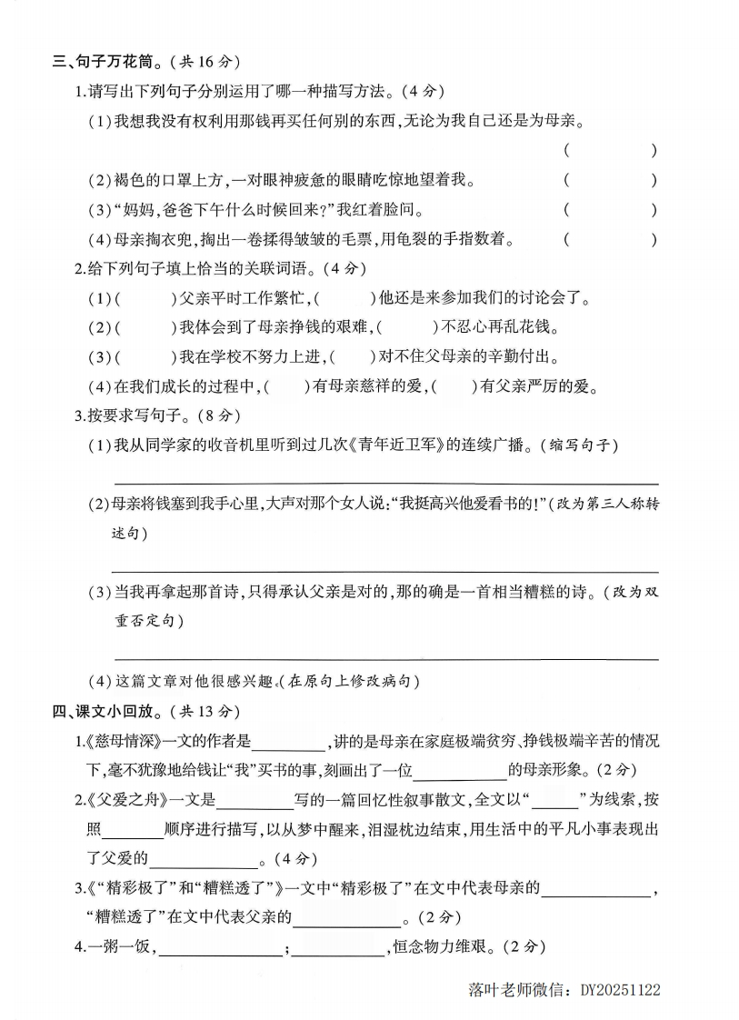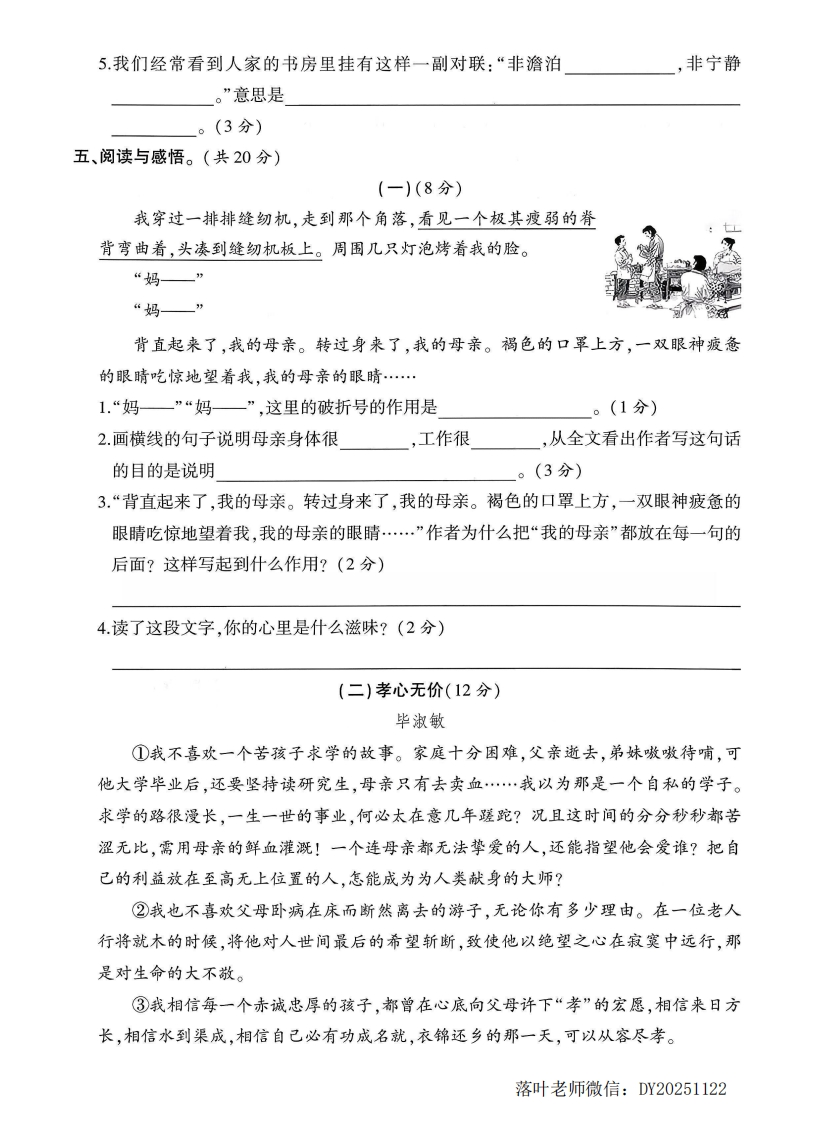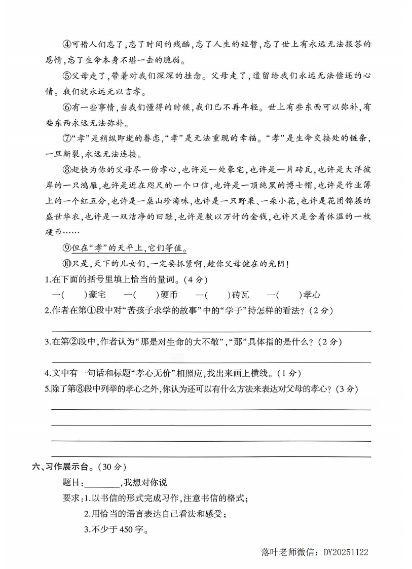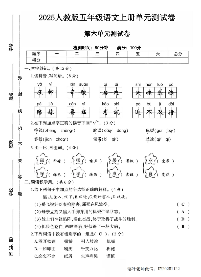 2025人教版五年级语文上册单元测试卷第六单元测试卷器检测时间:90分钟满分:100分题序二目四五六总分得分一、生字熟记。(共15分)弥1.读拼音,写词语。(8分)yayixin suandishi hun luòpò封peijiàcanSTkǎ0shipobudai线2在下列加点字正确的读音下画“V”。(3分)》内挣钱(zhengzheng)耽误(dandang)龟裂(gui jun)客栈(jianzhan偏僻(bipi)歧途(qiqi)蠻不3.比一比,再组词。(4分)要答二、词语积学用。(共6分)靠1.给下列句子中加点的字选择正确的解释。(4分)题陷:A.坠入,沉下:B.凹进;C.设计害人;D.攻破。(1)岳飞被奸臣秦桧陷害,屈死在风波亭。((2)母亲立刻又陷人手脚并用的机械忙碌状态。((3)战士们冲锋陷阵,浴血奋战,终于取得了战斗的胜利。((4)他脸色苍白,两眼深陷,好似得了一场大病。(2.下列词语中没有错别字的一组是()。(2分)☒A.震耳欲聋撒娇引入岐途机械B.一如即往喇笑千变万化棉袍eC.恋恋不舍纸屑失声痛哭谨慎落叶老师微信:DY20251122