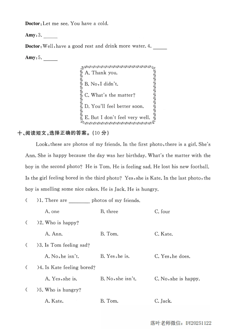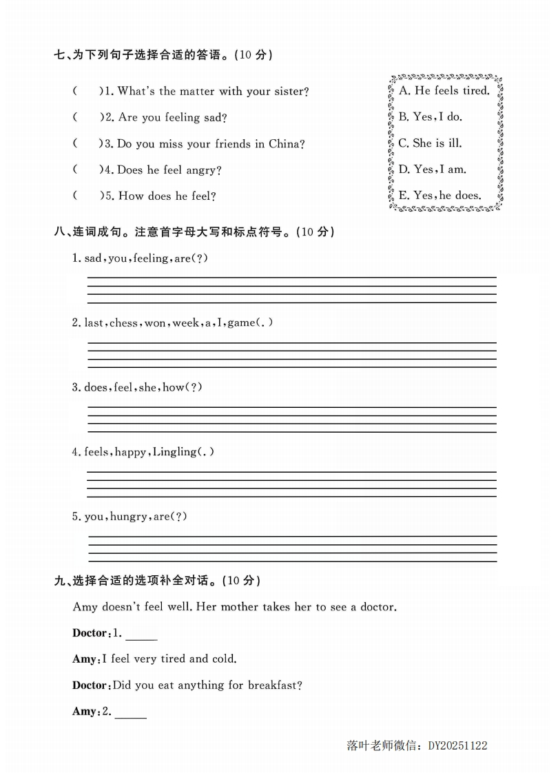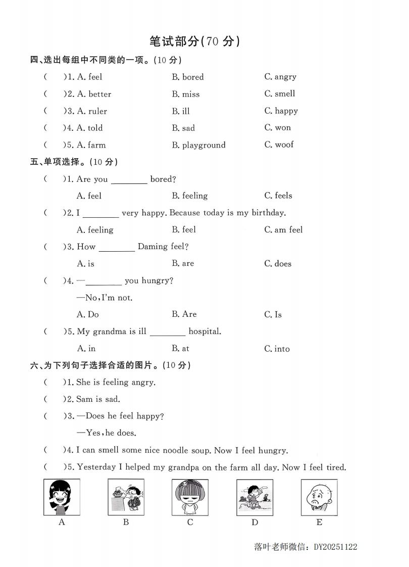 2025外研版五年级英语上册单元测试卷第九单元测试卷检测时间:60分钟满分:100分题序三四五六七八九总分得分听力部分(30分)密一、听录音,选出你所听到的短语。(10分)】扫俏听听万封)1.A.my grandparentsB.my grandpaC.my grandma轂)2.A.feel happyB.feel sadC.feel bored线)3.A.stamp your feetB.clap your handsC.shake your head内)4.A.last weekB.last weekendC.last Friday童不)5.A.miss motherB.miss Chen JieC.miss your friends二、听录音,判断下列图片是(T)否(F)正确。(10分)要答1.(2.5.题三、听录音,根据所听到的问句选择合适的答语。(10分))1.A.Yes,I am.B.Yes,I do.C.Yes,I did.)2.A.Yes,he is.B.Yes,she is.C.Yes,she does.)3.A.No,he doesn't.B.No,he isn't.C.No,she doesn't.☒()4.A.She is Lingling.B.Lingling is ill.C.She feels happy.()5.A.I'm sad.B.My grandma is ill.C.Oh,I'm so sorry!落叶老师微信:DY20251122