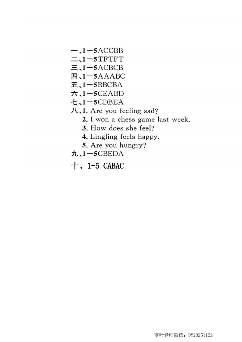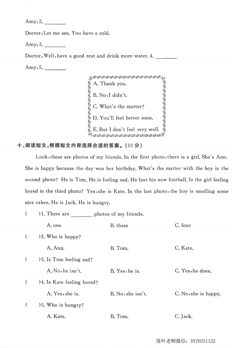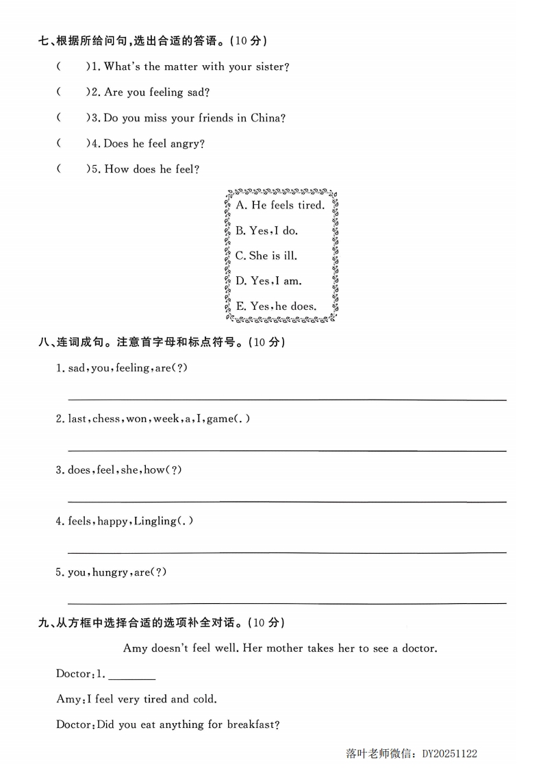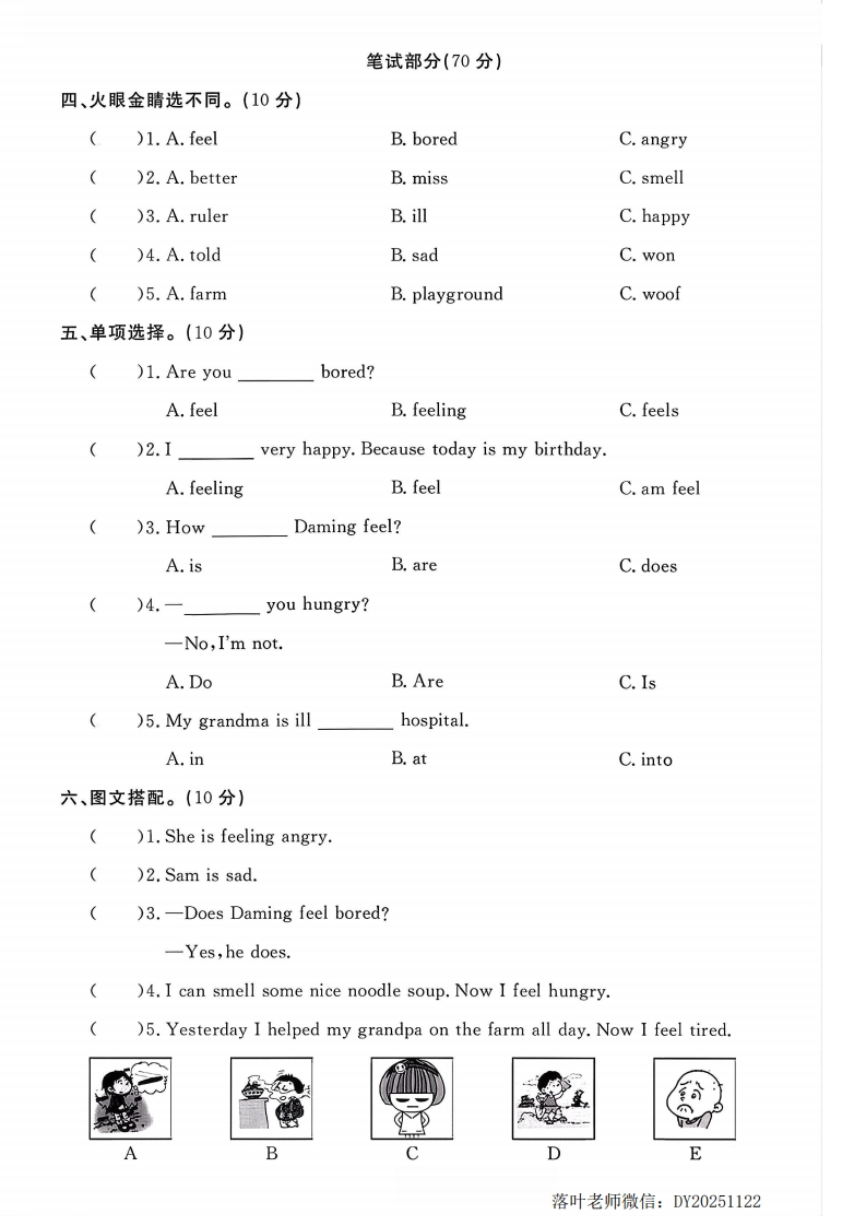 2025外研版五年级英语上册单元测试卷第九单元测试卷(检测时间:60分钟满分:100分)露题序三四五六七八九十总分得分听力部分(30分)密一、听录音,选出你所听到的单词或词组。(10分)】)1.A.feelB.illC.bill毁封)2.A.badB.sadC.bored线)3.A.tellB.toldC.tired内)4.A.argueB.angryC.and)5.A.fullB.farmC.fall蜜不二、听录音,判断下列图片是(T)否(F)正确。(10分)要答2.3.(4.(5.(靠题三、听录音,根据所听到的问句选择合适的答语。(10分)】)1.A.Yes,I am.B.Yes,I do.C.Yes,I did.()2.A.Yes,he is.B.Yes,she is.C.Yes,she does.()3.A.No,he doesn't.B.No,he isn't.C.No,she doesn't.☒()4.A.She is Lingling.B.Lingling is ill.C.She feels happy.)5.A.I'm sad.B.My grandma is ill.C.Oh,I'm so sorry!落叶老师微信:DY20251122
