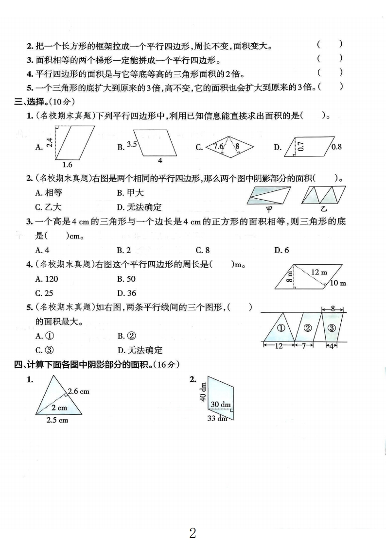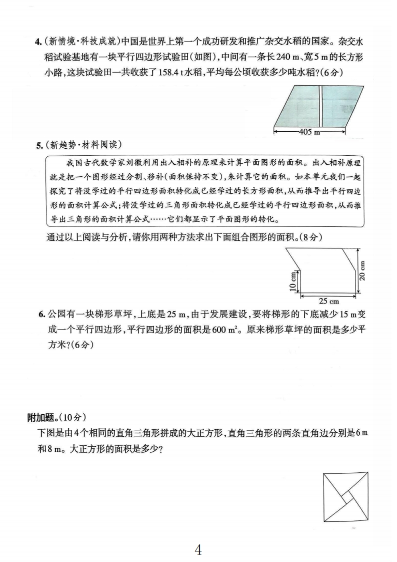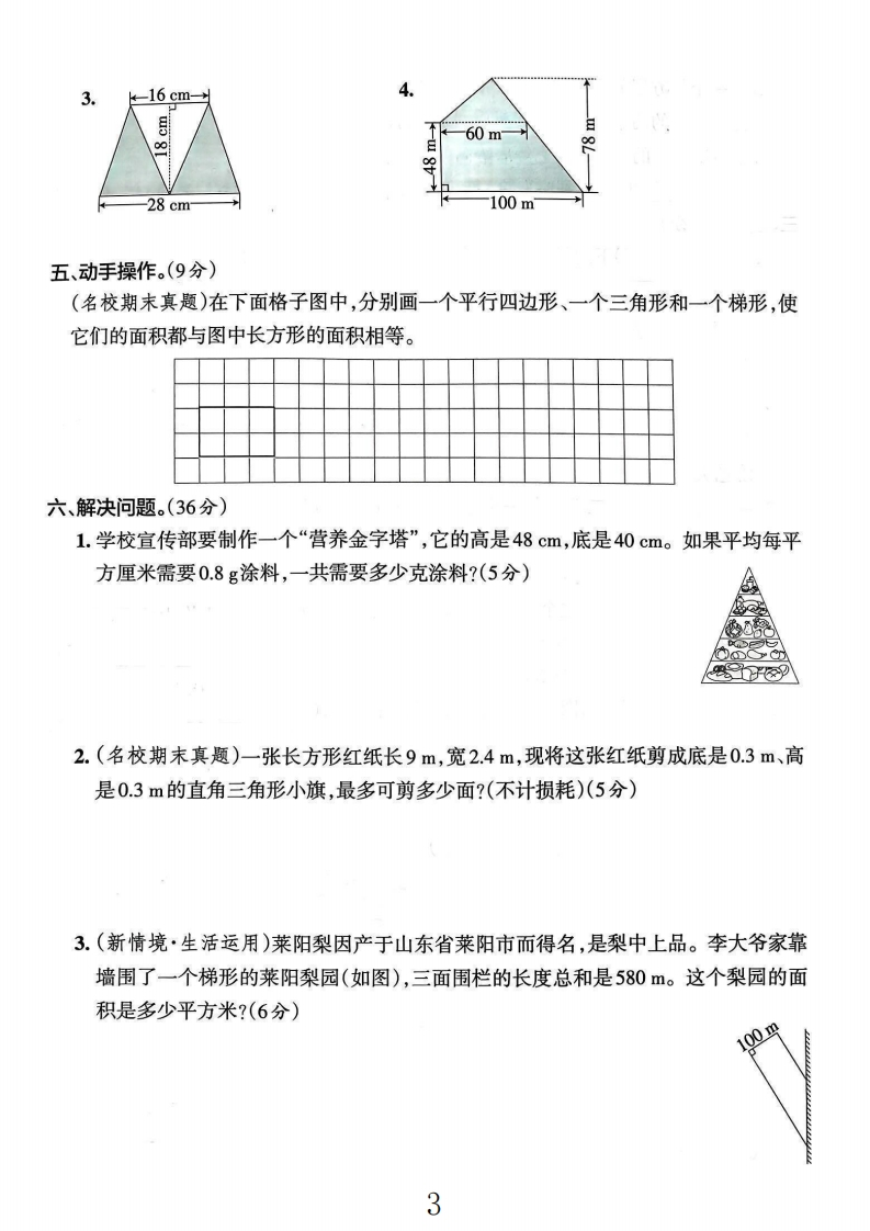 2025人教版五年级数学上册第六单元测试卷第六单元测试卷检测时间:90分钟满分:100分+10分题序二三四五六附加题总分等级得分一、填空。(每空2分,共24分)》1.(名校期末真题)一个平行四边形的底是3cm,高是8cm,面积是()cm2,和它等底等高的三角形的面积是()cm2。2.一个三角形的底是10m,是它对应的高的2倍,它的面积是()m2。3.每个小方格的面积是1cm2,请你计算或估算下面方格中图形的面积。k-3 dm)cm2约()cm2-5 dm-第3题图第5题图4.一个梯形的面积是14m2,高是4m,上底是2.5m,下底是()mo5.一个梯形的上底是3dm,下底是5dm,高是4dm,在里面画一个最大的三角形(如上图中阴影部分),这个三角形的面积是()dm2。6.(名校期末真题)右图是由6个面积是1cm的正方形组成的,三角形A、B、C的面积和是()cm2。B7.(名校期末真题)一个梯形的下底是12cm,把上底缩短6cm,恰好变成一个面积是48cm2的三角形,这个梯形的面积是()cm2。8.(名校期末真题)一个直角三角形,它的两条直角边的长分别为6dm、8dm,斜边为10dm。这个三角形的面积是()dm2,斜边上的高是()dm。9.(新情境·社会热点)红梅小学组织学生在多媒体教室观看“天宫课堂”,教室的座位分布从上面看是一个梯形,最前排有9个座位,最后一排有18个座位,且后一排总比前一排多一个座位,这个多媒体教室一共有()个座位。二、判断。(5分)1.平行四边形的底越长,它的面积就越大。1