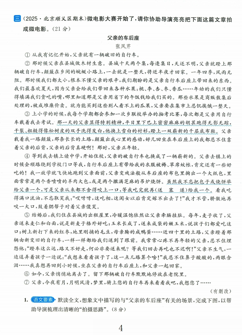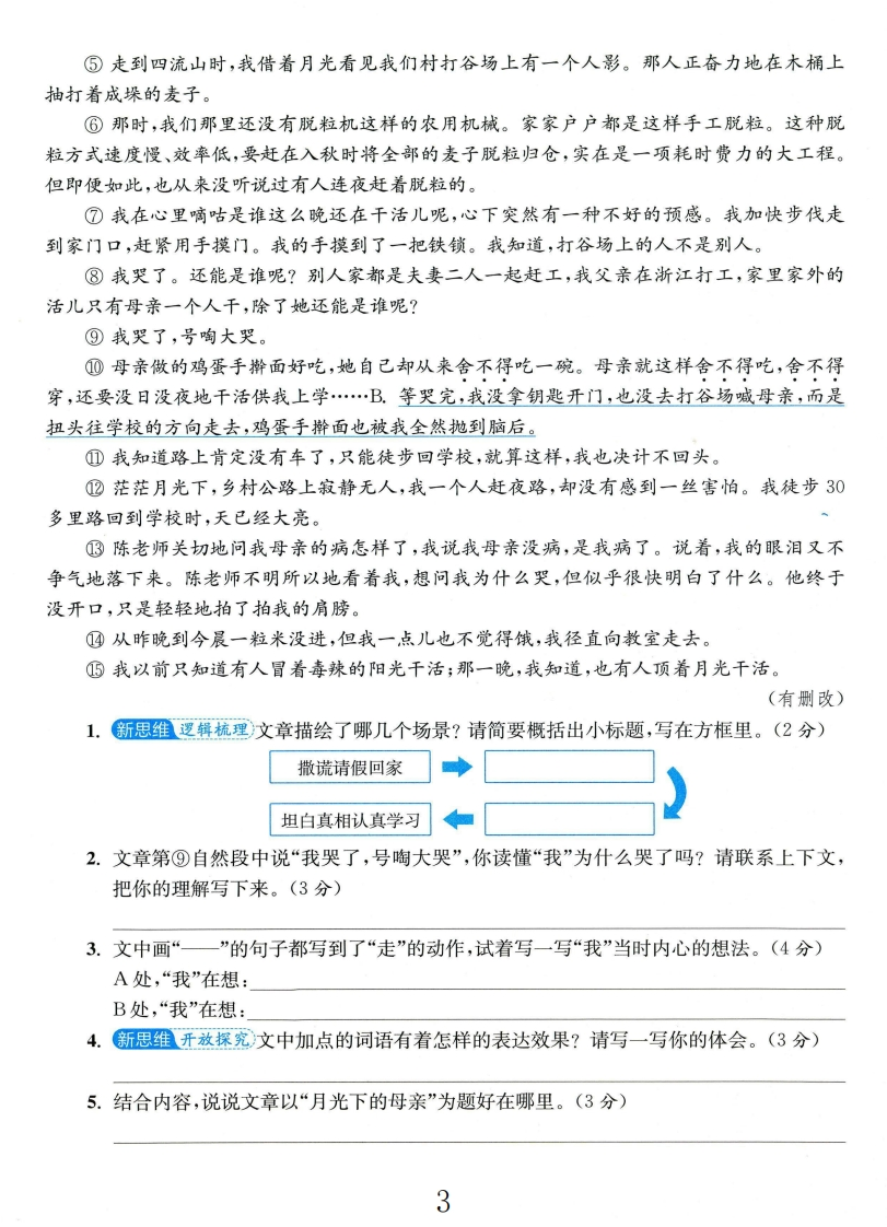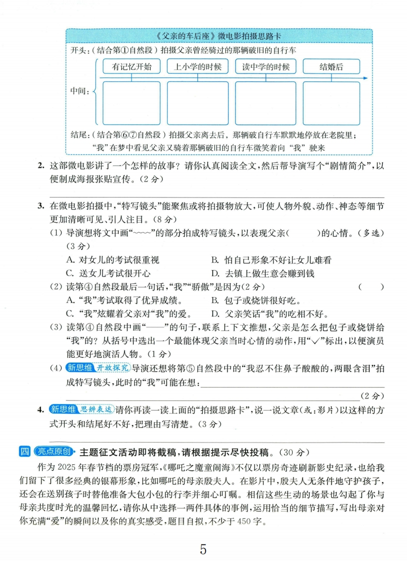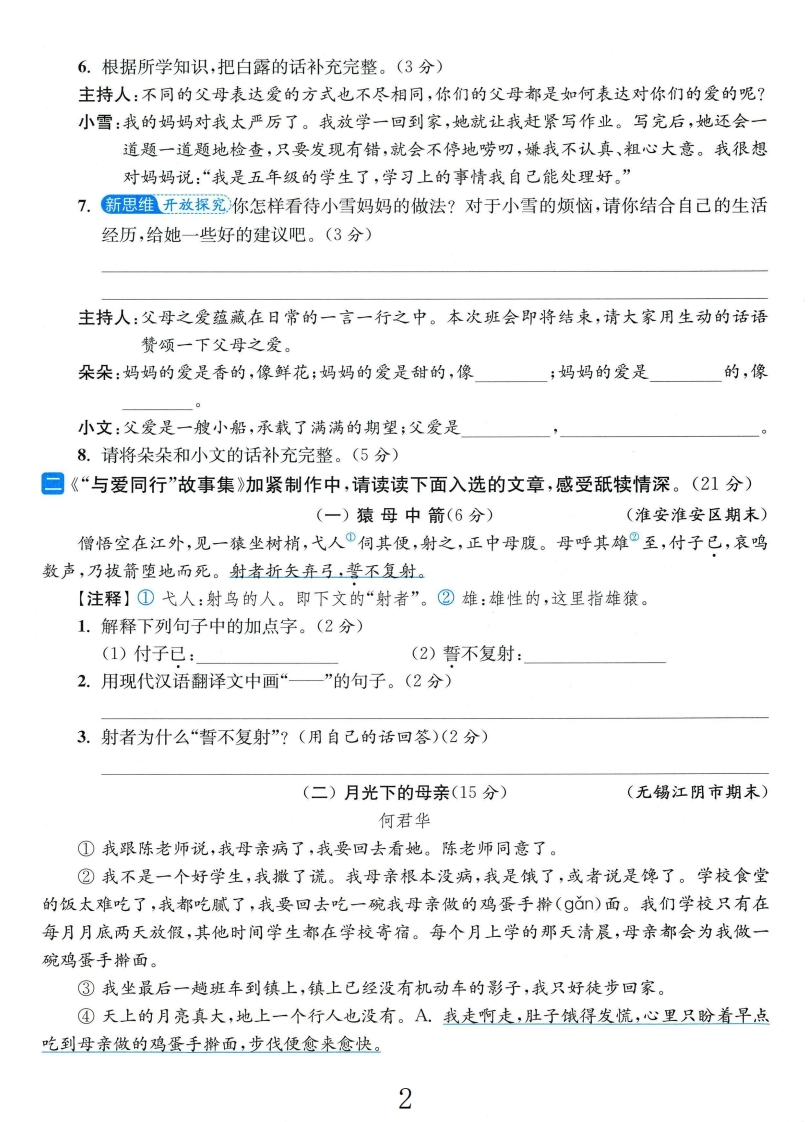 2025五年级语文上册第六单元测试卷第六单元测试卷时间:90分钟满分:100分母爱似海,父爱如山。给力小学五年级(1)班正在开展以“感恩父母,与爱同行”为主题的系列活动,请你参与其中。新趋势情境实践主题班会进行时,请与大家一起加深对父母之爱的理解吧。(28分)主持人:kùshu yan xià(),一碗冰tdng()莲子汤送来了她的关怀;夜晚zhěn()边,一个个故事饱含着她的温情。孩子学走路跌倒时,他yāy()着心中的bdrěn();孩子生病时,一向坚强的他眼中满是xin teng()。敬爱的老师,亲爱的同学,下午好!“感恩父母,与爱同行”主题班会现在开始!1.根据拼音,将主持人的话补充完整。(6分)主持人:同学们,你们觉得母爱或父爱是什么呢?点点:梁晓声的母亲在颓败又充满噪声的厂房里辛苦挣钱供孩子读书,这就是母爱。丽丽:吴冠中的父亲自己不肯花一分冤枉钱,却想加钱为儿子换房间。他()理解儿子想要玩意儿的心思,()为儿子糊了一个万花筒。这就是父爱。2.点点和丽丽有几个字的读音没说准,请你告诉她们加点字的正确读音。(3分)颓败(噪声(冤枉(3.在丽丽话中的括号里填人恰当的关联词。(2分)4.“冤枉”的意思有:①受到不公平的待遇,被加上不应有的罪名;②使无罪者有罪,没有事实根据,给人加上恶名;③不值得,吃亏。在丽丽的话中,“冤枉”的意思是(填序号)。根据“冤枉”的其他意思,任选其一,写一个句子:(3分)主持人:同学们说的都是从课本中感受到的母爱和父爱。相信你们在自己的日常生活中也有所体会,请你们分享一下自己与父母之间爱的场景吧!小满:那次我和妈妈因为一件小事吵了架。当我回到家里时,狭小的卧室里安静极了。妈妈坐在床边,对着窗户无声地哭泣着。那一天,我第一次发现,原来妈妈也很脆弱,她也需要被理解…那一天,我第一次觉得自己应该长大了。5.在你的成长中有没有类似的“第一次”?请你也试着写一段话,将当时的场景和自己的真情实感写下来。(3分)白露:有一次,正当我准备将不喜欢吃的莱挑出来扔掉时,妈妈对我说:“;半丝半缕,。’粮食来之不易,不能浪费。”1