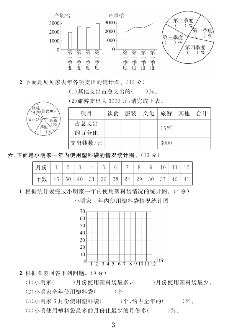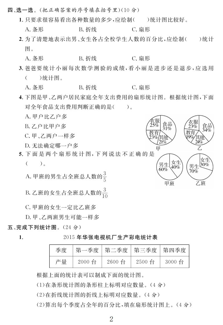 2025年数学六年级上册第五单元测试卷第五单元测试卷检测时间:90分钟满分:100分+5分题号二三四五六七八总分得分一、卷面书写。(5分)请同学们在答题时认真书写,做到规范、端正、美观,让你的试卷拥有一张清秀、漂亮的面孔!二、填一填。(每空1分,共12分)1.常见的统计图有()、()和()。其中()统计图便于看出数据的多少,()统计图便于看出数据的变化趋势,()统计图便于看出整体与部分的关系。2.小强同学绘制的条形统计图上,如果用3厘米表示75千克,那么5厘米表示)千克,()厘米表示175千克。3.医护人员要统计一个病人一昼夜的体温变化情况,应绘制()统计图。4.小红最喜欢吃水果了,下面是她根据去年妈妈买的三种水果制成的扇形统计图。看图填空。(1)妈妈去年所买的荔枝是苹果的了,是香蕉的荔枝苹果25%)9三、判断。(对的打“/”,错的打“X”)(10分)1.用统计图表示有关数量之间的关系,比统计表更加形象具体。2.当统计的数据较多时,可以分段整理。3.为了清楚地表示某地区每年每月平均气温的变化情况,用条形统计图更合适。4.在制作扇形统计图时,总的数量越多,所画的圆就越大。)5.要比较两组同学的身高情况,只能比较平均数。()1
