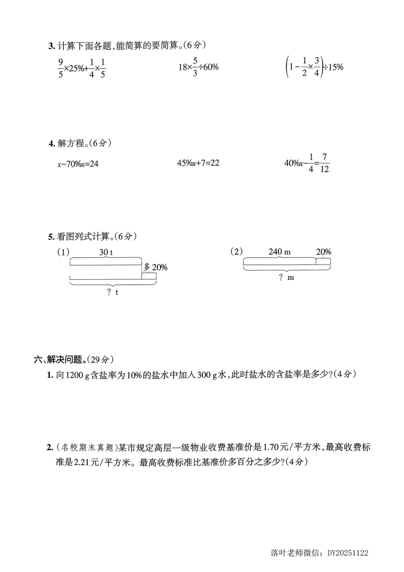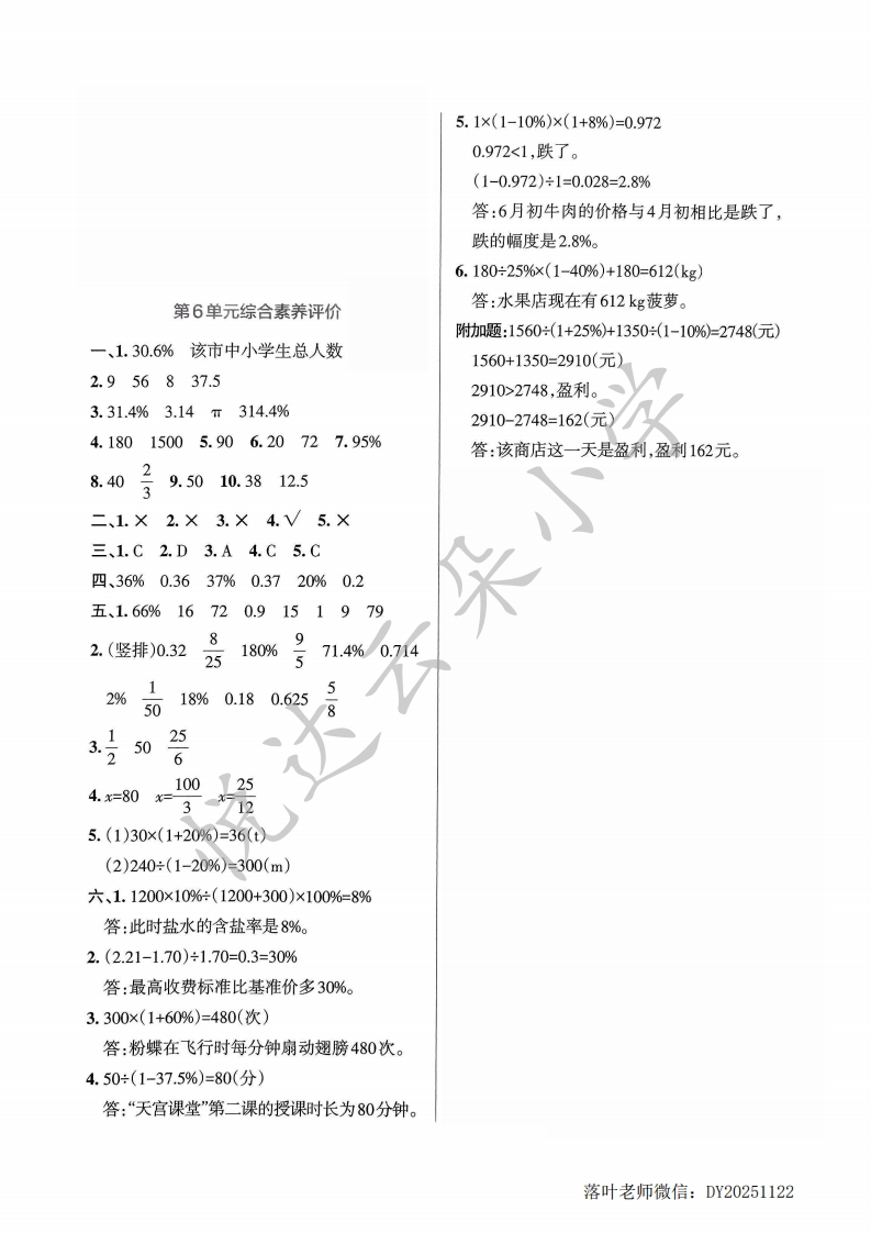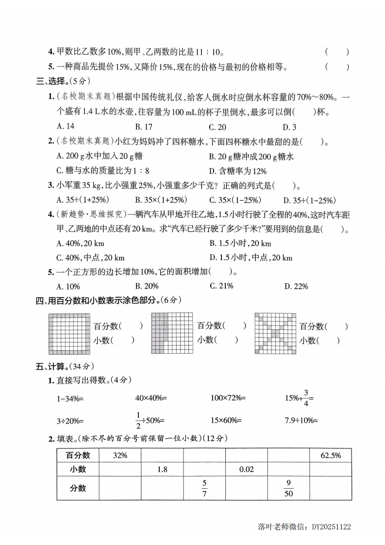 2025-2026学年人教版六年级上册数学综合素养评价第六单元综合素养评价时间:60分钟满分:100+10分题序三四五六附加题总分等级得分孙一、填空。(每空1分,共21分)1.(名校期未真题)据调查显示,某市中小学生近视率已达到百分之三十点六,这个数写作(),在这里是把()看成单位“1”。2.(名校期末真题)(21)24)3:)=0.375=()%3.把3.14,π,314.4%,31.4%按从小到大的顺序排列是()<()<()<毁长()。4.(教材改编)一种大豆的出油率是30%,600kg大豆可以榨油()kg;要榨450kg油,需要大豆()kg。5.(新情境·生活运用)小红家人均每天食盐的摄入量比世界卫生组织建议的最高摄入区量少10%,小红家人均每天食盐的摄人量是世界卫生组织建议最高摄人量的()%。6.80m的25%是()m,比60t多20%是()t。7.六(1)班同学今天到校38人,2人请假,今天六(1)班同学的出勤率是()。爵骆8.甲、乙两数的比是3:5,甲数比乙数少()%,乙数比甲数多9.(新趋势·学科融合)北宋哲学家邵雍创作的一首数字诗:“一去二三里,烟村四五家。亭台六七座,八九十枝花。”诗中数字的个数占全诗总字数的()%。10.(新趋势·学科融合)科学课上,各小组同学进行了种子发芽试验成果展示。第一小组有40粒种子发芽,第二小组的发芽种子数量比第一小组少5%,第二小组有()粒种子发芽;第三小组有35粒种子发芽,第三小组的发芽种子数量比第一小组少()%。二、判断。(5分)挤点1.小明的身高是1.45m,可以写成145%m。(2.一名特警战士演习时打了102颗子弹,全部命中,命中率为102%。3.(名校期末真题)在98的后面添上“%”,这个数的大小不变。落叶老师微信:DY20251122