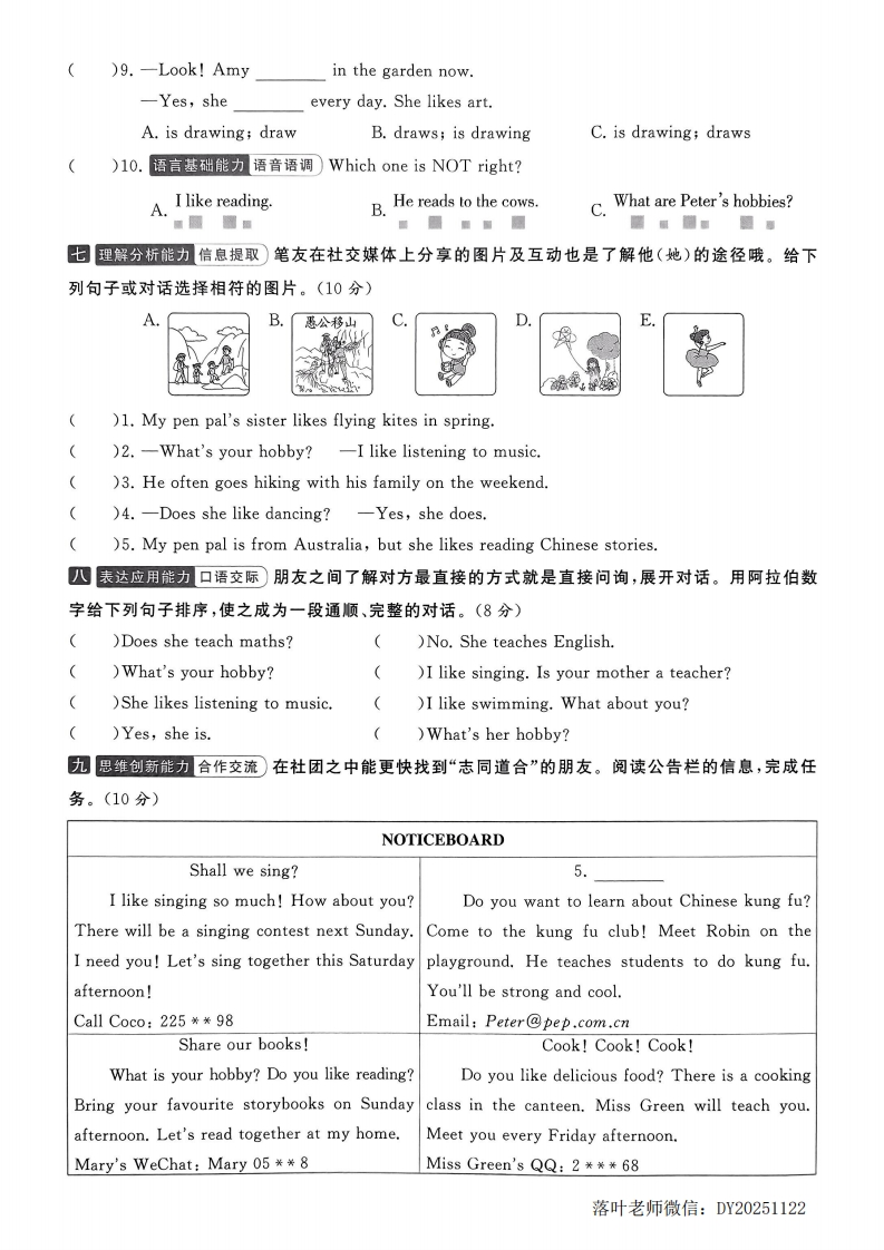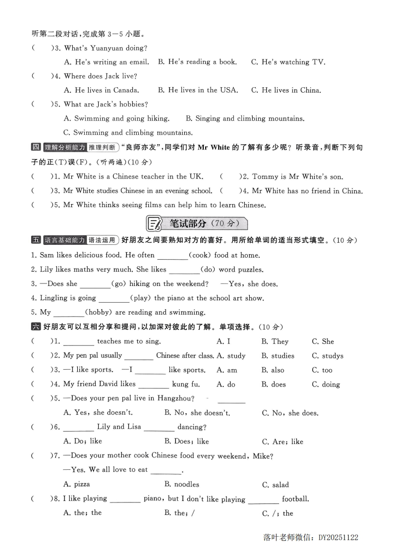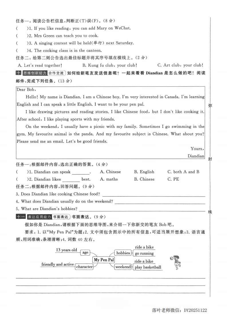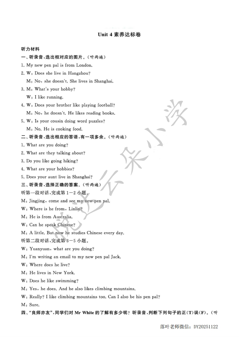 2025-2026学年人教版六年级上册英语素养达标卷Unit4素养达标卷时间:60分钟满分:100分六(2)班正在开展主题为“我的新笔友”相关征集活动,请你以观察员的身份,探索与朋友交往时的点点滴滴吧!最听力部分(30分)一理解分析能力信息提取)听录音,选出相对应的图片。(听两遍)(5分)()1.A.BC.那弥()2.AB.0000毁()3.A.B.C造封()4.AB.)5.AB日表达应用能力口语交际听录音,选出相应的答语,有一项多余。(听两遍)(5分)A.I like going hiking and cooking.B.Yes,he does.He lives in Shanghai.C.A new pen pal and his hobbies.D.I'm cooking for my family.E.No,I don't.I like going swimming.F.No,she doesn't.She lives in Hangzhou.1.2.3.4.5.目听录音,选择正确的答案。(听两遍)(10分)听第一段对话,完成第1一2小题()1.Linlin's pen pal is fromA.the USAB.AustraliaC.China)2.Linlin's pen palevery day.A.studies ChineseB.studies EnglishC.cooks Chinese food落叶老师微信:DY20251122