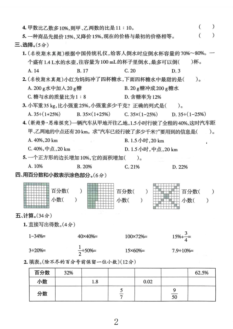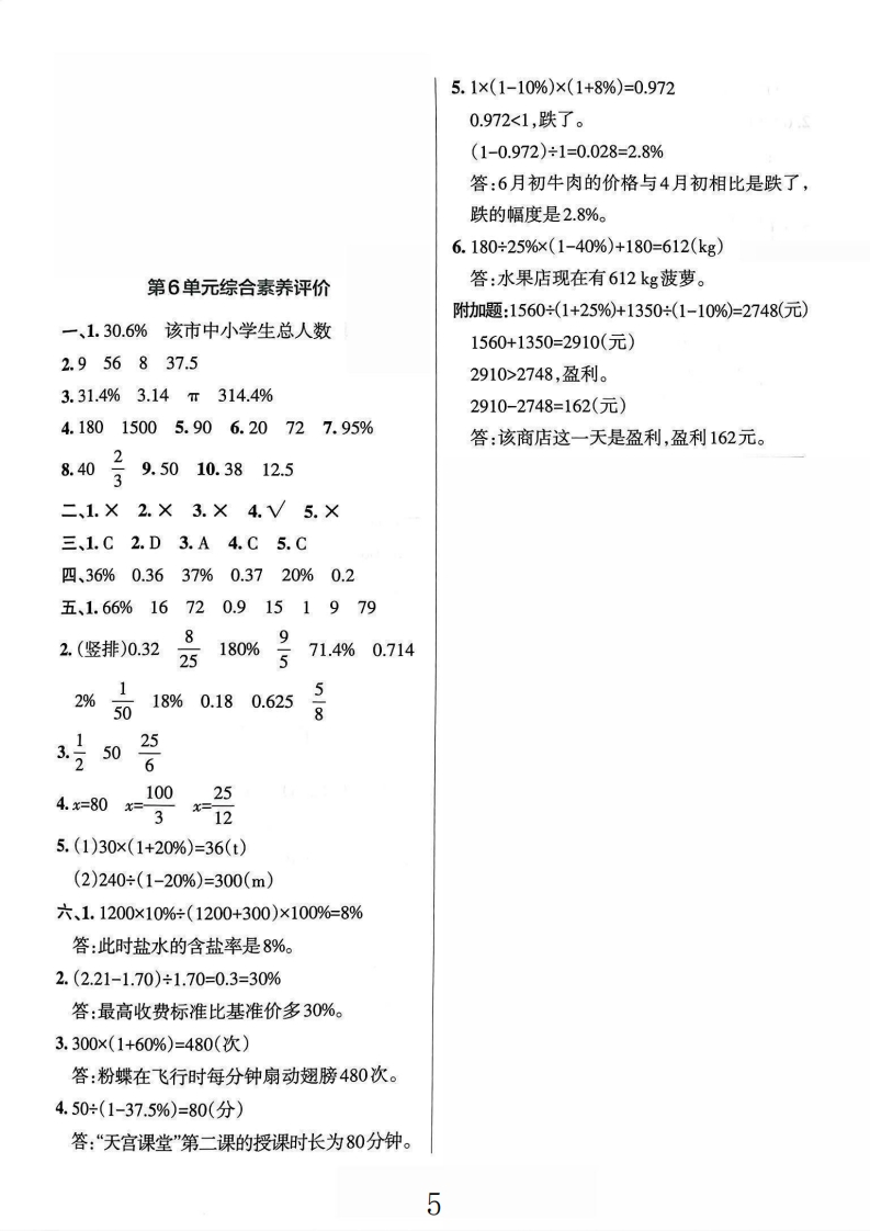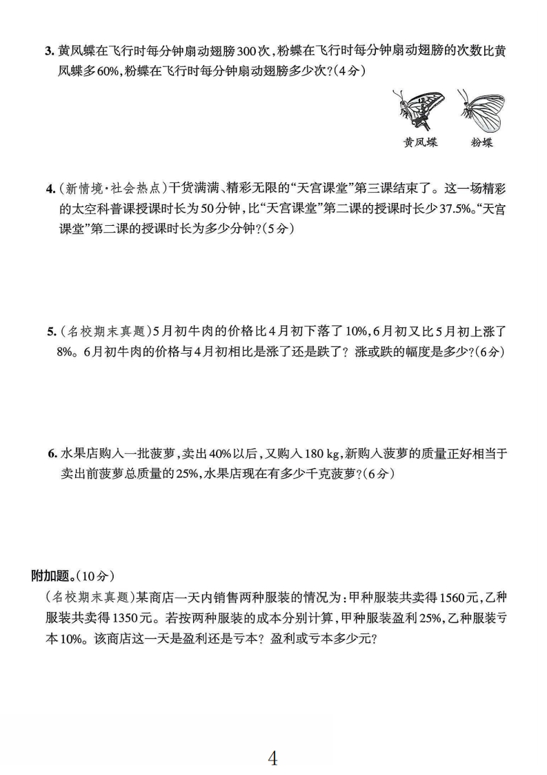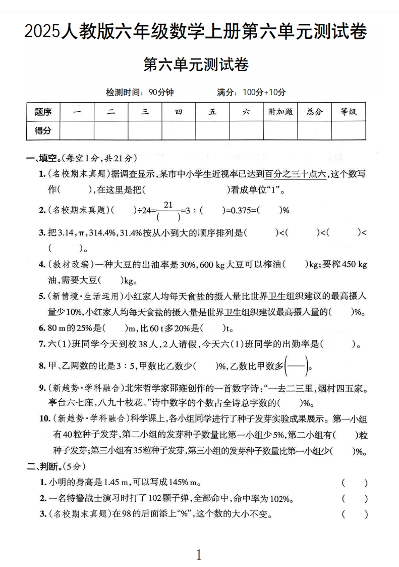 2025人教版六年级数学上册第六单元测试卷第六单元测试卷检测时间:90分钟满分:100分+10分题序三四五六附加题总分等级得分一、填空。(每空1分,共21分)1.(名校期末真题)据调查显示,某市中小学生近视率已达到百分之三十点六,这个数写作(),在这里是把()看成单位“1”。212.(名校期末真题)()24=2、=3:()=0.375=()%3.把3.14,π,314.4%,31.4%按从小到大的顺序排列是()<()<()<()。4.(教材改编)一种大豆的出油率是30%,600kg大豆可以榨油()kg;要榨450kg油,需要大豆()kgo5.(新情境·生活运用)小红家人均每天食盐的摄人量比世界卫生组织建议的最高摄人量少10%,小红家人均每天食盐的摄人量是世界卫生组织建议最高摄人量的()%6.80m的25%是()m,比60t多20%是()t。7.六(1)班同学今天到校38人,2人请假,今天六(1)班同学的出勤率是()o8.甲、乙两数的比是3:5,甲数比乙数少()%,乙数比甲数多9.(新趋势·学科融合)北宋哲学家邵雍创作的一首数字诗:“一去二三里,烟村四五家。亭台六七座,八九十枝花。”诗中数字的个数占全诗总字数的()%。10.(新趋势·学科融合)科学课上,各小组同学进行了种子发芽实验成果展示。第一小组有40粒种子发芽,第二小组的发芽种子数量比第一小组少5%,第二小组有()粒种子发芽;第三小组有35粒种子发芽,第三小组的发芽种子数量比第一小组少()%。二、判断(5分)1.小明的身高是1.45m,可以写成145%m。2.一名特警战士演习时打了102颗子弹,全部命中,命中率为102%。3.(名校期末真题)在98的后面添上“%”,这个数的大小不变。(1