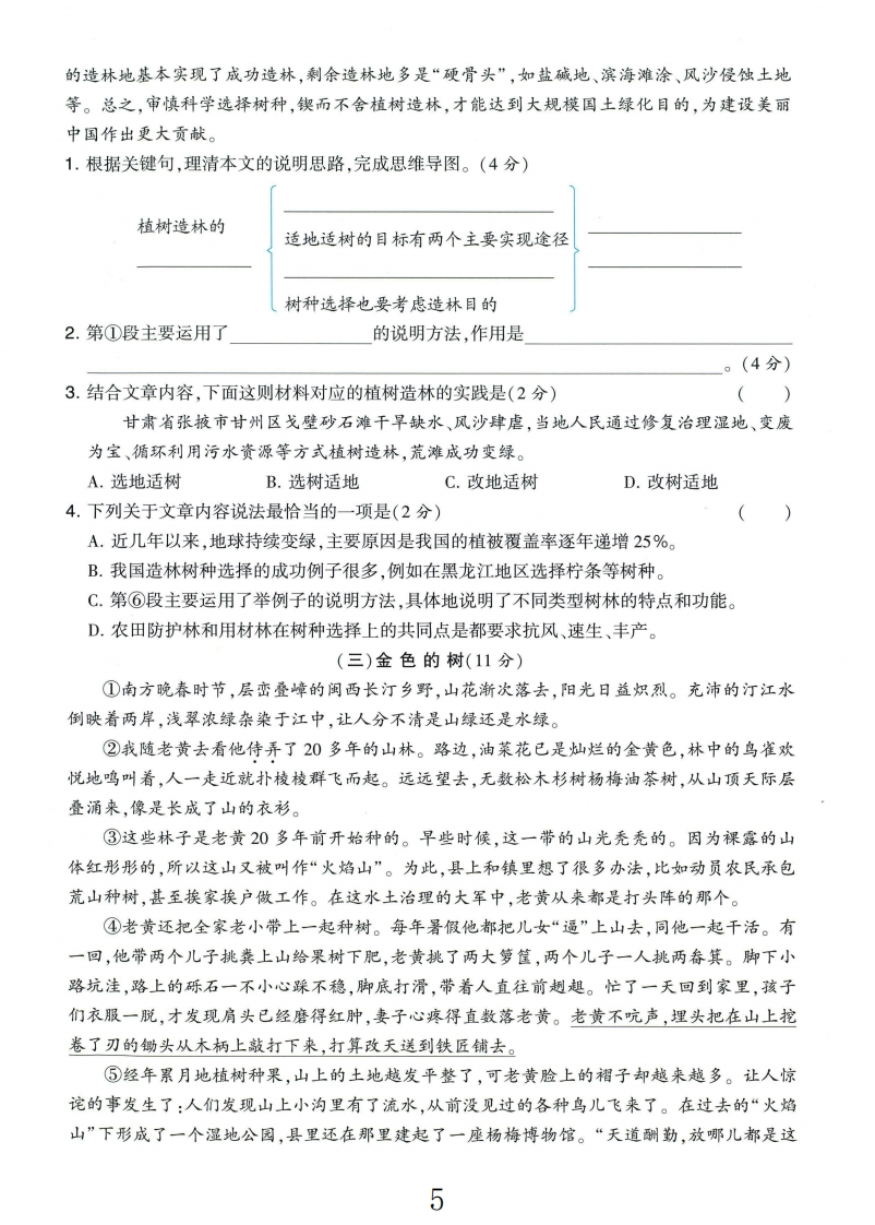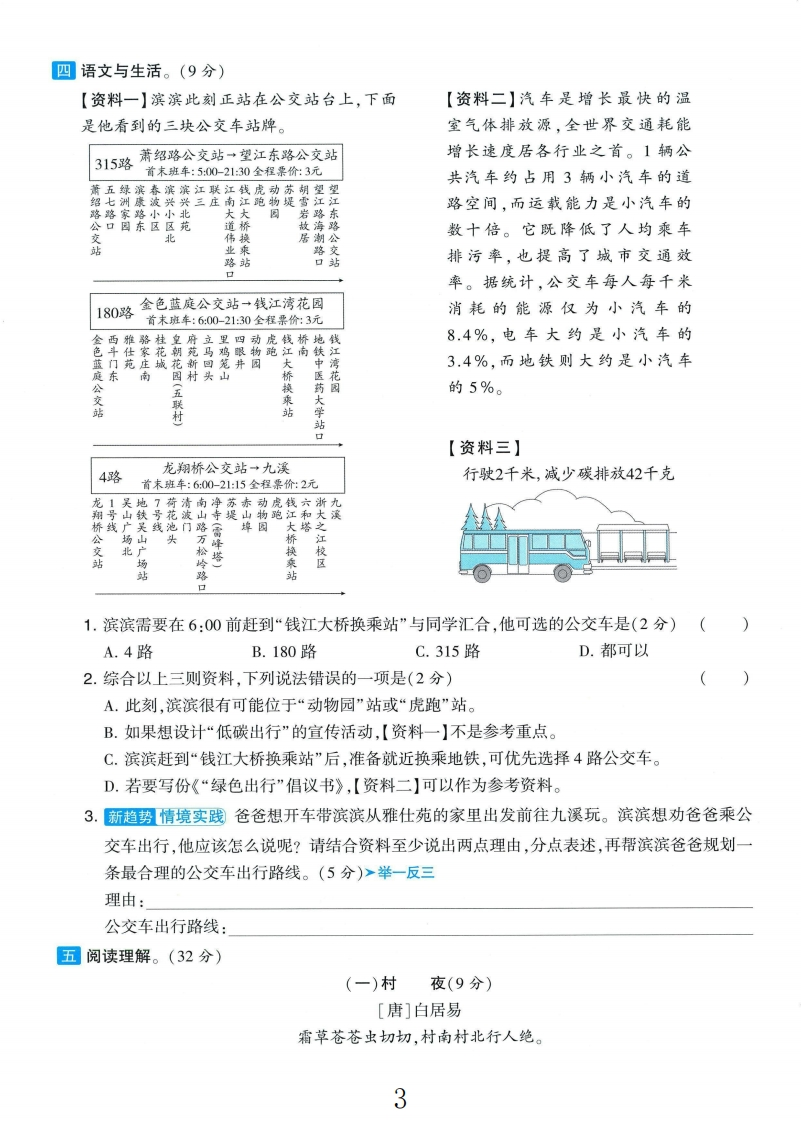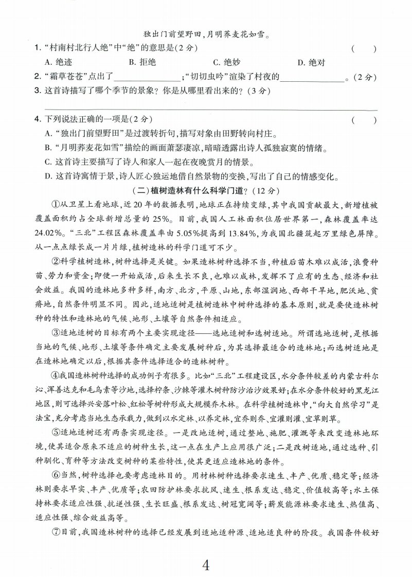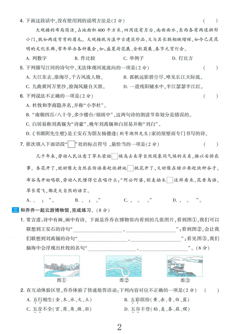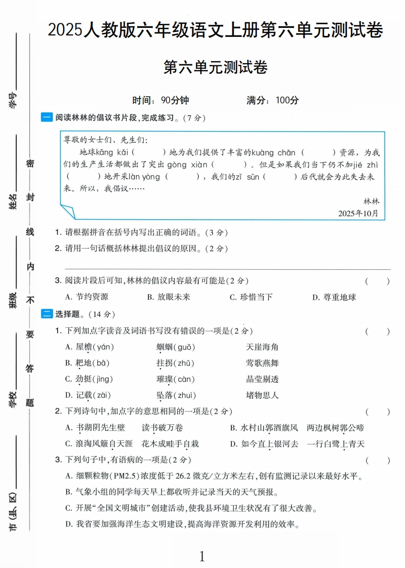 2025人教版六年级语文上册第六单元测试卷第六单元测试卷寄时间:90分钟满分:100分一阅读林林的倡议书片段,完成练习。(7分)尊敬的女士们、先生们:地球kang kai()地为我们提供了丰富的kuang chǎn()资源,为我密们的生产生活都做出了突出gòngxiàn()。但是如果我们当下仍不加jiézhi)地开采lan yong(),我们的zis0n()后代就会为此失去未来。所以,我倡议…新封林林2025年10月线1.请根据拼音在括号内写出正确的词语。(3分)2.请用一句话概括林林提出倡议的原因。(2分)内3.阅读片段后可知,林林的倡议内容最有可能是(2分)(蕾不A.节约资源B.放眼未来C.珍惜当下D.尊重地球日选择题。(14分)要1.下列加点字读音及词语书写没有错误的一项是(2分)A.屋檐(yn)蝈蝈(guō)天崖海角答B.耙地(ba)拄拐(zhǔ)莺歌燕舞C.劲挺(ing)璀璨(cdn)晶莹剔透荞D.记载(zài)坠落(zhui)堵物思人题2.下列诗句中,加点字的意思相同的一项是(2分)A.书湖阴先生壁读书破万卷B.水村山郭酒旗风两边枫树郭公啼C.浪淘风簸自天涯花木成畦手自栽D.如今直上银河去一行白鹭上青天3.下列句子中,有语病的一项是(2分)A.细颗粒物(PM2.5)浓度低于26.2微克/立方米左右,创有监测记录以来最好水平。☒B.气象小组的同学每天早上都收听并记录当天的天气预报。C.开展“全国文明城市”创建活动,使我县环境卫生状况有了很大改善。eD.我省要加强海洋生态文明建设,提高海洋资源开发利用的效率。1