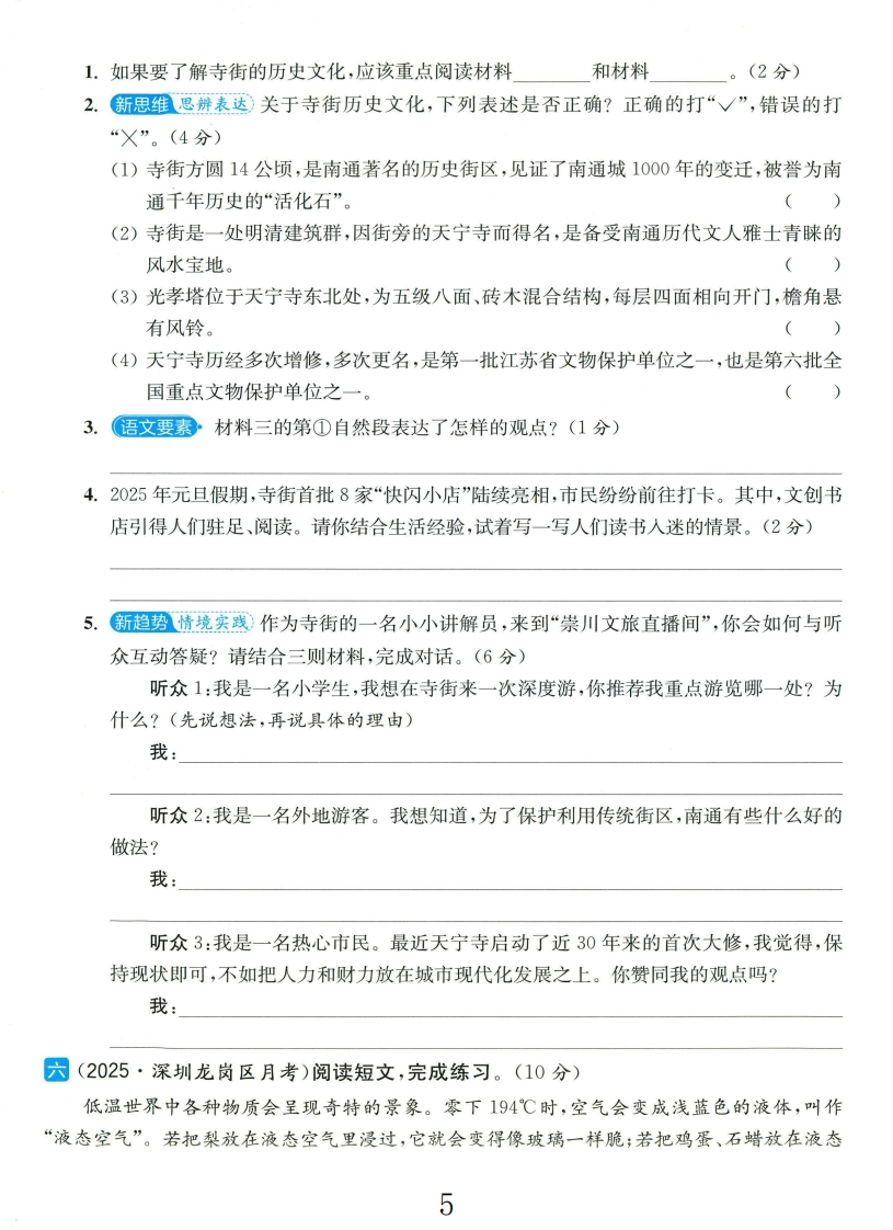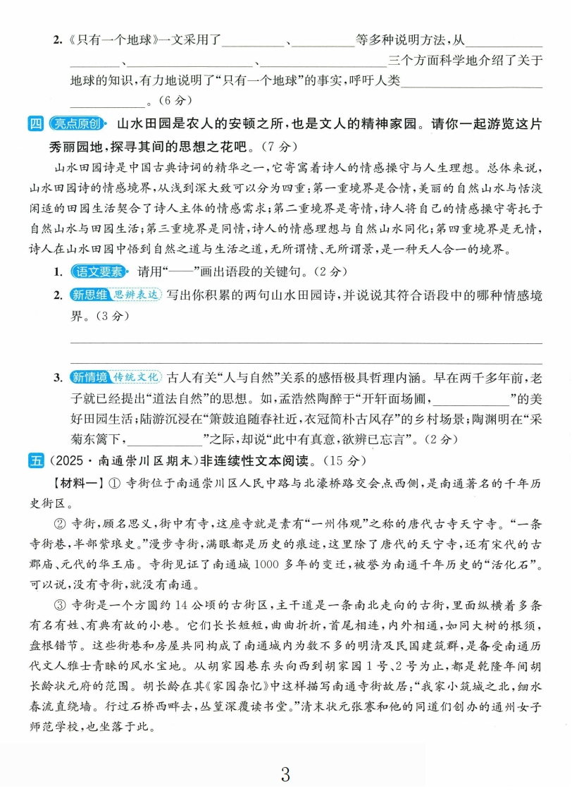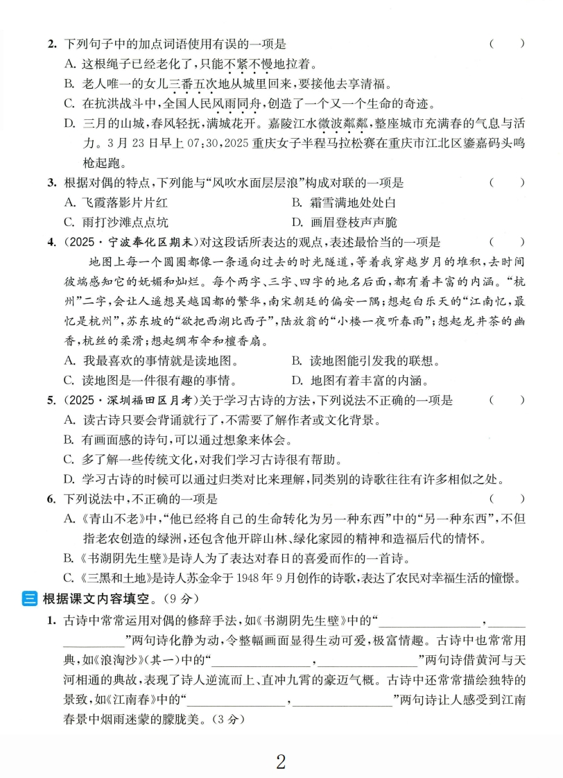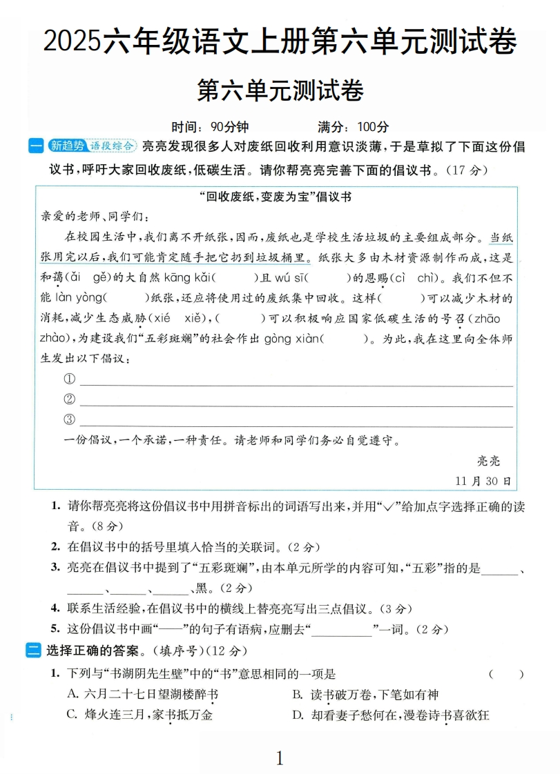 2025六年级语文上册第六单元测试卷第六单元测试卷时间:90分钟满分:100分新趋势语段综合)亮亮发现很多人对废纸回收利用意识淡薄,于是草拟了下面这份倡议书,呼吁大家回收废纸,低碳生活。请你帮亮亮完善下面的倡议书。(17分)“回收废纸,变废为宝”倡议书亲爱的老师、同学们:在校园生活中,我们离不开纸张,因而,废纸也是学校生活垃圾的主要组成部分。当纸张用完以后,我们可能肯定随手把它扔到垃圾桶里。纸张大多由木材资源制作而成,这是和蔼(igě)的大自然kang kai()且wúsi()的恩赐(ci chi)。我们不但不能Ianyòng()纸张,还应将使用过的废纸集中回收。这样()可以减少木材的消耗,减少生态威胁(x怕xě),()可以积极响应国家低碳生活的号召(zhā0zhào),为建设我们“五彩斑斓”的社会作出gòngxiàn()。为此,我在这里向全体师生发出以下倡议:①②③一份倡议,一个承诺,一种责任。请老师和同学们务必自觉遵守。亮亮11月30日1.请你帮亮亮将这份倡议书中用拼音标出的词语写出来,并用“√”给加点字选择正确的读音。(8分)2.在倡议书中的括号里填入恰当的关联词。(2分)3.亮亮在倡议书中提到了“五彩斑斓”,由本单元所学的内容可知,“五彩”指的是、黑。(2分)4.联系生活经验,在倡议书中的横线上替亮亮写出三点倡议。(3分)5.这份倡议书中画“一”的句子有语病,应删去“”一词。(2分)日选择正确的答案。(填序号)(12分)1.下列与“书湖阴先生壁”中的“书”意思相同的一项是A.六月二十七日望湖楼醉书B.读书破万卷,下笔如有神C.烽火连三月,家书抵万金D.却看妻子愁何在,漫卷诗书喜欲狂1
