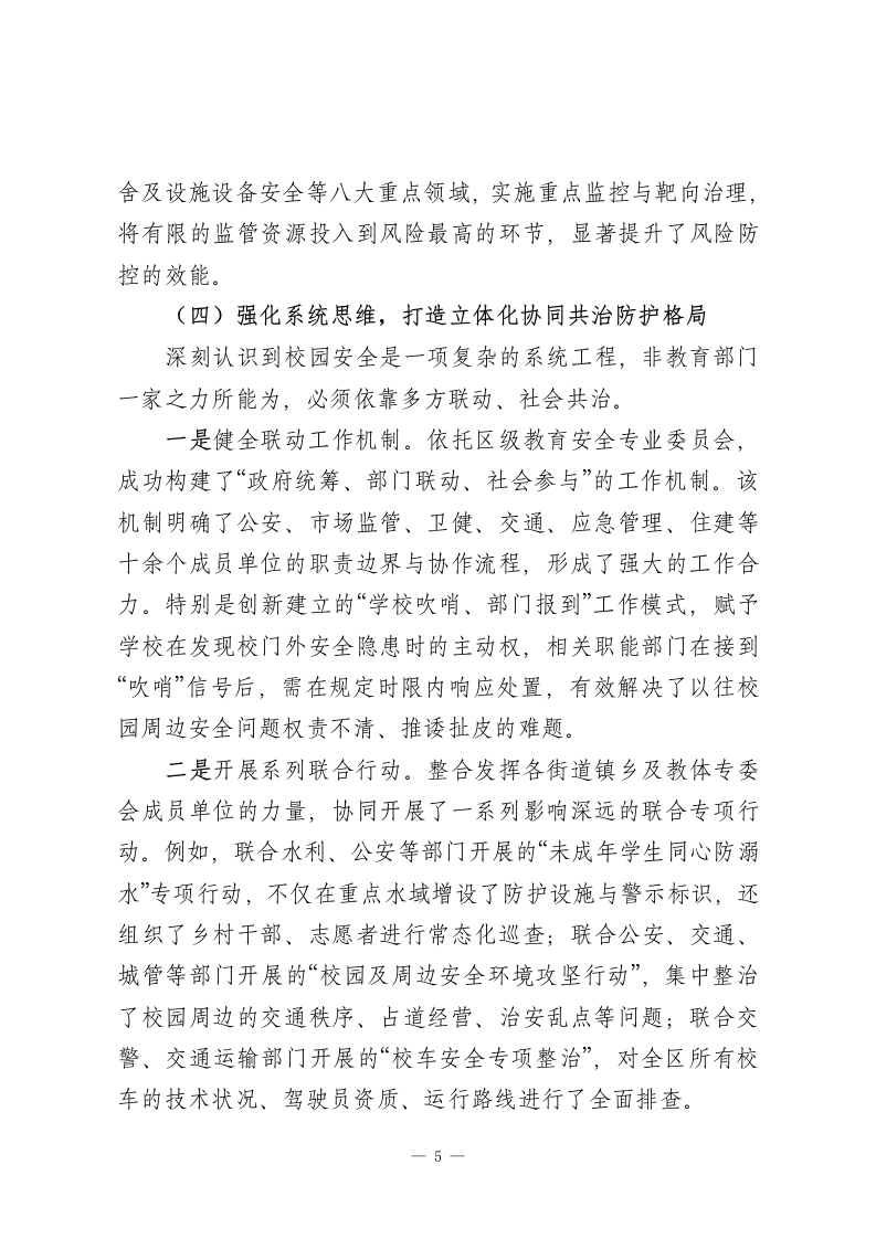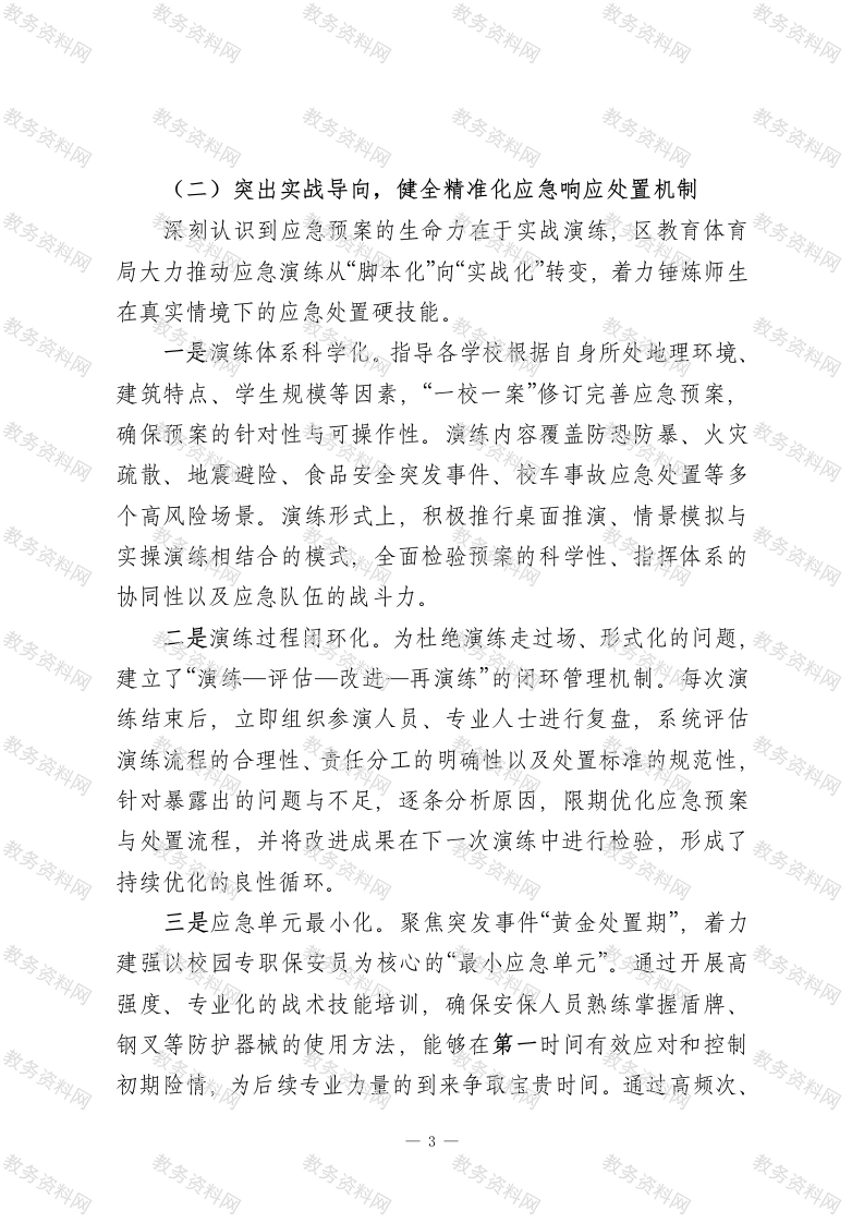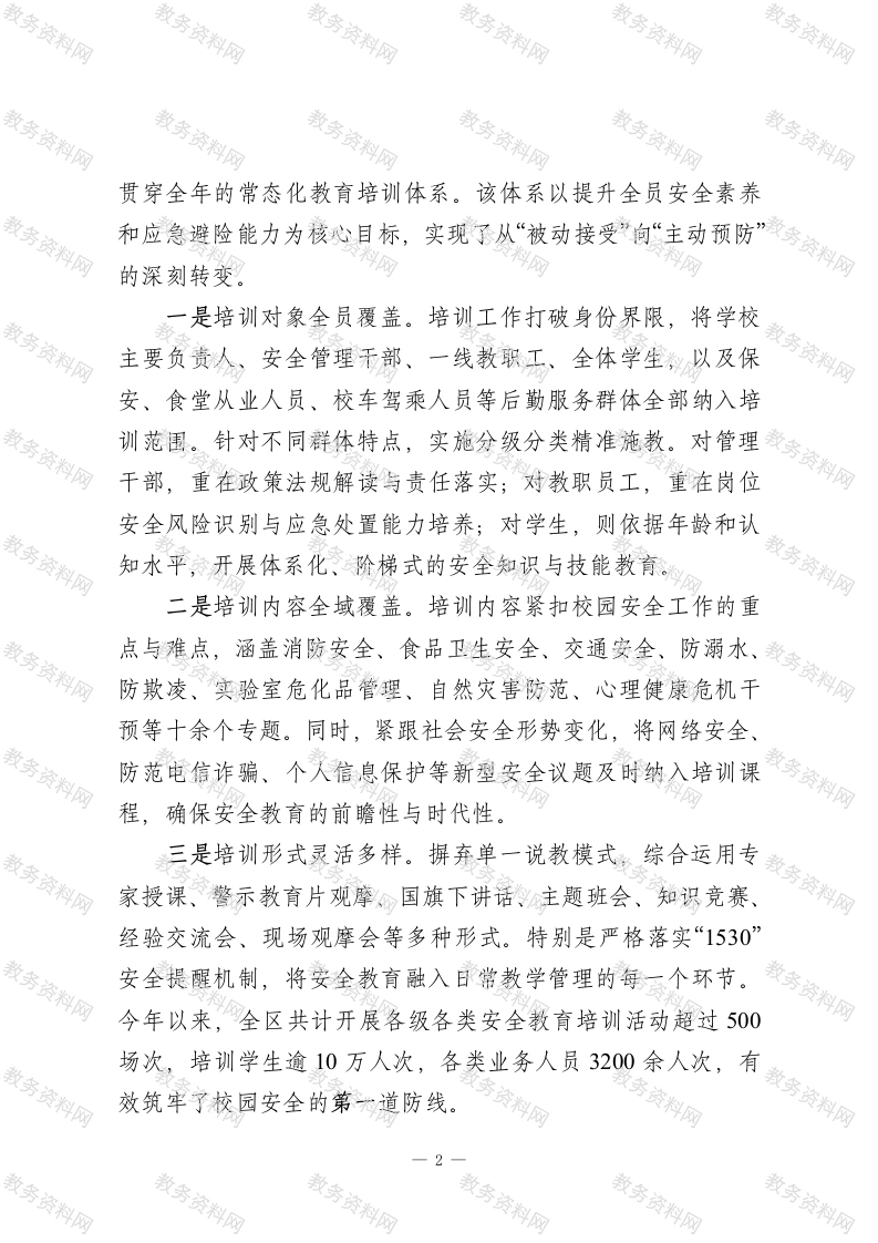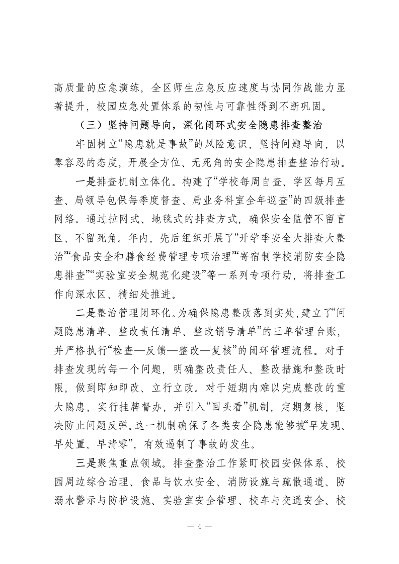 XX区教育体育局2025年度学校安全工作情况报告今年以来,XX区教育体育系统深入贯彻落实上级关于安全生产工作的系列重要指示精神,始终秉持“安全第一、预防为主、综合治理”的核心方针,将校园安全置于教育事业发展的基石位置。面对新形势下的安全挑战,全系统以“时时放心不下”的责任感,全面构建和深化安全防护体系,系统性防范化解各类风险隐患,有力保障了广大师生的生命财产安全和教育教学秩序的和谐稳定,为全区教育事业高质量发展提供了坚实的安全屏障。现将本年度工作情况报告如下。一、2025年度学校安全工作基本情况截至2025年11月,全区共管理各级各类学校及幼儿园318所,涉及在校学生约8.3万名,教职员工近8000名。面对点多、线长、面广的管理现状,区教育体育局始终将安全工作作为首要任务,坚持系统规划与精准施策相结合,本年度累计投入安全专项经费约1250万元,用于安防设施升级、智慧安防平台建设、专业人员培训及应急物资储备等关键领域,实现了安全投入与安全需求的动态匹配。通过多维发力、全域覆盖,逐步形成了一套权责明晰、运转高效、保障有力的校园安全治理新模式。(一)聚焦预防为先,构建常态化安全教育培训体系坚持将安全教育内化于心、外化于行,构建了覆盖全员、1