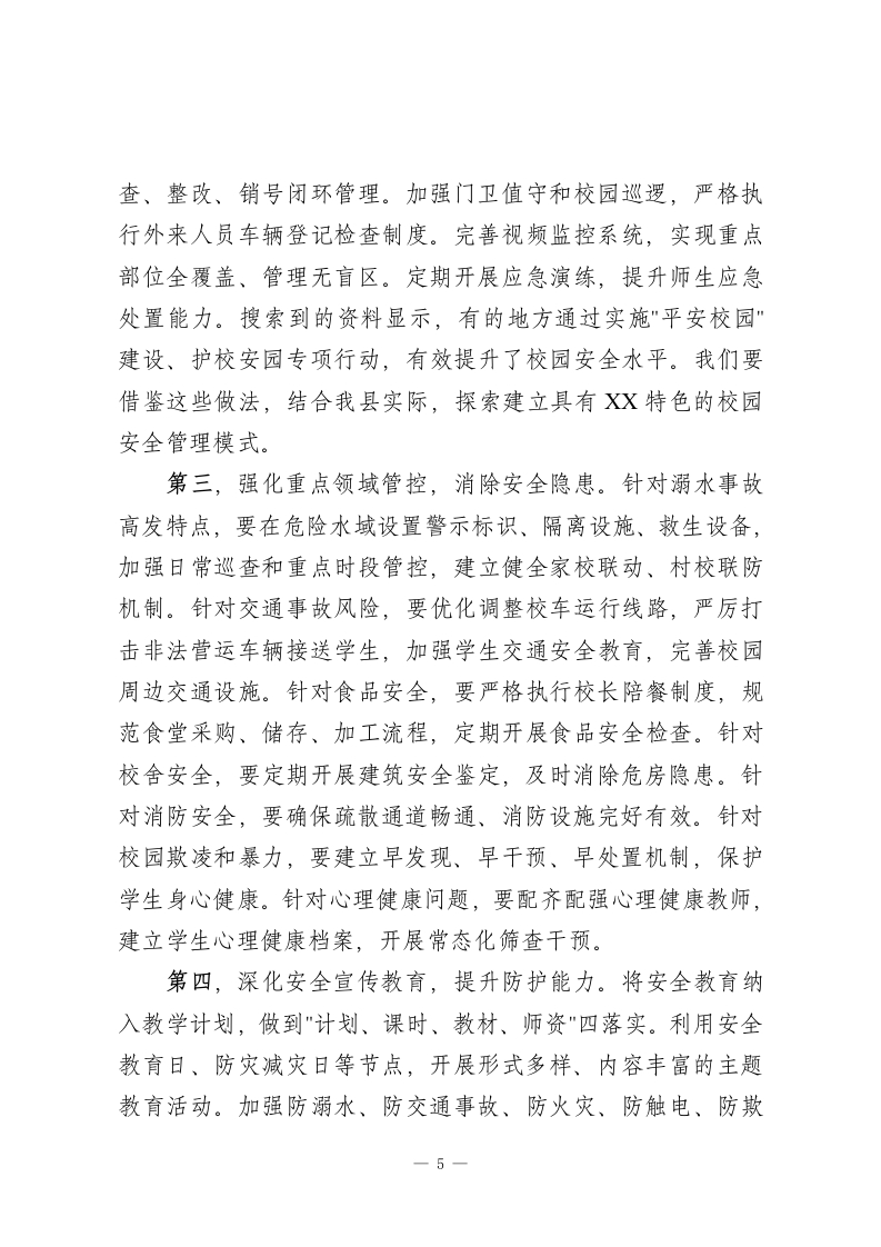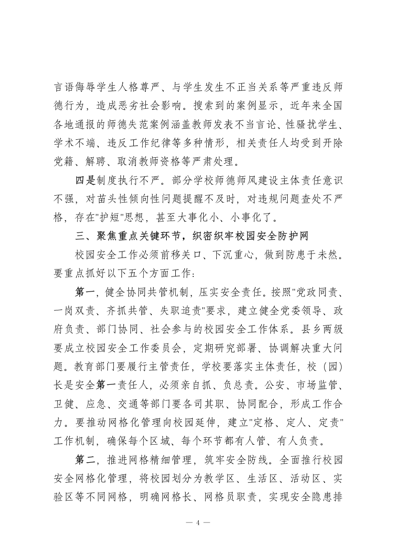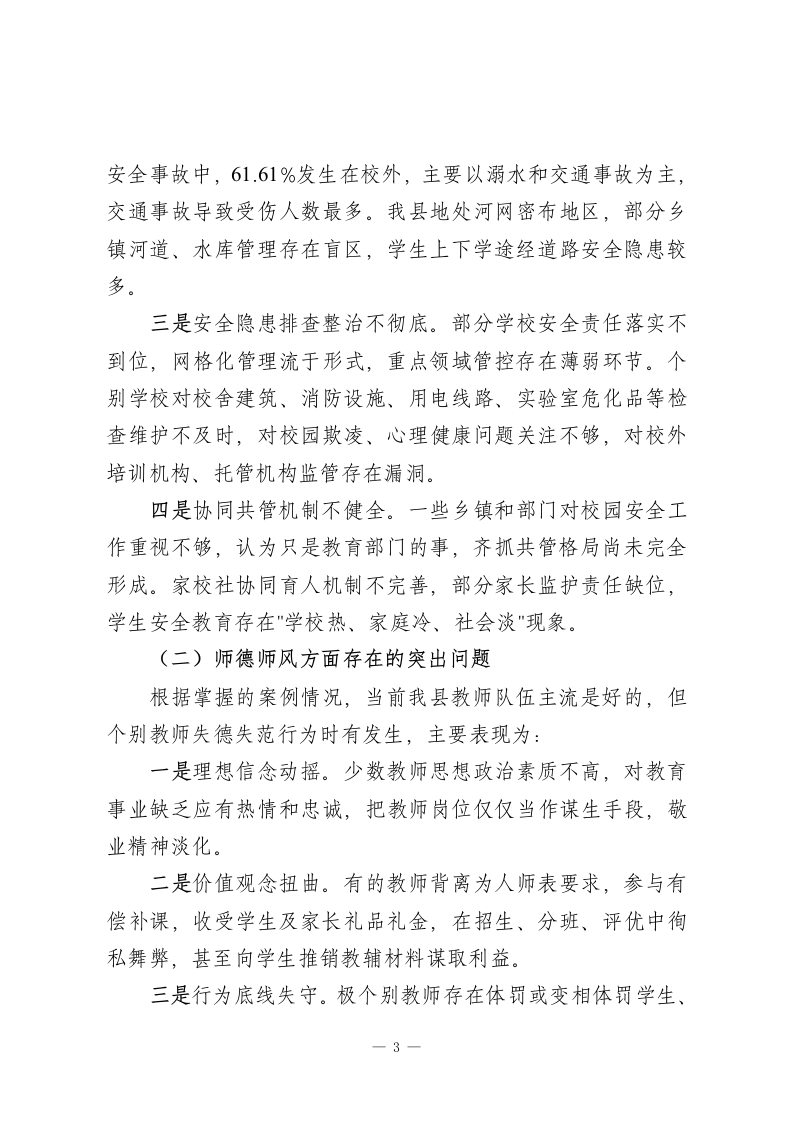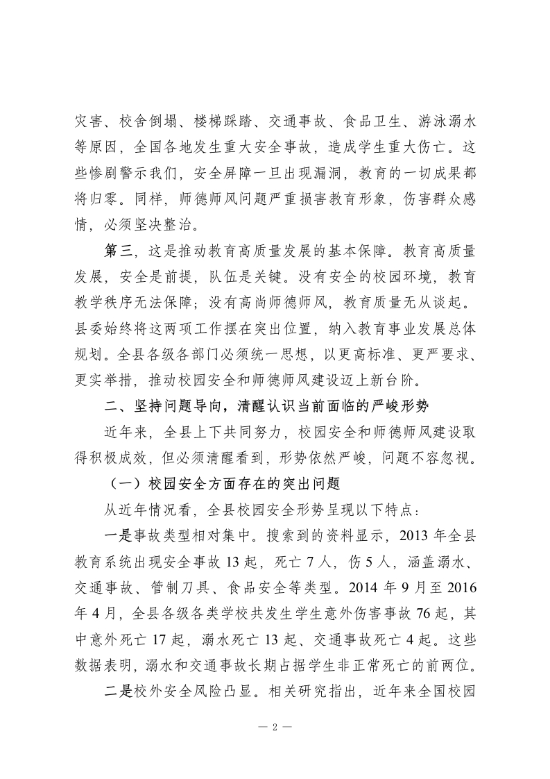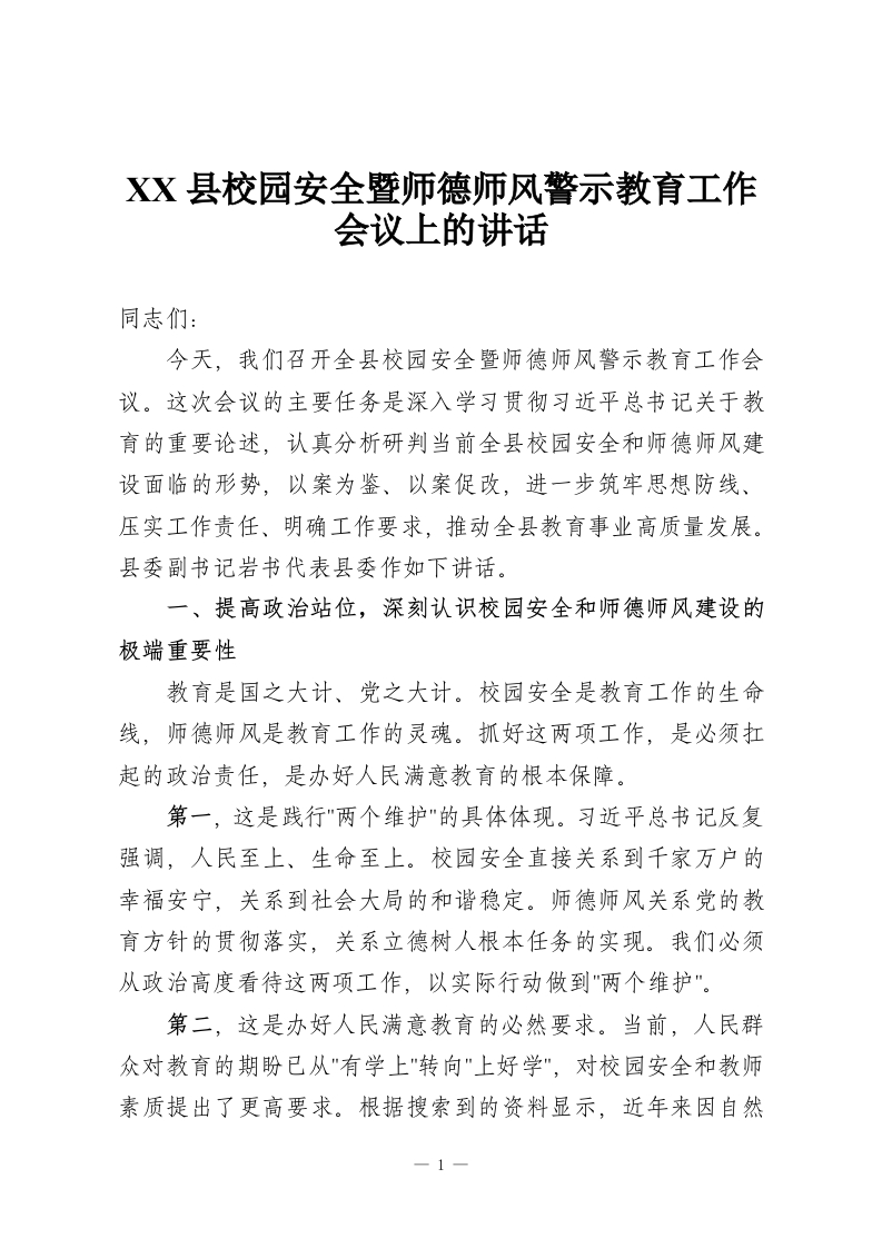 XX县校园安全暨师德师风警示教育工作会议上的讲话同志们:今天,我们召开全县校园安全暨师德师风警示教育工作会议。这次会议的主要任务是深入学习贯彻习近平总书记关于教育的重要论述,认真分析研判当前全县校园安全和师德师风建设面临的形势,以案为鉴、以案促改,进一步筑牢思想防线、压实工作责任、明确工作要求,推动全县教育事业高质量发展。县委副书记岩书代表县委作如下讲话。一、提高政治站位,深刻认识校园安全和师德师风建设的极端重要性教育是国之大计、党之大计。校园安全是教育工作的生命线,师德师风是教育工作的灵魂。抓好这两项工作,是必须扛起的政治责任,是办好人民满意教育的根本保障。第一,这是践行"两个维护"的具体体现。习近平总书记反复强调,人民至上、生命至上。校园安全直接关系到千家万户的幸福安宁,关系到社会大局的和谐稳定。师德师风关系党的教育方针的贯彻落实,关系立德树人根本任务的实现。我们必须从政治高度看待这两项工作,以实际行动做到"两个维护"。第二,这是办好人民满意教育的必然要求。当前,人民群众对教育的期盼已从"有学上"转向"上好学",对校园安全和教师素质提出了更高要求。根据搜索到的资料显示,近年来因自然1