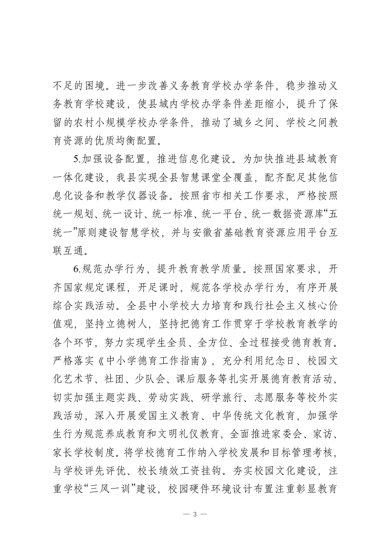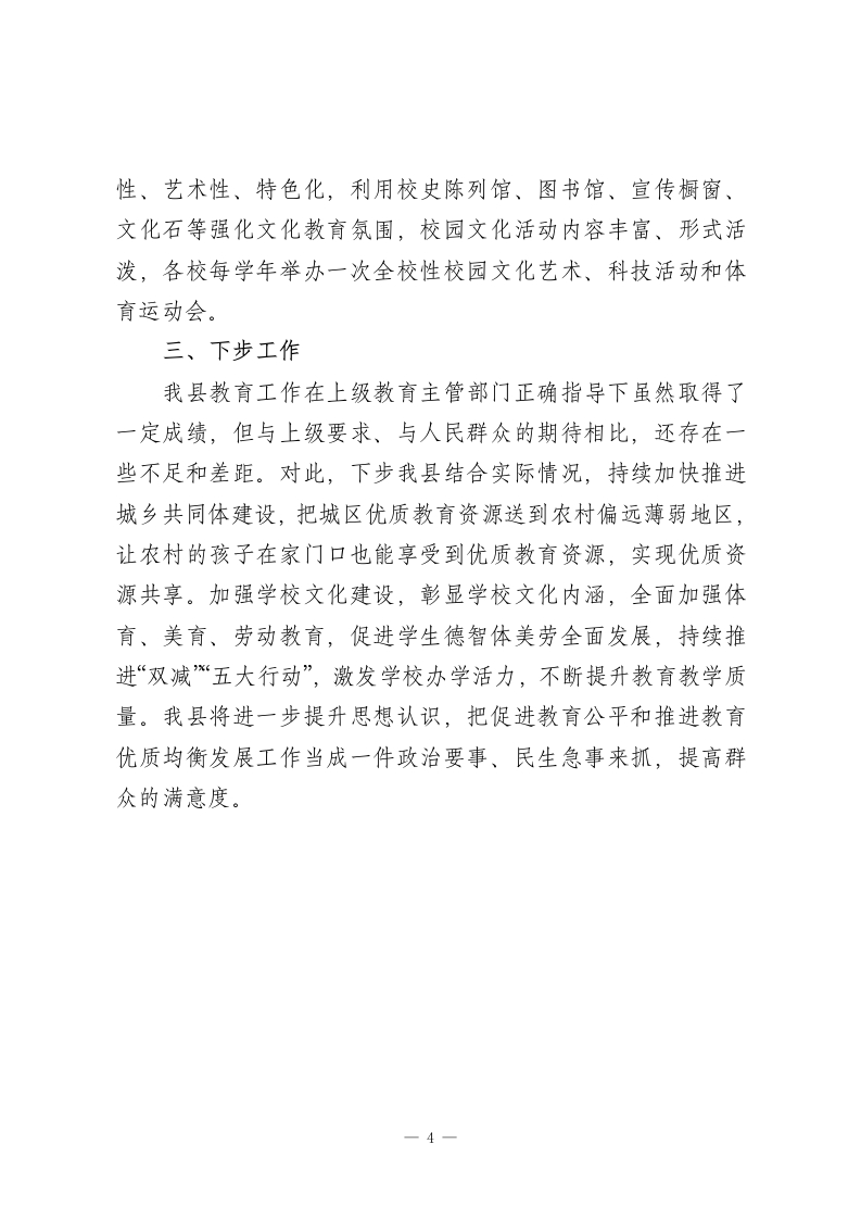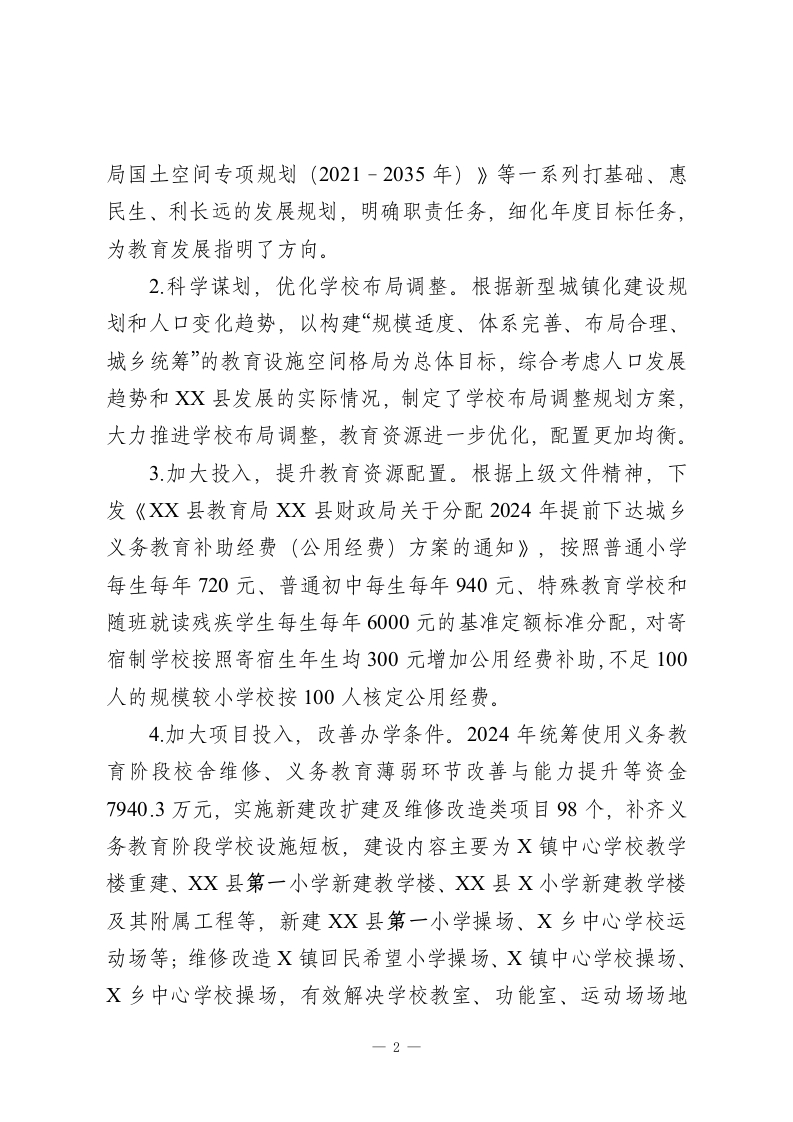 XX县义务教育优质均衡发展工作总结2024年,XX县认真贯彻落实习近平总书记关于教育工作重要讲话指示批示精神,严格执行党的教育方针,坚持以办人民满意的教育为宗旨,多措并举全力推进优质均衡发展。全县教育资源配置不断优化,优质均衡发展成效初现,教育事业保持健康发展态势。一、基本情况2017年XX县顺利通过义务教育基本均衡发展,为进一步提升县域义务教育办学水平及教育教学质量,按照省、市工作安排,XX县申报2028年接受义务教育优质均衡发展评估验收。XX县从2023年起,每年要完成20%达标学校任务,计划于2027年完成全部达标任务。二、主要做法坚持以习近平新时代中国特色社会主义思想为指导,深入贯彻落实习近平总书记关于教育的重要论述和考察安徽重要讲话精神,落实省市义务教育优质均衡发展创建部署,紧盯义务教育发展不平衡不充分等问题,从办好每一所学校和促进学生健康成长、全面发展角度出发,加快教育强县建设,满足广大人民群众对高质量教育的需求。进一步促进我县义务教育优质均衡工作,推动县域义务教育高质量发展。1提高认识,理清教育发展思路。县委、县政府制定了《XX县义务教育优质均衡发展实施方案》《XX县中小学校幼儿园布1