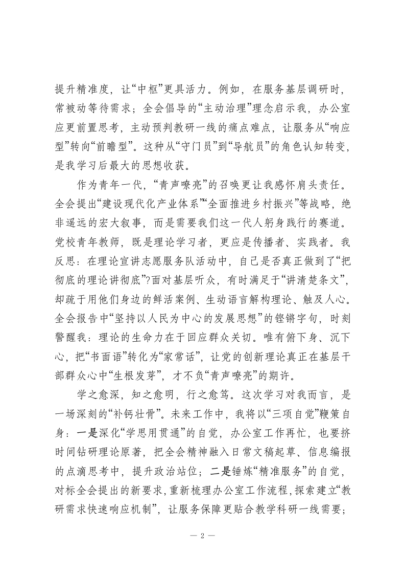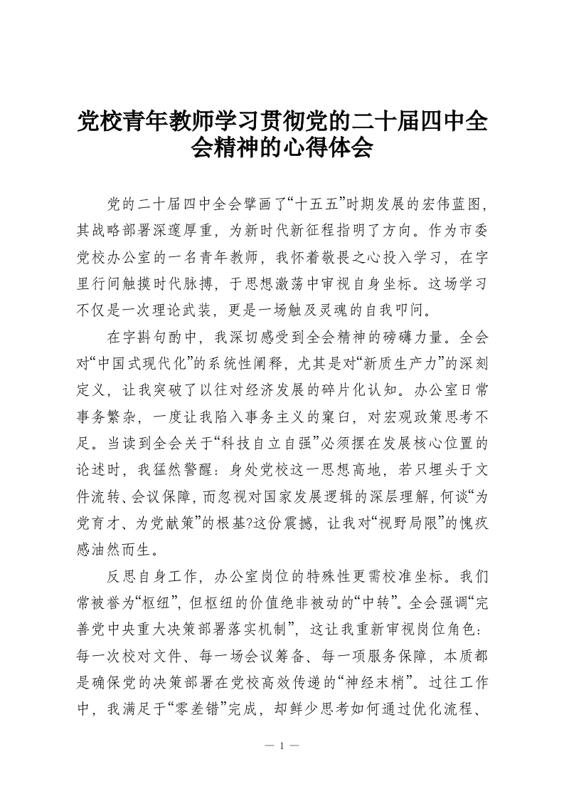 党校青年教师学习贯彻党的二十届四中全会精神的心得体会党的二十届四中全会擘画了“十五五”时期发展的宏伟蓝图,其战略部署深邃厚重,为新时代新征程指明了方向。作为市委党校办公室的一名青年教师,我怀着敬畏之心投入学习,在字里行间触摸时代脉搏,于思想激荡中审视自身坐标。这场学习不仅是一次理论武装,更是一场触及灵魂的自我叩问。在字斟句酌中,我深切感受到全会精神的磅礴力量。全会对“中国式现代化”的系统性阐释,尤其是对“新质生产力”的深刻定义,让我突破了以往对经济发展的碎片化认知。办公室日常事务繁杂,一度让我陷入事务主义的窠白,对宏观政策思考不足。当读到全会关于“科技自立自强”必须摆在发展核心位置的论述时,我猛然警醒:身处党校这一思想高地,若只埋头于文件流转、会议保障,而忽视对国家发展逻辑的深层理解,何谈“为党育才、为党献策”的根基?这份震撼,让我对“视野局限”的愧疚感油然而生。反思自身工作,办公室岗位的特殊性更需校准坐标。我们常被誉为“枢纽”,但枢纽的价值绝非被动的“中转”。全会强调“完善党中央重大决策部署落实机制”,这让我重新审视岗位角色:每一次校对文件、每一场会议筹备、每一项服务保障,本质都是确保党的决策部署在党校高效传递的“神经末梢”。过往工作中,我满足于“零差错”完成,却鲜少思考如何通过优化流程、一1