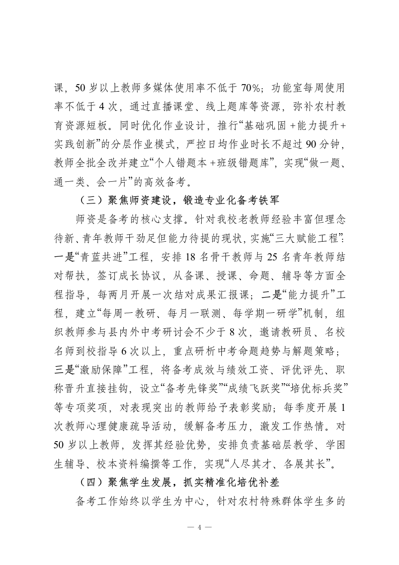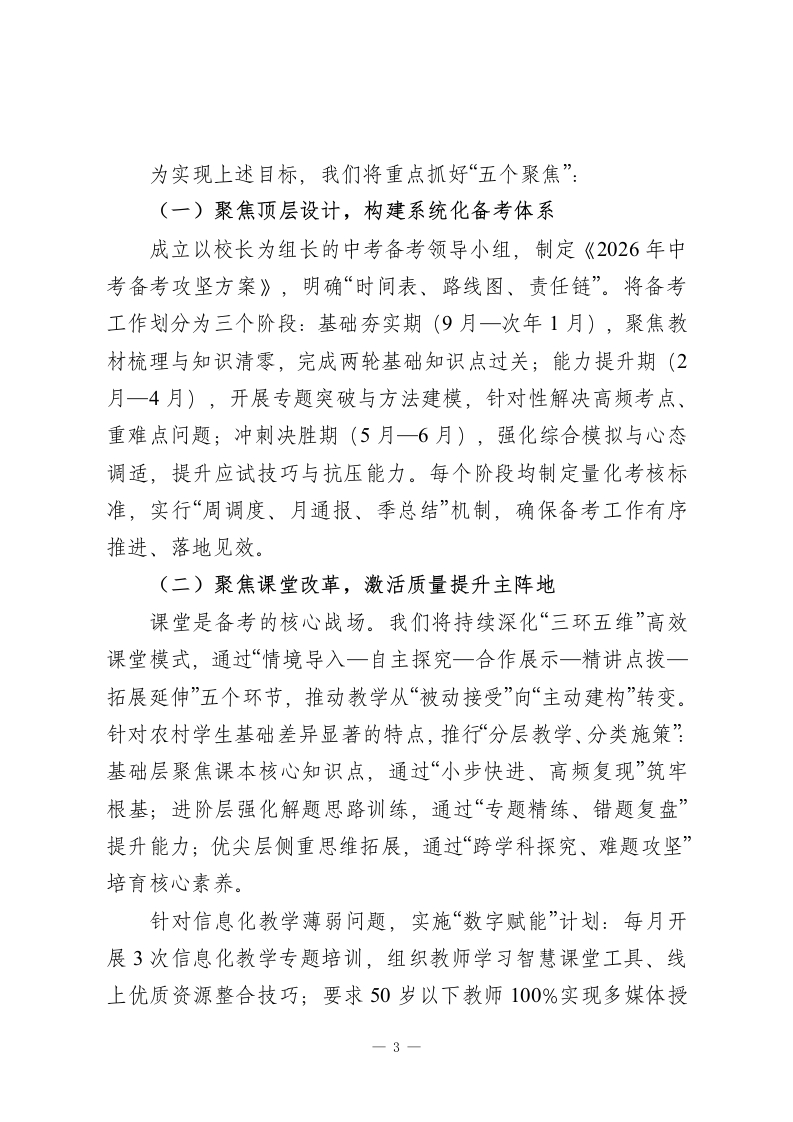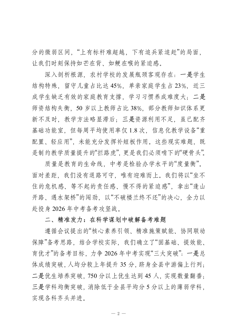 全县教育高质量发展暨2026年中考备考工作会,校长汇报发言:“精准备考”誓打中考翻身仗各位领导、各位同仁:大家好!今天,我们怀着对教育事业的赤诚与担当,齐聚一堂共赴全县初中教育高质量发展暨2026年中考备考工作会。这既是一次凝聚共识、提振士气的动员会,更是一场靶向发力、誓破难关的攻坚会。作为深耕农村教育一线28年的教育工作者,我深知农村孩子的求学梦承载着万千家庭的期盼,也深知中考备考对农村学校而言,是一场必须打赢的硬仗。借此机会,我代表学校,结合农村办学实际,就2026年中考备考工作谈几点思考与举措。一、正视短板:在清醒认知中凝聚奋进共识刚才教育局领导的精准研判,用翔实数据为我们勾勒出全县初中教育的发展图景。2025年中考成绩如同一块“试金石”,既映照出我们的点滴进步,更凸显了不容忽视的差距:全县人均总分563.72分,较上年呈现小幅下滑态势,学科发展不均衡问题突出,优生梯队建设滞后,这一现象在农村学校尤为明显。我校作为全县规模较大的农村初中,现有学生1380余名,去年中考成绩虽较往年提升72个百分点,但与城区优质学校相比,人均分仍相差42分;与兄弟农村学校相比,优势仅维持在3.51