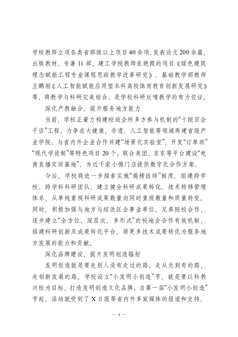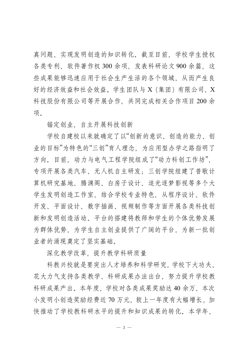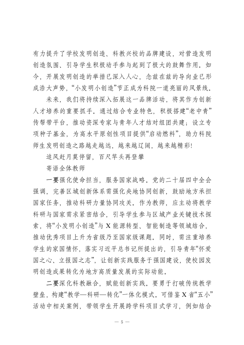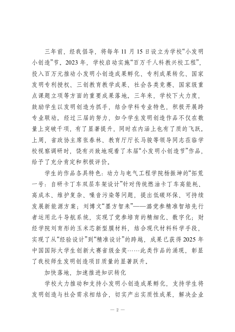 省政协常委、校长在第三届“小发明小创造”节总结表彰大会上的讲话尊敬的X主席、各位领导、企业代表,亲爱的老师们、同学们:大家上午好!今天,在这样一个充满创新活力与智慧光芒的时刻,我们齐聚一堂,隆重召开第三届“小发明小创造”节总结表彰大会。在此,我谨代表学校向长期以来关心、支持学校建设发展的各位领导、专家、社会各界表示衷心的感谢!向所有获奖的教师和同学们表示衷心的祝贺!本届“小发明小创造”节以“智创领航启新程科创筑梦耀青春”为主题,自启动以来,全校师生积极响应、热情参与,涌现出了一大批富有创意和实用价值的优秀作品,充分展现了我校师生勤于思考、敢于探索、勇于创新的精神风貌,让我们看到了全校师生在发明创造方面的巨大潜力和无限可能。值得一提的是,本月上旬,2025年X省“五小”创新大赛优秀成果展在晋阳湖会展中心开幕。我校工匠学院作为省教科文卫体工会推荐的唯一一所民办工匠学院闪耀亮相,不仅呈现了学校在人才培养模式、课程体系建设等方面的创新探索,更通过一系列实物成果彰显了教学与实践的深度融合。我们的“小发明小创造”活动与我省“五小”创新大赛同频共振,说明我们走的是一条符合地方创新驱动发展战略的正确道路。今天,借此机会,我将从以下三个方面和大家做一些交流分享。持续深耕,提升发明创造质量1-