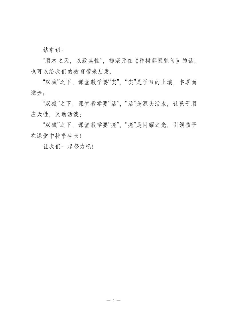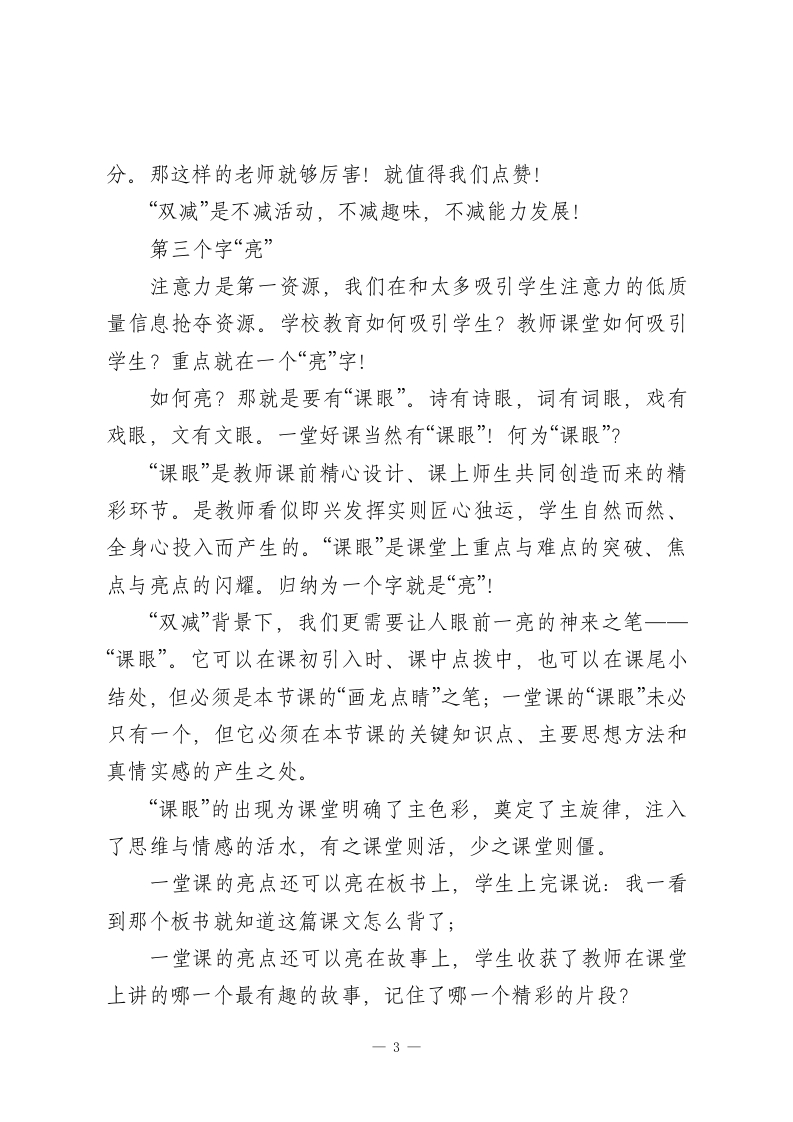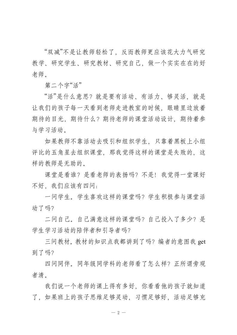 双减背景之下,校长给老师做教学指导,在教研活动上精彩发言各位老师:课堂是教学质量提高的生命线,提高课堂教学效率,发挥最大的潜能,对于每一位老师来说都是一个经久不衰的讨论话题。常言道:“教无定法”,在“双减”背景下的有效教学实施中,也要遵循这一原则。虽然,“教无定法”,虽然“双减”提倡减掉学生的学业负担,但是如何让学生的学习不至于变成负担?如何让教学充满活力和生命力,这是我们每一个教师值得思考的话题。今天,我想分享“双减”背景下,课堂教学的三个追求,这三个追求分别是三个字:第一个字:“实”“实”是什么?就是实在、务实、抓实,没有虚的,没有花架子,没有旁逸斜出的。正如茅盾在《白杨礼赞》中写的:“它所有的丫枝一律向上,而且紧紧靠拢,也像加过人工似的,成为一束,绝不旁逸斜出。”所以,“实”就是集中,就是一课一得,就是孩子们每上完一节课都有实打实的获得感,就是核心问题被解决,核心能力被发展,核心素养被培育。教师要常常问问自己:假如我是孩子,今天我获得了什么?我是获得了写字的一个好方法,还是阅读理解的小窍门,是获得了一个重要的知识点,还是获得了美美的情感体验?1