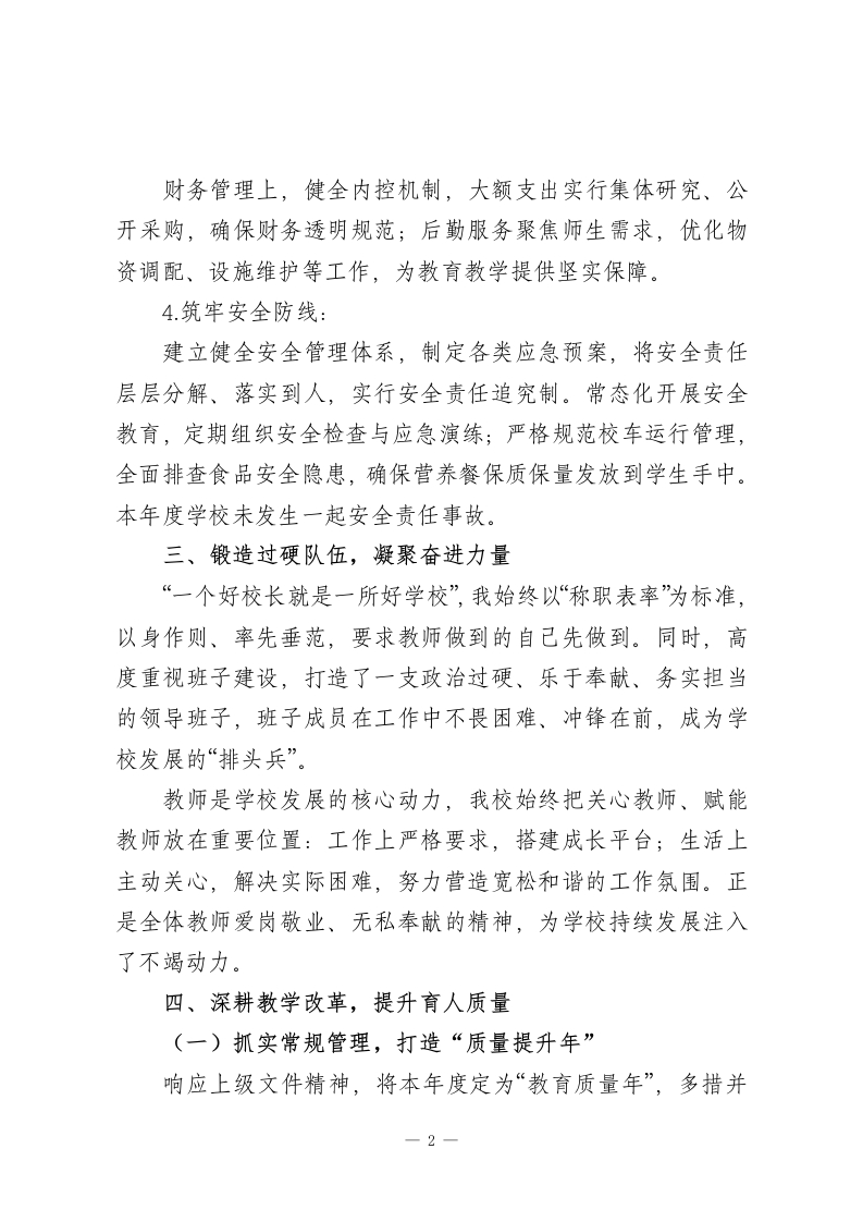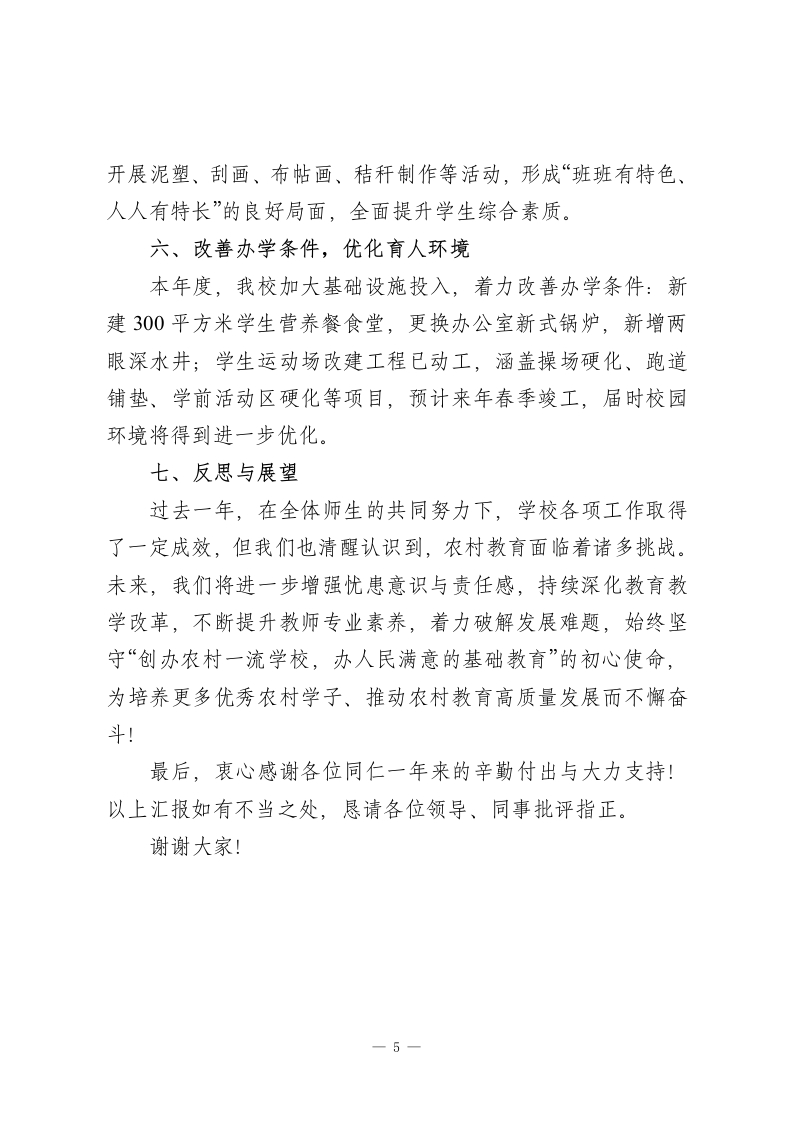 乡村校长年度个人述职报告,守教育初心育乡梓英才,办人民满意的农村基础教育尊敬的各位领导、同仁:大家好!时光荏苒,岁末将至。现将我本年度在校长岗位上的履职情况及学校各项工作开展情况,向大家作详细汇报,恳请各位批评指正。一、锚定办学方向,筑牢发展根基一年来,我校立足农村教育实际,紧扣时代发展需求,始终坚守“创办农村一流学校,办人民满意的基础教育”的核心办学理念。以全面提升教育教学质量为中心任务,持续深化课堂教学改革,强化学生养成教育,全力构建平安、和谐、优质的校园生态,推动学校各项工作稳步向前、持续向好。二、规范管理体系,提升治理效能1.健全制度保障:结合上级文件精神与学校实际,修订完善《病事假管理制度》《教学奖励制度》等一系列规章制度,经全体教职工大会讨论通过后严格执行,让学校管理有章可循、有据可依。2.明确分工职责:构建“校长统筹、班子分管、教师落实”的管理格局,从校级领导到一线教师,层层明确职责、细化任务,形成“事事有人管、件件有着落”的工作闭环。3.强化后勤管理:一1