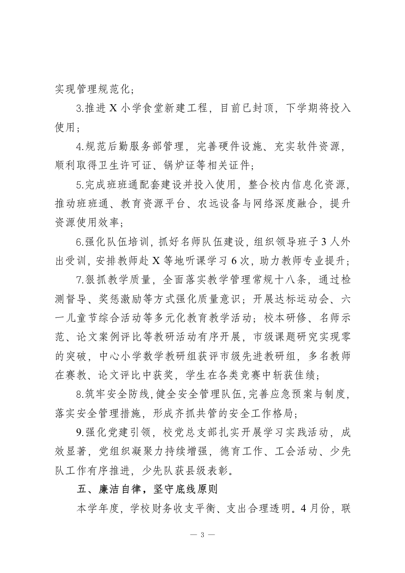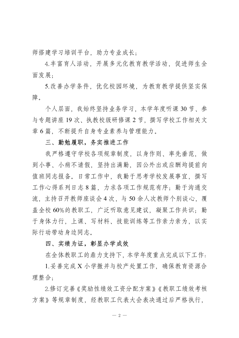小学校长从5个方面做年度述职报告尊敬的各位领导、同志们:大家好!时光荏苒,我在X中心小学任职的第二个学年度即将结束。现将本学年度工作情况从德、能、勤、绩、廉五个方面向各位作详细汇报,恳请批评指正。一、修德立身,凝聚发展合力我始终秉持“诚心对人,真心做事”的做人做事准则。“诚心对人”让我与班子成员紧密团结,增强了学校团队的凝聚力与战斗力;也赢得了学生的喜爱、家长的认可和社会的信任,为学校发展营造了良好的外部环境。“真心做事”让我始终坚守教育初心,以高度的责任感践行教育使命。作为校长和总支部书记,我毫不动摇拥护党的领导,带领全体教职工认真贯彻国家教育方针,坚守“办人民满意的教育”的初心,在社会上维护了教育工作者的良好形象。二、强能提质,夯实办学根基本学年度,学校工作稳中有进,在班子分工明确、职责清晰的基础上,重点推进以下工作:1.明确发展思路,确立“立足自身,抢抓机遇,充实内涵,提升质量”的核心方向,为学校发展指明路径;2.强化思想引领,通过专题学习、座谈交流等形式,增强教职工的责任意识、忧患意识、大局意识和服务意识;3.加强队伍建设,为青年教师提供管理实践机会,为全体教1