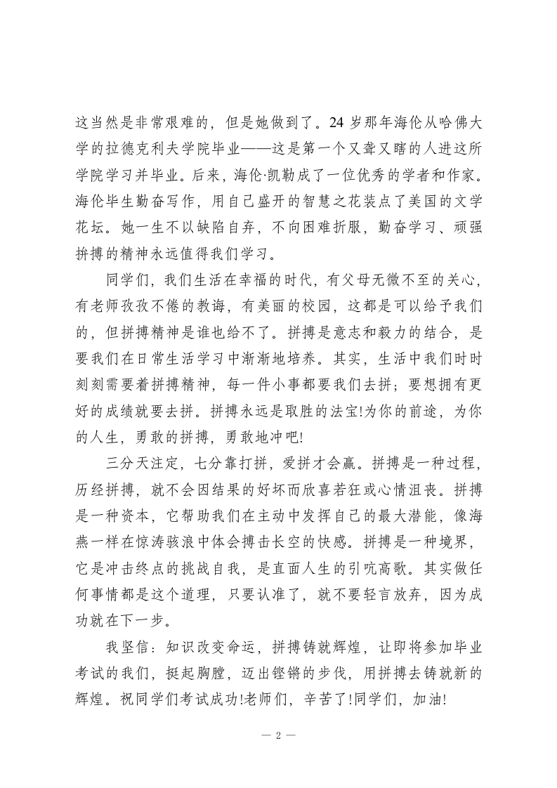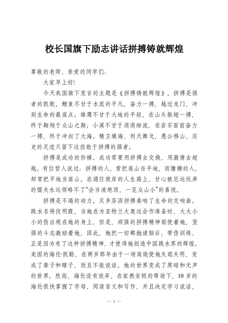 校长国旗下励志讲话拼搏铸就辉煌尊敬的老师,亲爱的同学们:大家早上好!今天我国旗下发言的主题是《拼搏铸就辉煌》。拼搏是强者的凯歌。鲤鱼不甘于水底的平凡,奋力一搏,越过龙门,冲到生命的最高点;雄鹰不甘于大地的平坦,在山头振翅一搏,终于翱翔于众山之颠;小溪不甘于涓涓细流,在岩石面前奋力一搏,终于冲向了大海。精卫填海,刑天舞戈,愚公移山,历史的足迹只留下这些敢于拼搏的强者。拼搏是成功的阶梯。成功需要用拼搏去交换,用激情去超越。有位哲人说过:拼搏的人,常把高山当平地,而慵懒的人,却常把平地当高山。在通往彼岸的人生路上,甘心被厄运玩弄的懦夫永远领略不了“会当凌绝顶,一览众山小”的喜悦。拼搏是不竭的动力。贝多芬因拼搏奏响了生命的交响曲。跳水名将伏明霞,当她在为亚特兰大奥运会作准备时,大大小小的伤出现在她的身上,但是,顽强的拼搏精神驱使着她,坚强的斗志激励着她,因此,她把一切都抛诸脑后,带伤训练,正是因为有了这种拼搏精神,才使得她创造中国跳水界的辉煌。美国的海伦凯勒,在两岁那年由于一场高烧使她失聪失明,变成了聋子和瞎子,而且不能说话。她的世界变成了黑暗和无声的世界。然而,海伦没有放弃,在家教安妮的帮助下,10岁的海伦很快掌握了字母、阅读盲文和写作,并且决定学习说话,1