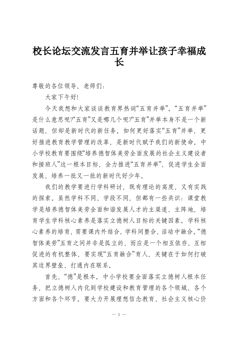 校长论坛交流发言五育并举让孩子幸福成长尊敬的各位领导、老师们:大家下午好!今天我想和大家谈谈教育界热词“五育并举”。“五育并举”是什么意思呢?“五育”又是哪几个呢?“五育”并举本身不是一个新话题,但却是新时代的新任务。如何更好落实“五育”并举,更好推进教育教学管理的改革,是新时代赋子我们的新使命。中小学校教育要围绕“培养德智体美劳全面发展的社会主义建设者和接班人”这一根本目标,全力推进“五育并举”,促进学生全面发展,培养一批又一批的新时代好少年。我们的教学要进行学科研讨,既有理论的高度,又有实践的探索。虽然学科不同、学段不同,但都有一些共识:课堂教学是培养德智体美劳全面和谐发展人才的主渠道、主阵地,培育学生学科核心素养是落实立德树人目标的关键因素。学科核心素养的培育,需要课内外结合,学科间整合,活动中融合。“德智体美劳”五育之间并非是孤立的,而应是一个相互依存、互相促进的有机整体,要实现“五育融合”育人,关键在于如何打破其边界壁垒、打通内在联系。首先,“德”是根本。中小学校要全面落实立德树人根本任务,把立德树人内化到学校建设和教育管理的各个领域、各个方面和各个环节。要大力开展理想信念教育、社会主义核心价1