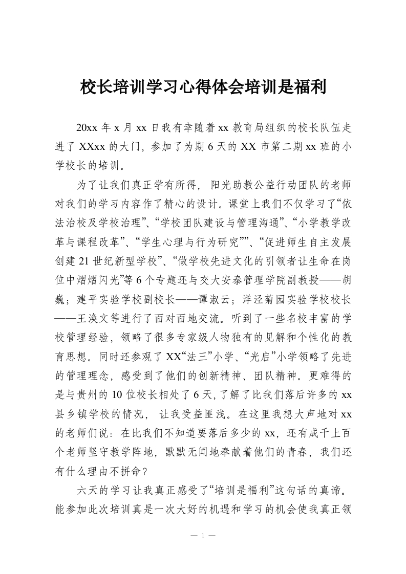 校长培训学习心得体会培训是福利20xx年x月Xx日我有幸随着Xx教育局组织的校长队伍走进了XXxx的大门,参加了为期6天的XX市第二期xx班的小学校长的培训。为了让我们真正学有所得,阳光助教公益行动团队的老师对我们的学习内容作了精心的设计。课堂上我们不仅学习了“依法治校及学校治理”、“学校团队建设与管理沟通”、“小学教学改革与课程改革”、“学生心理与行为研究”、“促进师生自主发展创建21世纪新型学校”、“做学校先进文化的引领者让生命在岗位中熠熠闪光”等6个专题还与交大安泰管理学院副教授一胡巍;建平实验学校副校长一一谭淑云;洋泾菊园实验学校校长一一王涣文等进行了面对面地交流。听到了一些名校丰富的学校管理经验,领略了很多专家级人物独有的见解和个性化的教育思想。同时还参观了XX“法三”小学、“光启”小学领略了先进的管理理念,感受到了他们的创新精神、团队精神。更难得的是与贵州的10位校长相处了6天,了解了比我们落后许多的xx县乡镇学校的情况,让我受益匪浅。在这里我想大声地对Xx的老师们说:在比我们不知道要落后多少的Xx,还有成千上百个老师坚守教学阵地,默默无闻地奉献着他们的青春,我们还有什么理由不拼命?六天的学习让我真正感受了“培训是福利”这句话的真谛。能参加此次培训真是一次大好的机遇和学习的机会使我真正领1