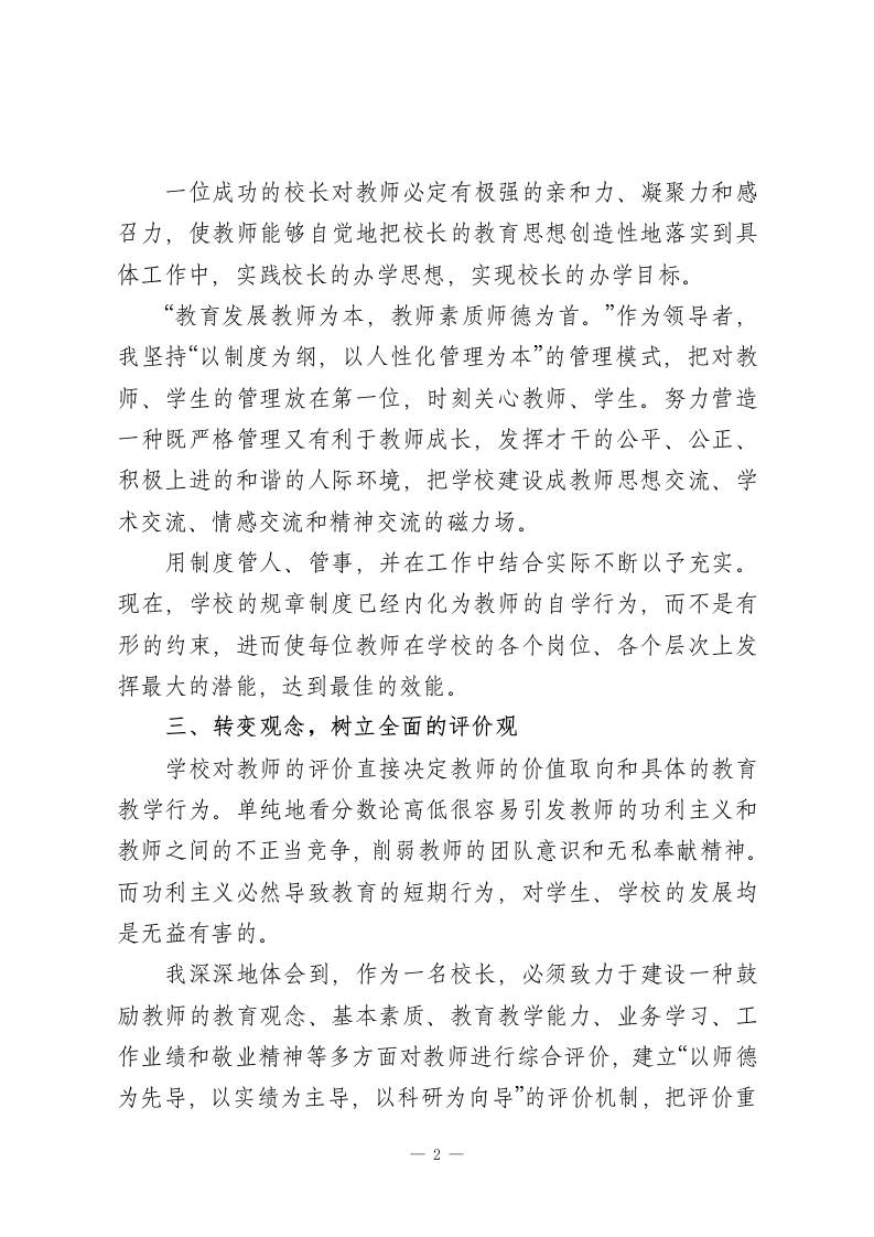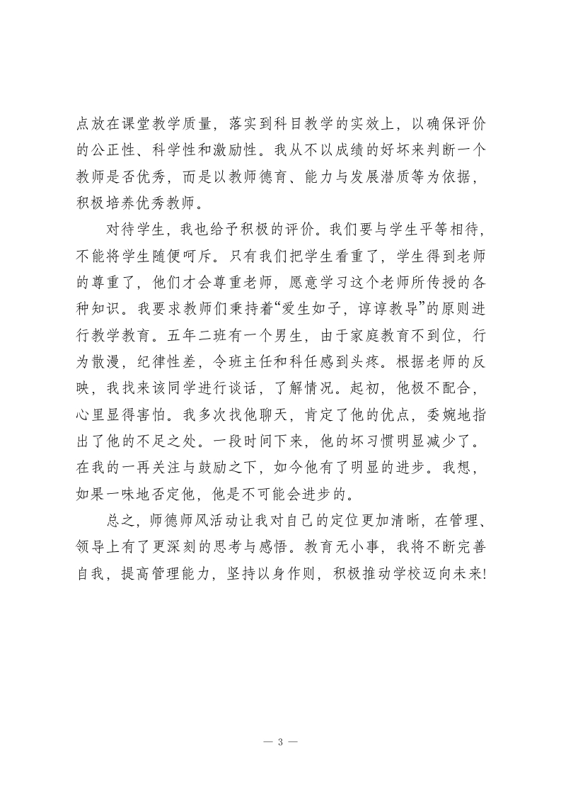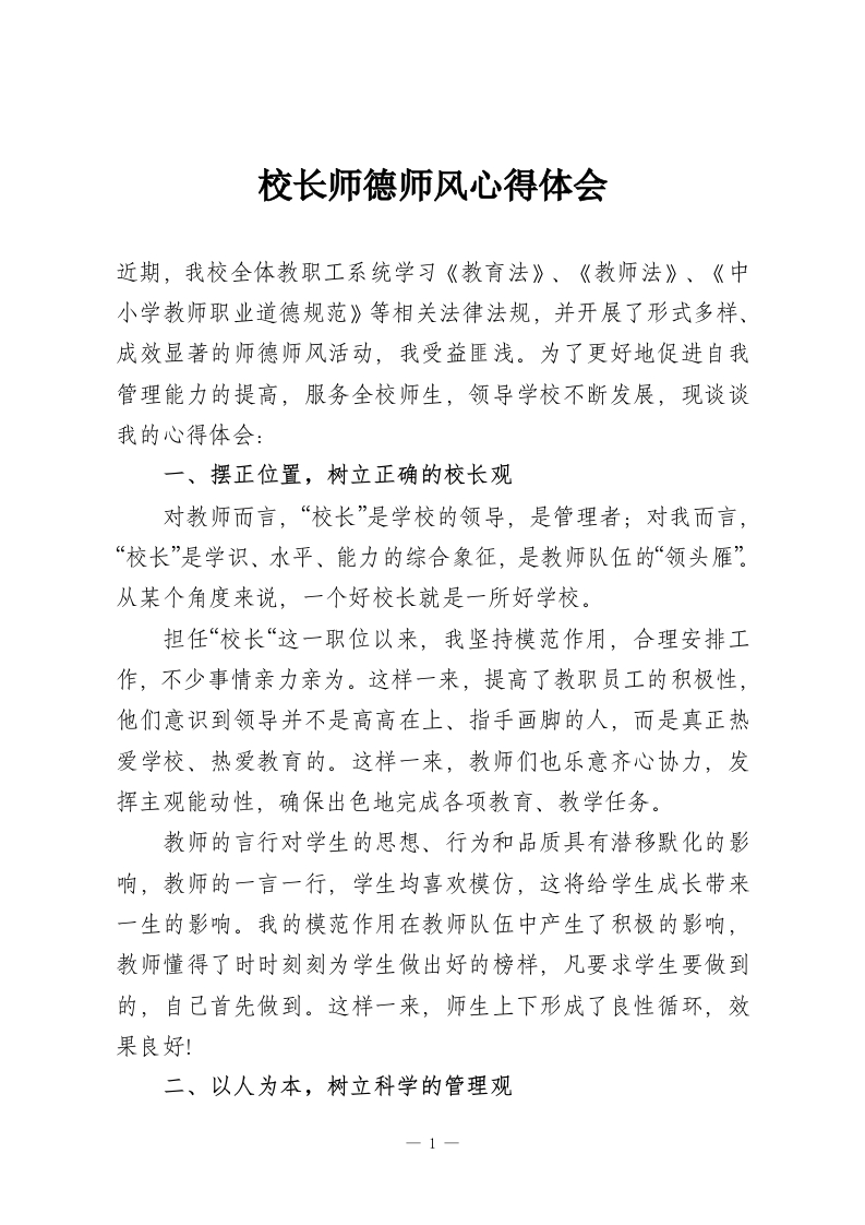 校长师德师风心得体会近期,我校全体教职工系统学习《教育法》、《教师法》、《中小学教师职业道德规范》等相关法律法规,并开展了形式多样、成效显著的师德师风活动,我受益匪浅。为了更好地促进自我管理能力的提高,服务全校师生,领导学校不断发展,现谈谈我的心得体会:一、摆正位置,树立正确的校长观对教师而言,“校长”是学校的领导,是管理者;对我而言,“校长”是学识、水平、能力的综合象征,是教师队伍的“领头雁从某个角度来说,一个好校长就是一所好学校。担任“校长“这一职位以来,我坚持模范作用,合理安排工作,不少事情亲力亲为。这样一来,提高了教职员工的积极性,他们意识到领导并不是高高在上、指手画脚的人,而是真正热爱学校、热爱教育的。这样一来,教师们也乐意齐心协力,发挥主观能动性,确保出色地完成各项教育、教学任务。教师的言行对学生的思想、行为和品质具有潜移默化的影响,教师的一言一行,学生均喜欢模仿,这将给学生成长带来一生的影响。我的模范作用在教师队伍中产生了积极的影响,教师懂得了时时刻刻为学生做出好的榜样,凡要求学生要做到的,自己首先做到。这样一来,师生上下形成了良性循环,效果良好!二、以人为本,树立科学的管理观一1