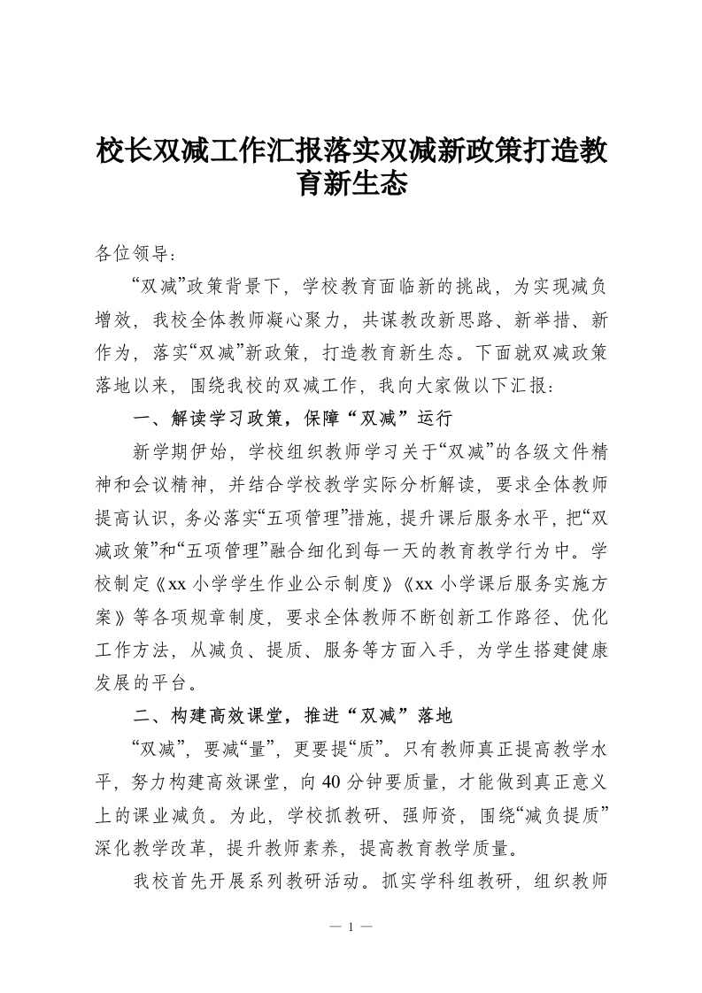 校长双减工作汇报落实双减新政策打造教育新生态各位领导:“双减”政策背景下,学校教育面临新的挑战,为实现减负增效,我校全体教师凝心聚力,共谋教改新思路、新举措、新作为,落实“双减”新政策,打造教育新生态。下面就双减政策落地以来,围绕我校的双减工作,我向大家做以下汇报:一、解读学习政策,保障“双减”运行新学期伊始,学校组织教师学习关于“双减”的各级文件精神和会议精神,并结合学校教学实际分析解读,要求全体教师提高认识,务必落实“五项管理”措施,提升课后服务水平,把“双减政策”和“五项管理”融合细化到每一天的教育教学行为中。学校制定《xx小学学生作业公示制度》《xx小学课后服务实施方案》等各项规章制度,要求全体教师不断创新工作路径、优化工作方法,从减负、提质、服务等方面入手,为学生搭建健康发展的平台。二、构建高效课堂,推进“双减”落地“双减”,要减“量”,更要提“质”。只有教师真正提高教学水平,努力构建高效课堂,向40分钟要质量,才能做到真正意义上的课业减负。为此,学校抓教研、强师资,围绕“减负提质”深化教学改革,提升教师素养,提高教育教学质量。我校首先开展系列教研活动。抓实学科组教研,组织教师1