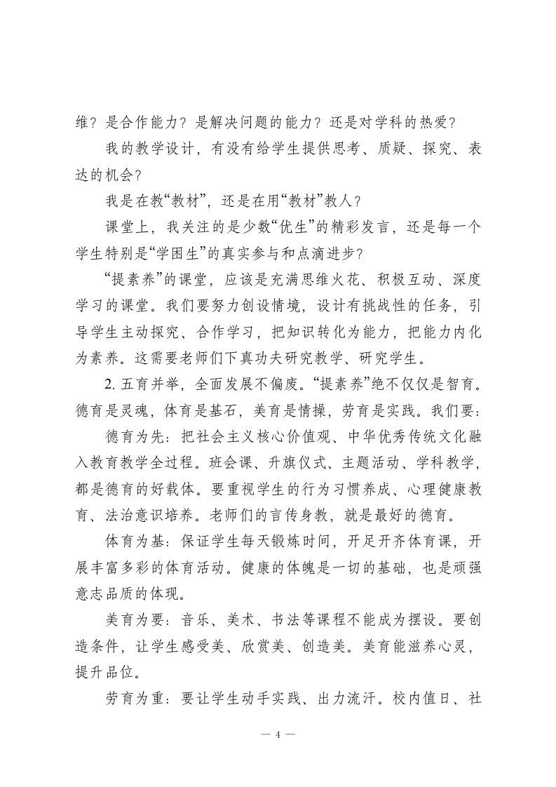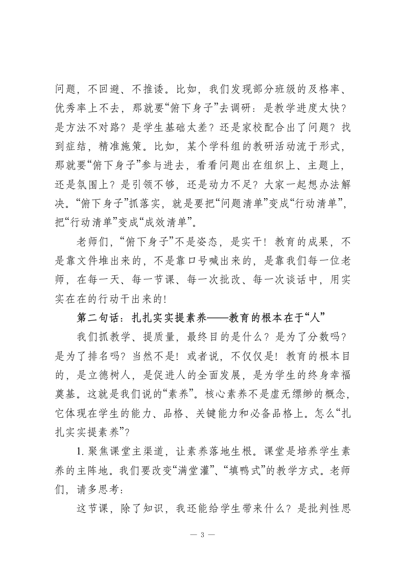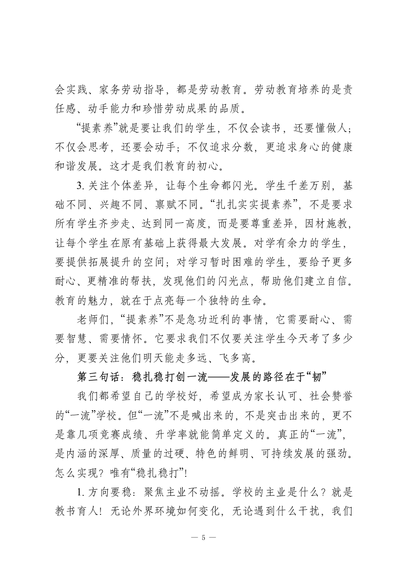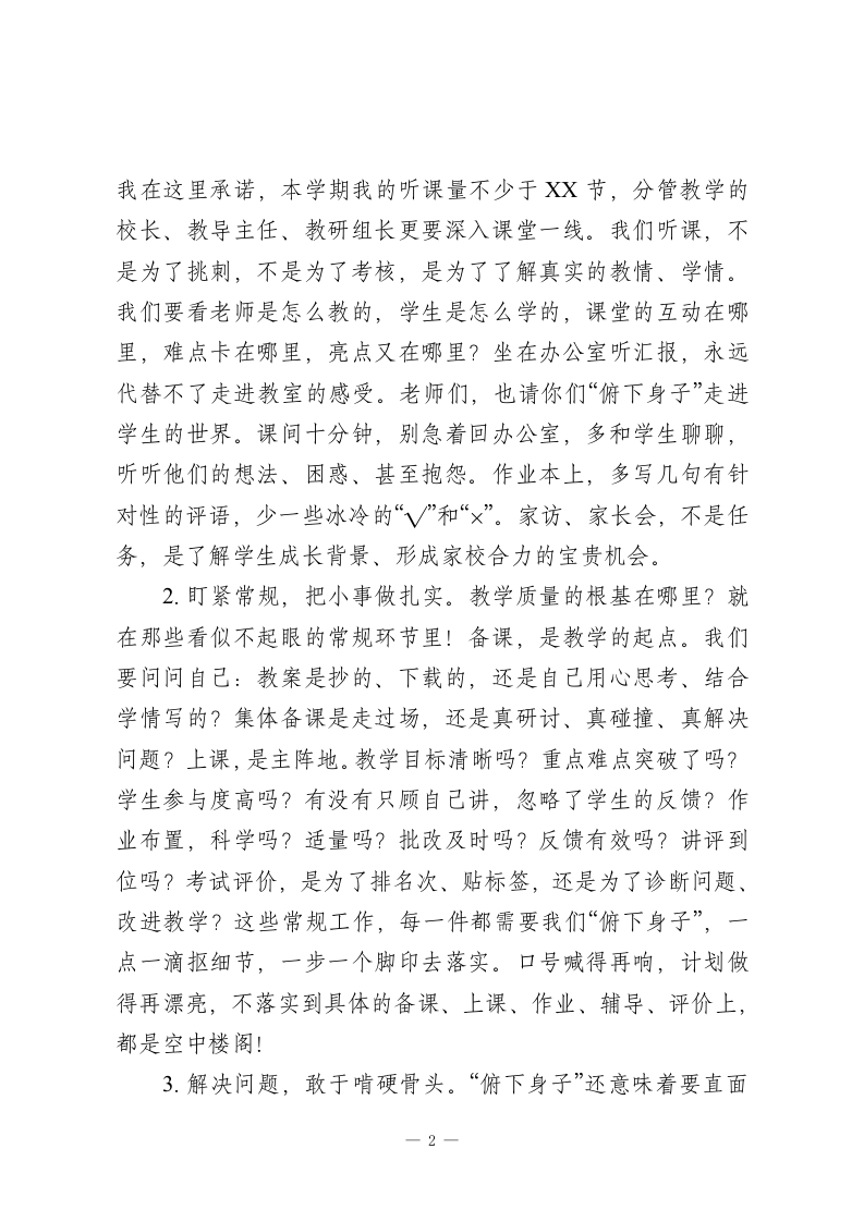 新学期教学工作会议上校长讲话:俯下身子抓落实,扎扎实实提素养,稳扎稳打创一流!各位老师,各位同仁:大家新学期好!又是一年开学季。看着办公室里新贴的课表,看着孩子们背着书包走进校园的身影,我想,我们每一个教育人心里都涌动着一种熟悉又新鲜的期待。新学期,新起点,也意味着新的责任和挑战。今天,我们聚在这里,召开新学期教学工作会议,核心只有一个:怎么把我们的教学工作做得更好?怎么让我们的学生成长得更好?怎么让我们的学校发展得更稳、更快?围绕这个核心,我想和大家交流的主题,就是我们今天的标题:俯下身子抓落实,扎扎实实提素养,稳扎稳打创一流!这18个字,没有华丽的辞藻,没有高深的理论,就是一句大白话,一句我们干教育、抓教学最朴素的行动指南。下面,我就围绕这三点,和大家掏掏心窝子,说说实在话。第一句话:俯下身子抓落实一教学的生命线在于“实”老师们,我们常说“教学是学校的中心工作”。这句话不能只挂在墙上、写在文件里,它必须落到地上、走进课堂、体现在每一个教学环节中。“俯下身子”,是一种态度,更是一种行动。它要求我们:1.放下架子,走进课堂深处。校长、主任要带头“俯下身子”1