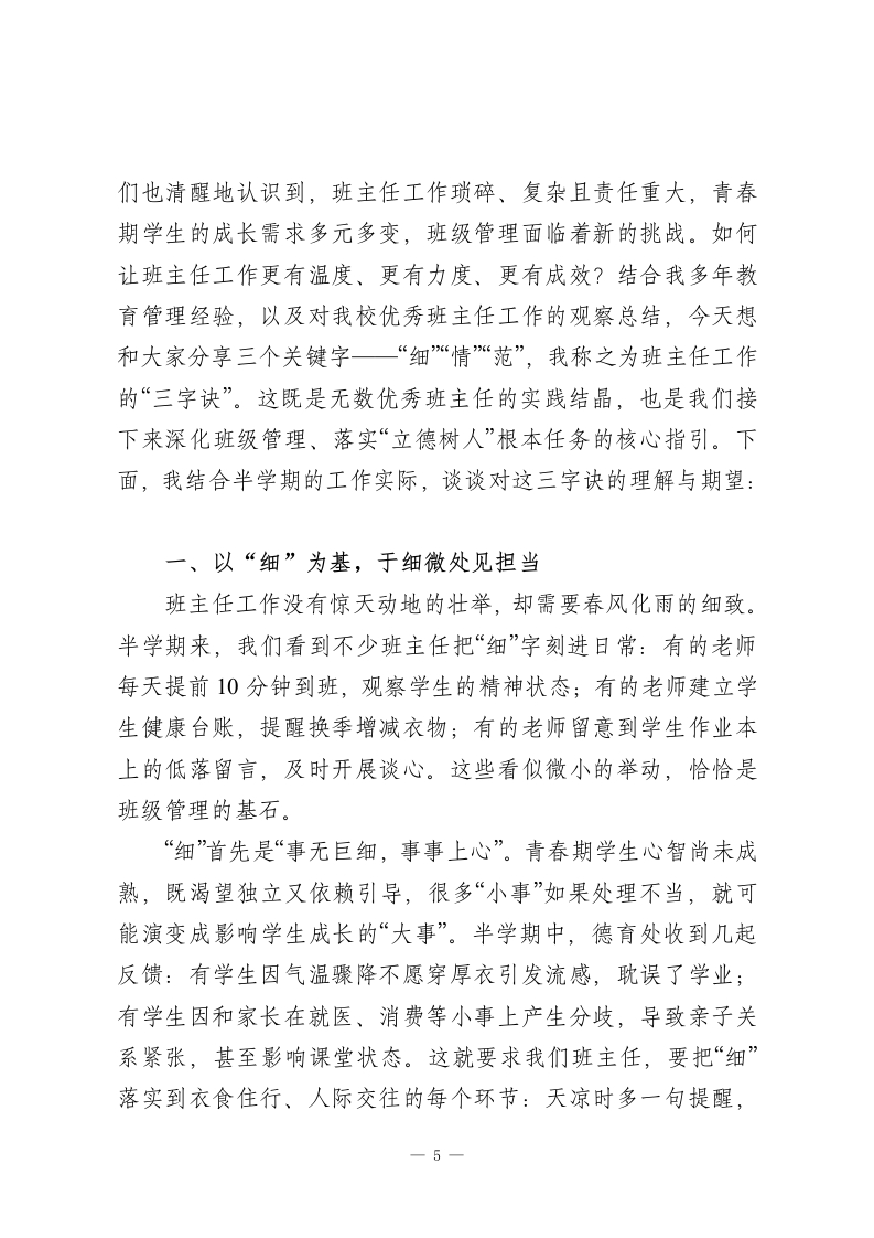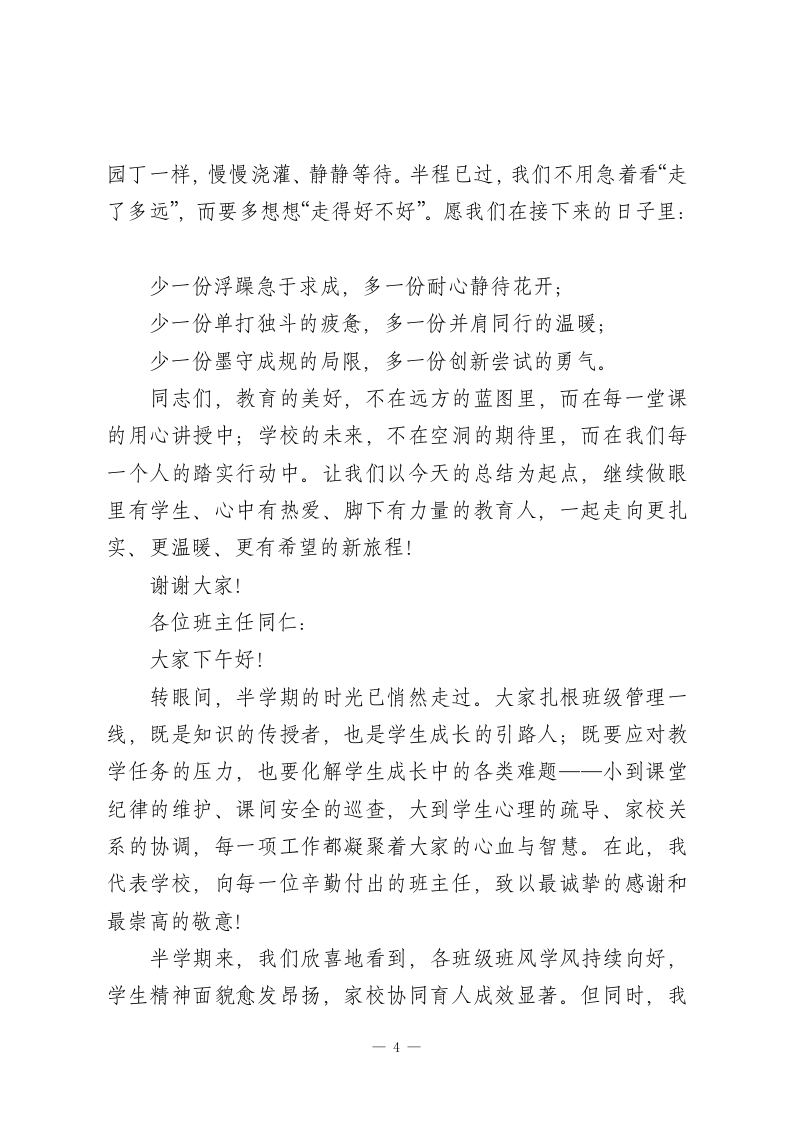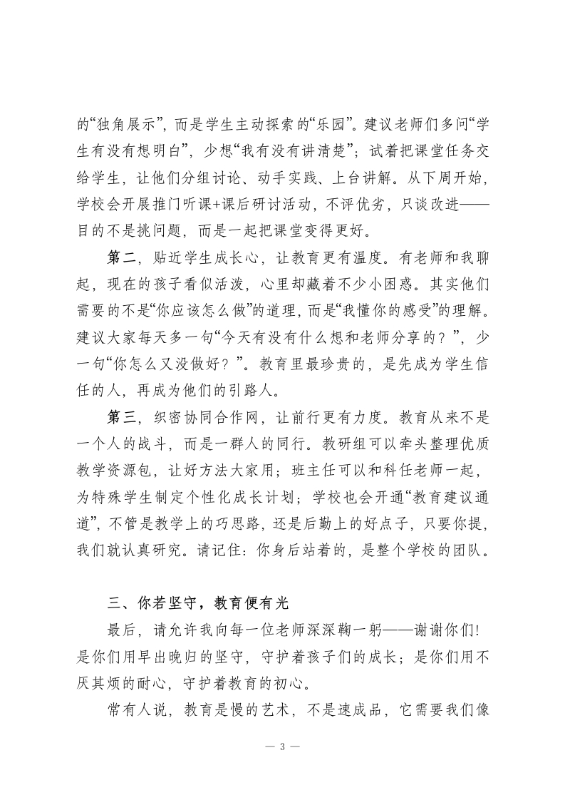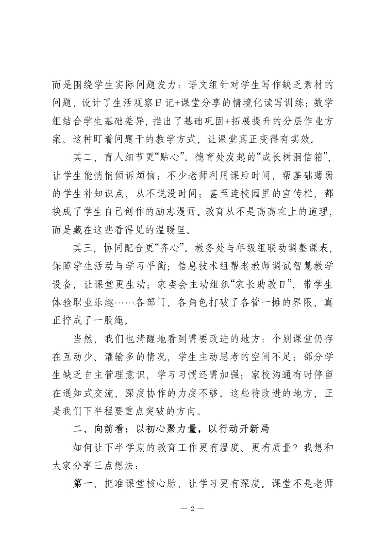 学校半学期工作总结会上,校长讲话:守住3份“心”,下半场更有底气尊敬的各位老师、同志们:大家下午好!时光的指针悄然行至学期中点,我们的教育耕耘也走过了半场旅程。今天,我们围坐在一起,不为晾晒已有的成果,不为纠结过往的缺憾,只为带着“半程育人思得失,携手同行启新篇”的诚意,回头看看走过的路,彼此聊聊心里的话,为下半段的教育时光攒足劲、定好向。说心里话,这半年来,每一位坚守在岗位上的同仁都格外辛苦。课后服务的优化、学生成长困惑的疏导、家长对教育质量的更高期待,像一道道需要用心作答的题目。很多老师早已习惯了“清晨伴着晨读声到岗,傍晚追着夕阳离校,周末还在梳理教学思路”的节奏,有时连喝杯热茶的时间都得挤出来。但正是这份忙碌里,藏着太多让人动容的瞬间:班主任午休时陪着情绪低落的孩子聊天,青年教师为了打磨一堂优质课反复向老教师请教,后勤师傅提前检修供暖设备保障冬日课堂温暖…这些藏在日常里的坚持与付出,是学校最珍贵的底色,也是我们一路前行的底气。一、回头看:于用心处见成效,于细节中找不足这半学期的工作,三个“心”字值得我们共同认可:其一,教学推进更“用心”。教研组不再是简单的集体备课,-1