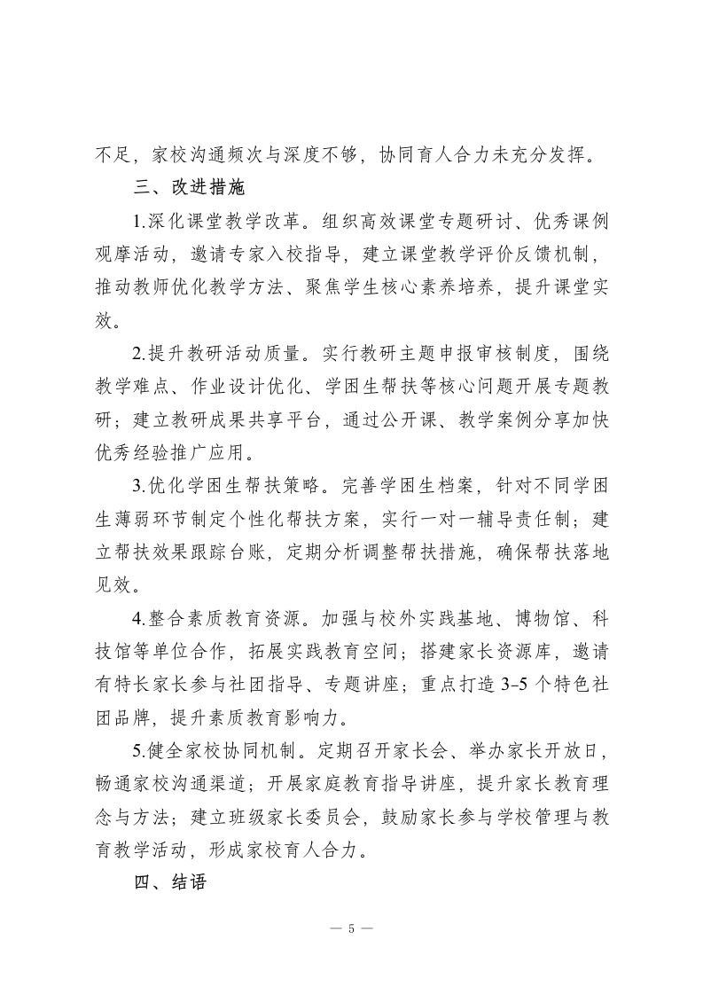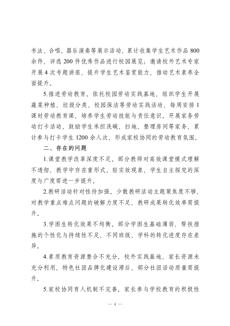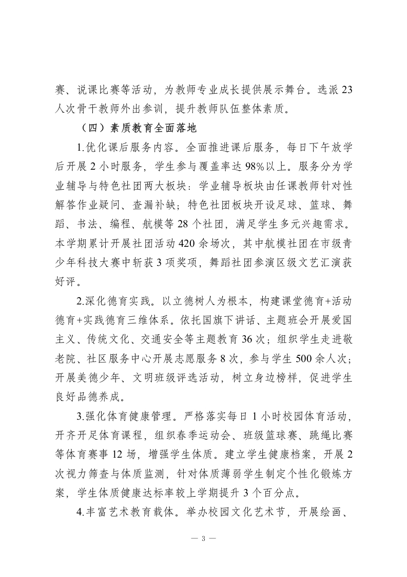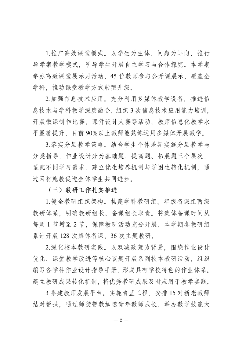学校教育教学工作总结汇报:以质量为核心,切实提升教育质量本学期学校教育教学工作在上级教育主管部门的正确领导下,全体教职工协同发力,顺利完成各项教育教学任务,教学质量稳步提升,学校发展呈现良性态势。现将本学期教育教学工作情况总结如下:一、工作成效(一)教学常规管理规范有序1.严格执行课程计划。依据国家课程方案开设全学科课程,通过优化师资结构、专职与兼职教师互补配合,保障音体美、信息技术、心理健康等课程正常开展。建立课程巡查机制,教务处联合年级组开展常态化检查,杜绝随意调课、占课行为。2.强化教学过程管控。围绕备课、上课、作业、辅导、评价五个核心环节,制定《教学常规管理实施细则》,明确各环节质量标准。实行教案周查、作业月查、听课季度统计制度,发现问题即时整改。本学期累计开展4次教学常规检查,抽查教案320余份,检查作业批改12次,有效规范教师教学行为。3.完善质量监控体系。组织期中、期末两次集中质量检测,构建年级、班级、学科三级质量分析机制,通过横向对比、纵向追踪掌握教学质量动态,为教学改进提供科学依据。建立学困生档案,实施精准帮扶,确保每位学生不掉队。(二)课堂教学改革持续深化1