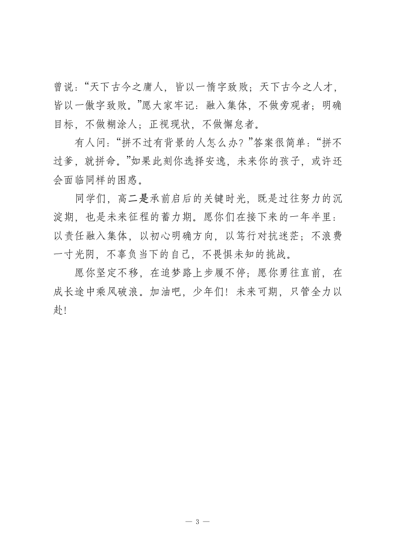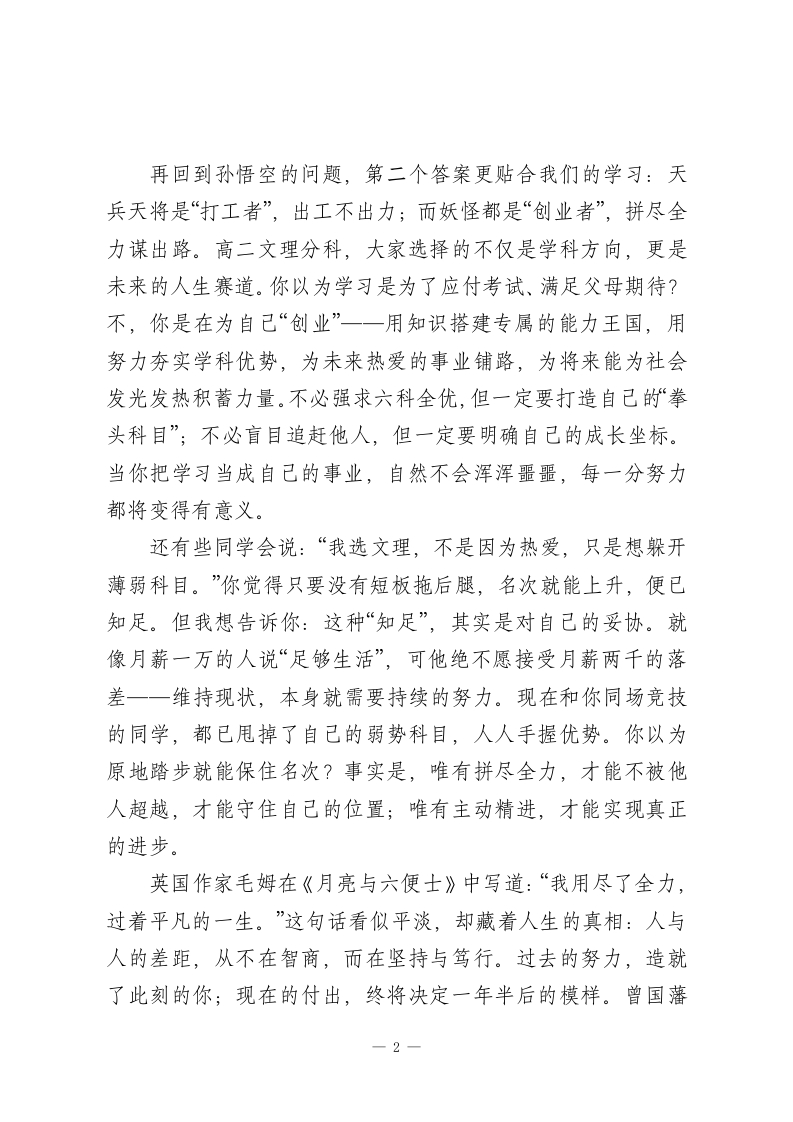 以笃行赴征程,以初心赴时光一一在高二半学期总结大会上的讲话同学们,最近是不是常有这样的困惑:高二上半程已过,课堂上难寻热忱,课余时满心茫然,半期成绩出炉后,更是被焦虑裹缠?今天,我不想谈空洞的方法论,也不愿说廉价的安慰话,就针对大家“融入难、目标迷、状态浑”这三个核心困扰,咱们来一场走心的交流。先问大家一个有意思的问题:《西游记》里的孙悟空,大闹天宫时所向披靡,为何取经路上却屡屡碰壁,总要仰仗天神相助?第一个答案藏着处世的智慧:大闹天宫时,他是无所顾忌的“破坏者”,只需搅乱秩序便能得逞;而取经路上,他是心怀牵挂的“守护者”,唐僧的安危成了软肋,有所求、有顾忌,前行自然步步维艰。这就像我们的班集体:“破坏者”只需一句抱怨、一次违规,就能搅乱班风;但“建设者”却要靠点滴付出,才能筑牢集体的根基。那些吐槽规则、敷衍集体的人,终究会被集体疏远;而主动承担责任的班干部、认真上好每一节课的同学、默默维护班级秩序的你我,才是这个集体真正的主人。当你为班级出一份力一一哪怕是整理一次图书角、参与一次班会策划、帮同学解答一道难题,你与集体的联结就会多一分,归属感自然油然而生。融入班级的最好方式,从来不是等待被接纳,而是主动成为建设者。一1