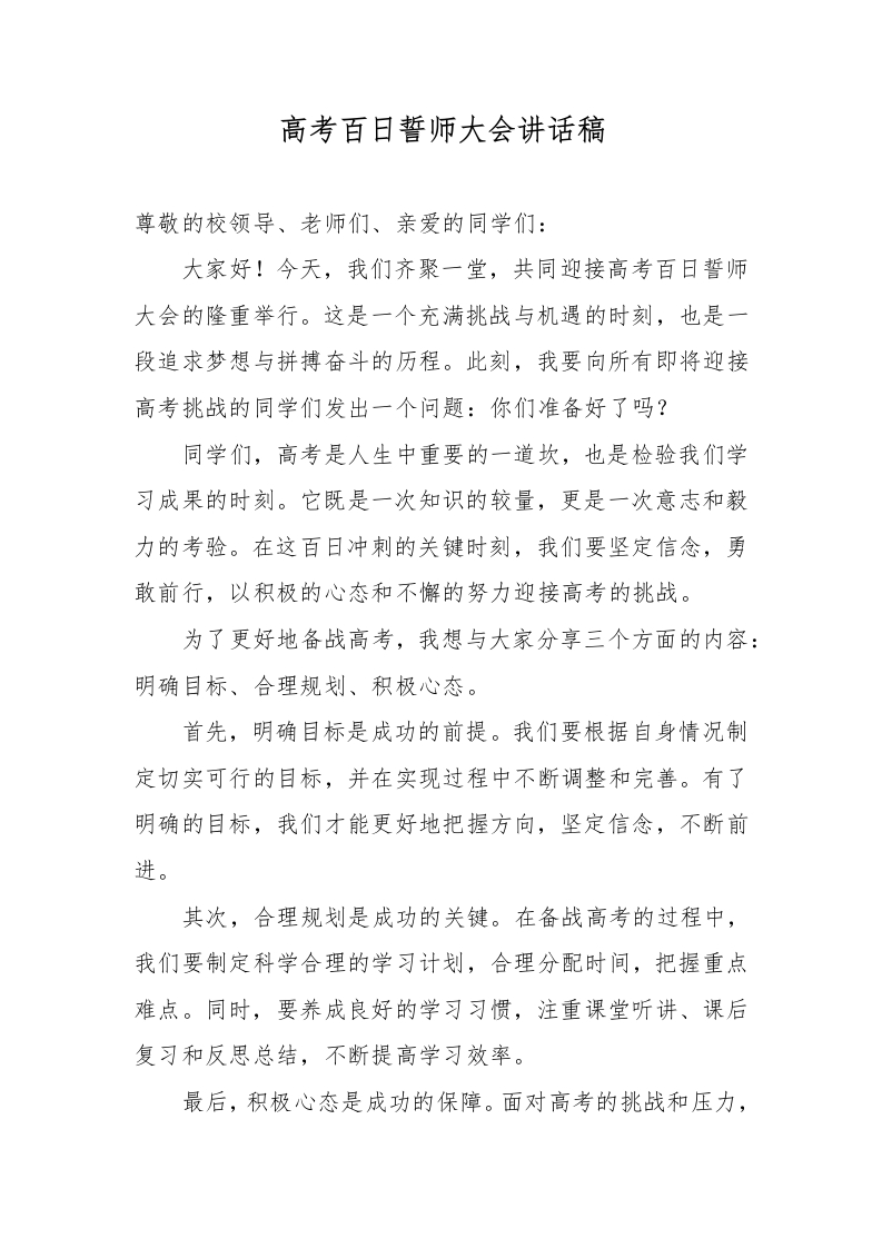 高考百日誓师大会讲话稿尊敬的校领导、老师们、亲爱的同学们:大家好!今天,我们齐聚一堂,共同迎接高考百日誓师大会的隆重举行。这是一个充满挑战与机遇的时刻,也是一段追求梦想与拼搏奋斗的历程。此刻,我要向所有即将迎接高考挑战的同学们发出一个问题:你们准备好了吗?同学们,高考是人生中重要的一道坎,也是检验我们学习成果的时刻。它既是一次知识的较量,更是一次意志和毅力的考验。在这百日冲刺的关键时刻,我们要坚定信念,勇敢前行,以积极的心态和不懈的努力迎接高考的挑战。为了更好地备战高考,我想与大家分享三个方面的内容:明确目标、合理规划、积极心态。首先,明确目标是成功的前提。我们要根据自身情况制定切实可行的目标,并在实现过程中不断调整和完善。有了明确的目标,我们才能更好地把握方向,坚定信念,不断前进。其次,合理规划是成功的关键。在备战高考的过程中,我们要制定科学合理的学习计划,合理分配时间,把握重点难点。同时,要养成良好的学习习惯,注重课堂听讲、课后复习和反思总结,不断提高学习效率。最后,积极心态是成功的保障。面对高考的挑战和压力,