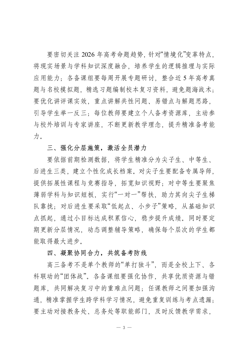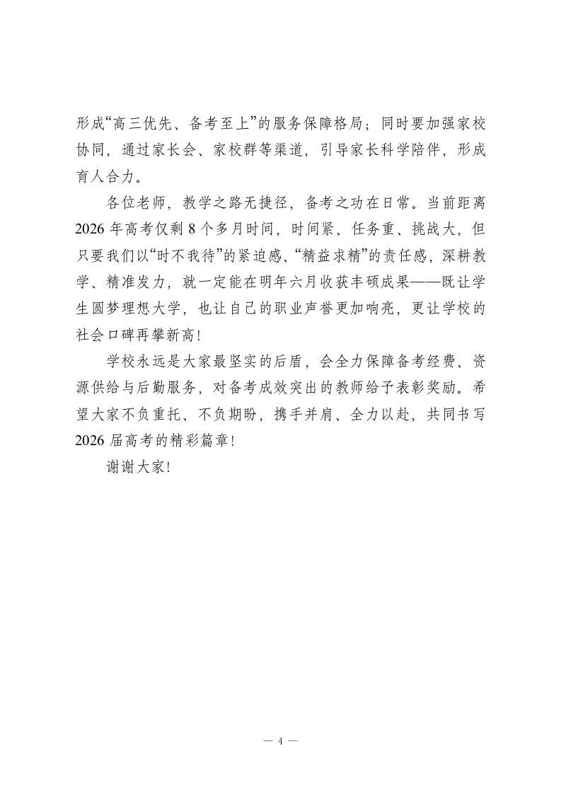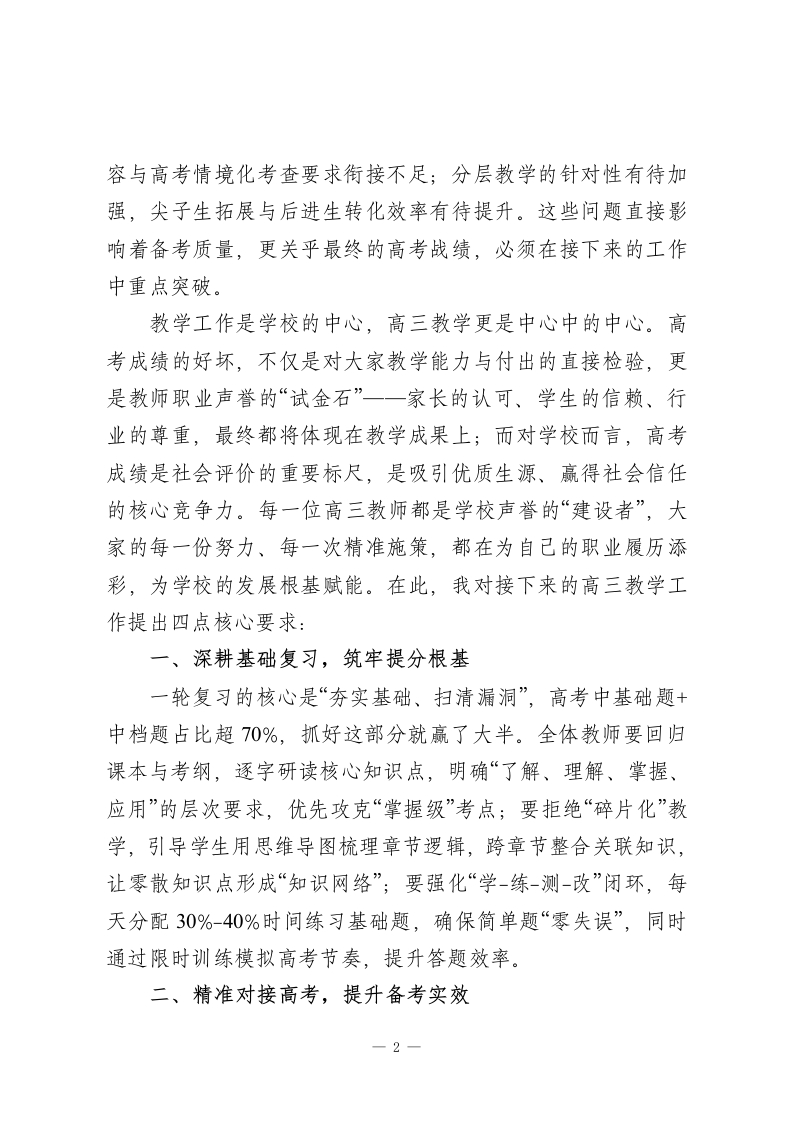 在2026届高三毕业班教师工作会议上校长讲话,锚定核心强教学,聚力备考赢声誉尊敬的各位高三教师:大家下午好!2026届高考备考正处在一轮复习“夯实基础、构建体系”的关键时期。教学工作是学校发展的生命线,而高三毕业班的教学质量,更是这条生命线的核心枢纽一一高考成绩不仅直接关乎每一位学生的人生走向,更紧密联结着教师的职业声誉与学校的社会口碑。今天召开这场会议,就是要明确目标、凝聚共识,号召全体高三教师以高度的责任感深耕教学,用优异的高考成绩为自己、为学校赢得应有的荣誉与认可!回顾秋季学期开学以来的备考工作,全体高三教师恪尽职守、攻坚克难,备考工作取得了阶段性成效:各学科已按计划完成教材核心知识点的首轮梳理,学生知识框架逐步搭建;集体备课常态化推进,围绕高考评价体系精准研讨复习重点与解题方法;周测、月度学情检测有序开展,能够及时发现学生知识薄弱点并动态调整复习节奏。但我们必须清醒认识到,2026年高考面临“人数激增、政策收紧、题型情境化变革”的多重挑战,理科逻辑推理类题目中等生失分率已高达40%,当前备考仍存在一些短板:部分学科基础知识点落实不够扎实,学生“似懂非懂”现象突出;个别教师对命题趋势把握不够精准,复习内