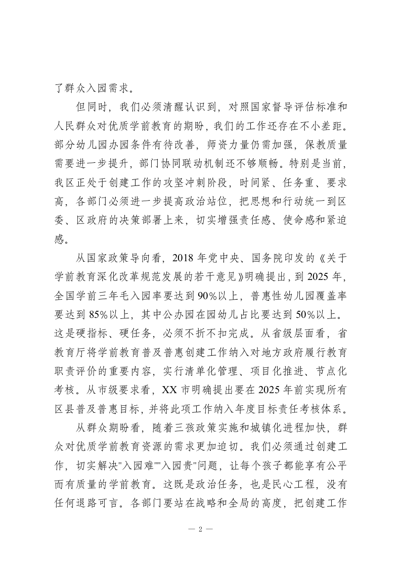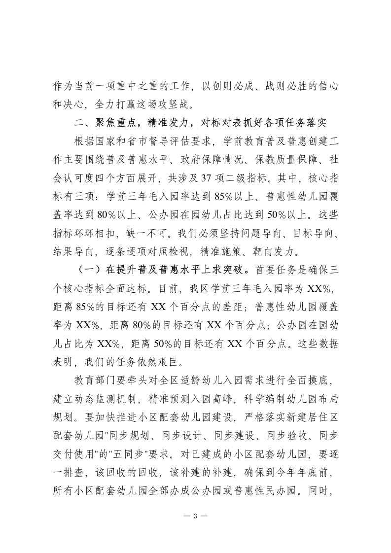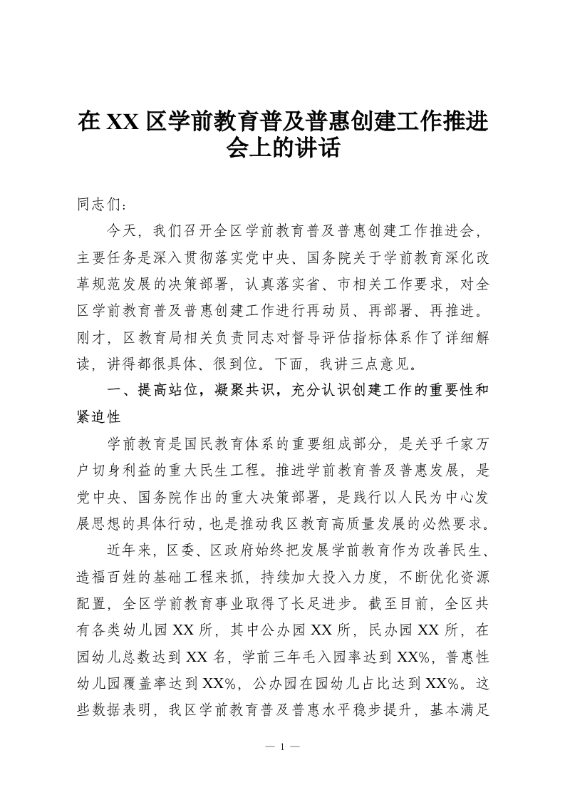 在XX区学前教育普及普惠创建工作推进会上的讲话同志们:今天,我们召开全区学前教育普及普惠创建工作推进会,主要任务是深入贯彻落实党中央、国务院关于学前教育深化改革规范发展的决策部署,认真落实省、市相关工作要求,对全区学前教育普及普惠创建工作进行再动员、再部署、再推进。刚才,区教育局相关负责同志对督导评估指标体系作了详细解读,讲得都很具体、很到位。下面,我讲三点意见。一、提高站位,凝聚共识,充分认识创建工作的重要性和紧迫性学前教育是国民教育体系的重要组成部分,是关乎千家万户切身利益的重大民生工程。推进学前教育普及普惠发展,是党中央、国务院作出的重大决策部署,是践行以人民为中心发展思想的具体行动,也是推动我区教育高质量发展的必然要求。近年来,区委、区政府始终把发展学前教育作为改善民生、造福百姓的基础工程来抓,持续加大投入力度,不断优化资源配置,全区学前教育事业取得了长足进步。截至目前,全区共有各类幼儿园XX所,其中公办园XX所,民办园XX所,在园幼儿总数达到XX名,学前三年毛入园率达到XX%,普惠性幼儿园覆盖率达到XX%,公办园在园幼儿占比达到XX%。这些数据表明,我区学前教育普及普惠水平稳步提升,基本满足1