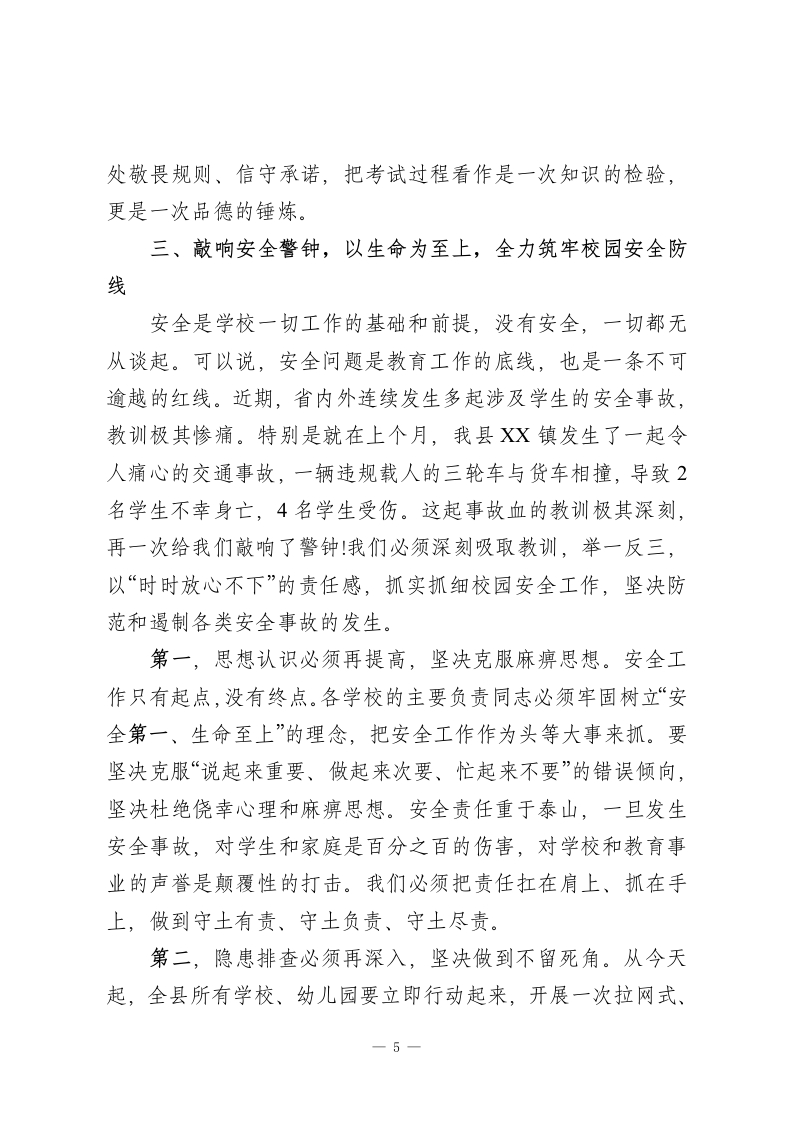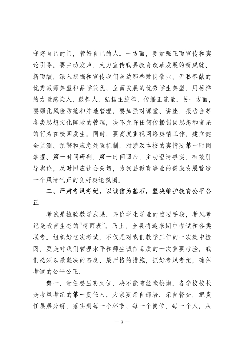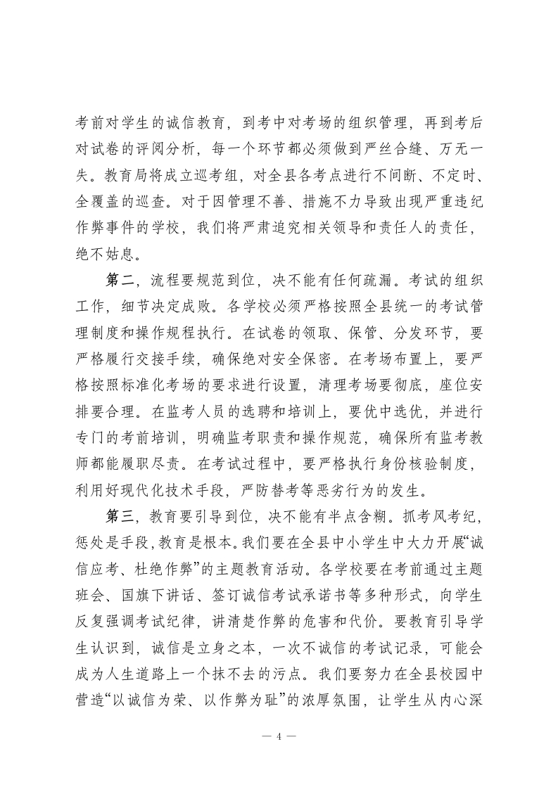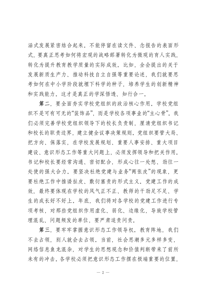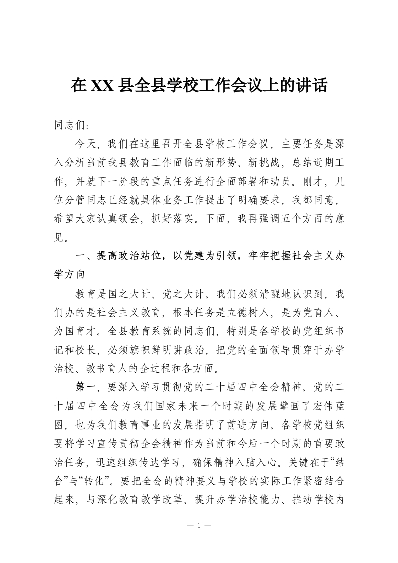 在XX县全县学校工作会议上的讲话同志们:今天,我们在这里召开全县学校工作会议,主要任务是深入分析当前我县教育工作面临的新形势、新挑战,总结近期工作,并就下一阶段的重点任务进行全面部署和动员。刚才,几位分管同志已经就具体业务工作提出了明确要求,我都同意,希望大家认真领会,抓好落实。下面,我再强调五个方面的意见。一、提高政治站位,以党建为引领,牢牢把握社会主义办学方向教育是国之大计、党之大计。我们必须清醒地认识到,我们办的是社会主义教育,根本任务是立德树人,是为党育人、为国育才。全县教育系统的同志们,特别是各学校的党组织书记和校长,必须旗帜鲜明讲政治,把党的全面领导贯穿于办学治校、教书育人的全过程和各方面。第一,要深入学习贯彻党的二十届四中全会精神。党的二十届四中全会为我们国家未来一个时期的发展擘画了宏伟蓝图,也为我们教育事业的发展指明了前进方向。各学校党组织要将学习宣传贯彻全会精神作为当前和今后一个时期的首要政治任务,迅速组织传达学习,确保精神入脑入心。关键在于“结合”与“转化”。要把全会的精神要义与学校的实际工作紧密结合起来,与深化教育教学改革、提升办学治校能力、推动学校内1
