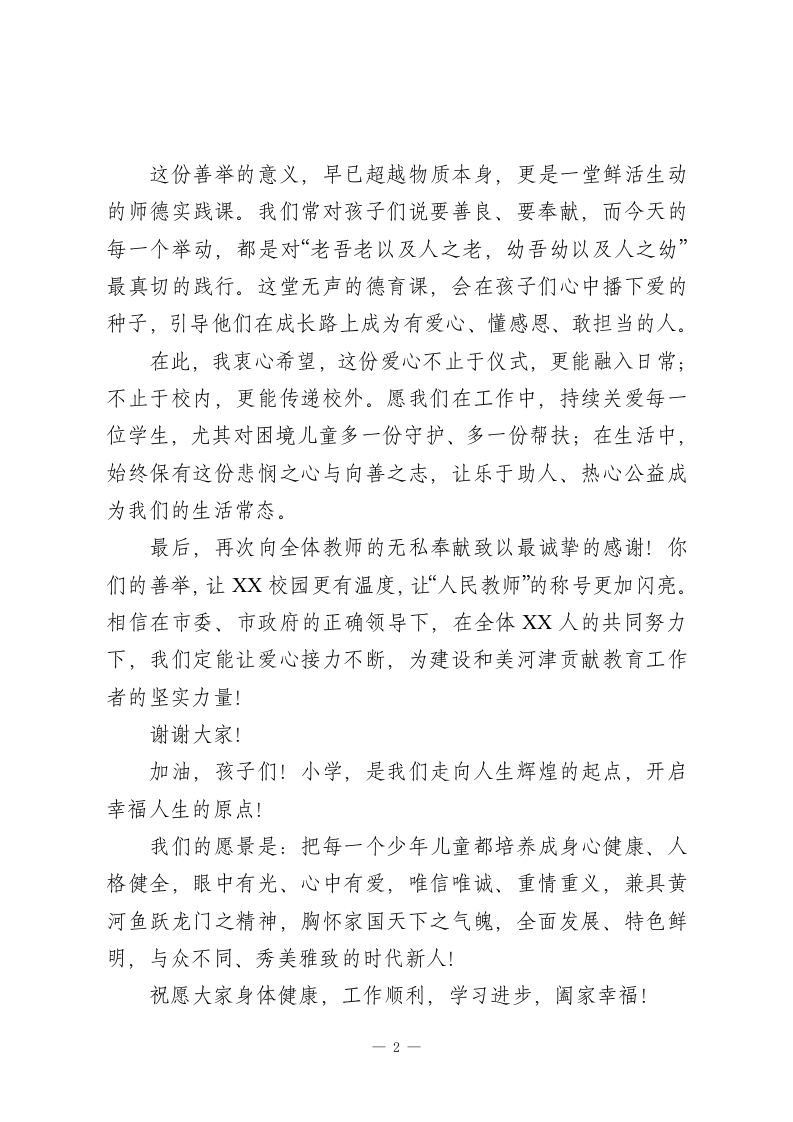 在XX小学“送温暖、献爱心”自愿捐助仪式上校长讲话尊敬的各位领导、亲爱的同事们:大家下午好!今天,我们以爱为名相聚于此,举行这场温暖而有意义的“送温暖、献爱心”自愿捐助仪式。首先,我代表学校党支部,向每一位主动伸出援手、慷慨解囊的同仁们,致以最崇高的敬意一一你们的善举,让这个冬日满是温情!市委、市政府发起的这项活动,既是心系民生的惠民工程,更是凝聚社会正能量的暖心之举,更是对我们教育工作者责任担当与精神风貌的一次生动检验。“人人为我,我为人人”的和谐风尚、“守望相助,同舟共济”的传统美德,从来都不是空洞的口号。作为人民教师,我们既要在三尺讲台上传道授业,更要在社会生活中以身作则,做社会主义核心价值观的坚定践行者与积极引领者。“学高为师,身正为范”。我们的爱心,藏在课堂上的耐心教海里,更显在对社会责任的主动担当上。今天,XX小学的全体教师用实际行动,诠释了“师者仁心”的深刻内涵。你们捐出的每一笔款项,都承载着对困难群众的深切关怀,都闪耀着为人师表的人性光辉。这份爱心将汇聚成暖流,为我市困难家庭送去冬日暖阳与生活希望,更向社会展现了XX教师群体高尚的道德情操与强烈的社会责任感。一1