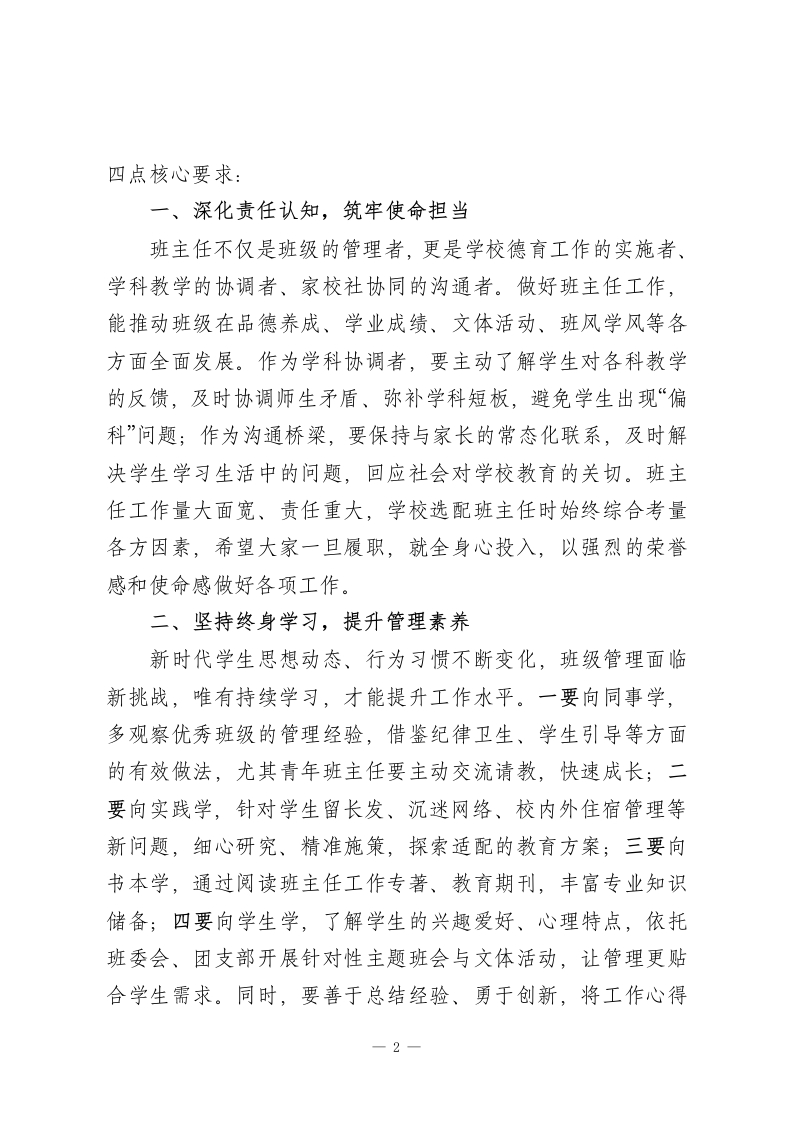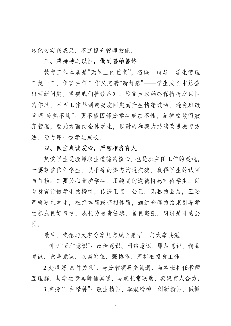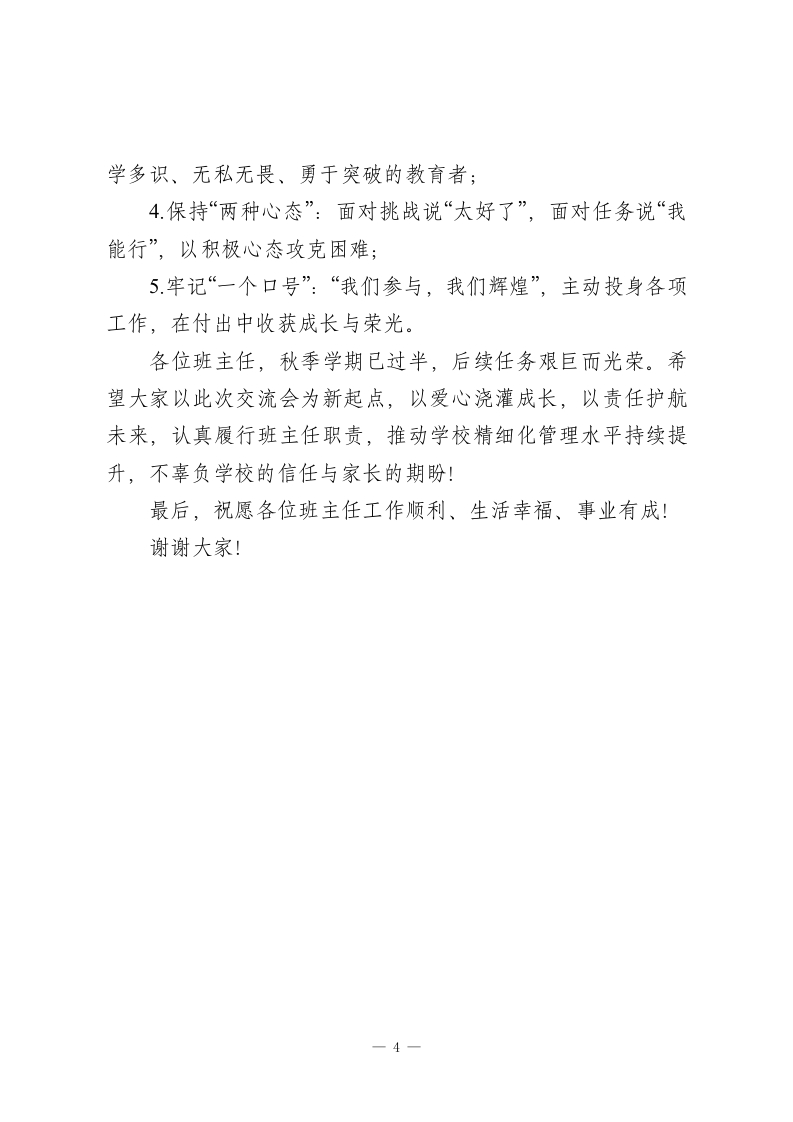 在班主任经验交流会上,校长精彩发言,凝心聚力强管理,匠心育人筑根基各位班主任老师、同志们:大家好!今天我们齐聚一堂召开班主任经验交流会,既是对前半程班级管理工作的复盘总结,更是为了搭建互学互鉴的平台,凝聚育人合力,推动后续工作再上新台阶。刚才,12位班主任分享了各自的管理经验,内容务实、方法实用、精神感人,限于时间未能发言的老师,会后政教处将收集整理大家的经验材料汇编印发,方便大家进一步交流学习。在此,我代表学校,向全体班主任的无私付出与辛勤耕耘,表示最衷心的感谢!班主任是学校工作的骨干力量,是教育教学的主力军,更是连接学校、家庭、社会的桥梁纽带。一所学校的发展质量,很大程度上取决于班主任队伍的战斗力。我校班主任队伍始终秉持“识大体、顾大局、不计得失”的思想境界,工作踏实务实,为学校精细化管理推进、校风学风建设、学生全面发展筑牢了根基。当前,学校正朝着精细化管理目标稳步迈进,各项制度不断完善,而班主任作为各项工作的最终执行者和落实者,是学校发展的“支柱”,一个班级的管理成效,直接影响学校整体工作的优劣。希望大家深刻认识自身职责的重要性,以更高的标准、更实的作风,扛起育人使命。结合前半程工作实际与后续学期任务,我对班主任工作提1