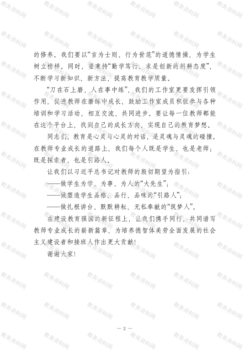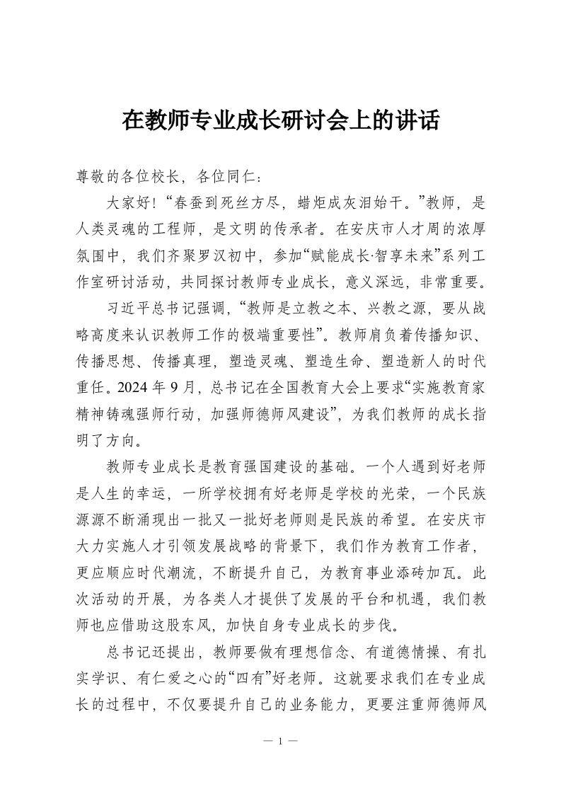 在教师专业成长研讨会上的讲话尊敬的各位校长,各位同仁:大家好!“春蚕到死丝方尽,蜡炬成灰泪始干。”教师,是人类灵魂的工程师,是文明的传承者。在安庆市人才周的浓厚氛围中,我们齐聚罗汉初中,参加“赋能成长·智享未来”系列工作室研讨活动,共同探讨教师专业成长,意义深远,非常重要。习近平总书记强调,“教师是立教之本、兴教之源,要从战略高度来认识教师工作的极端重要性”。教师肩负着传播知识、传播思想、传播真理,塑造灵魂、塑造生命、塑造新人的时代重任。2024年9月,总书记在全国教育大会上要求“实施教育家精神铸魂强师行动,加强师德师风建设”,为我们教师的成长指明了方向。教师专业成长是教育强国建设的基础。一个人遇到好老师是人生的幸运,一所学校拥有好老师是学校的光荣,一个民族源源不断涌现出一批又一批好老师则是民族的希望。在安庆市大力实施人才引领发展战略的背景下,我们作为教育工作者,更应顺应时代潮流,不断提升自己,为教育事业添砖加瓦。此次活动的开展,为各类人才提供了发展的平台和机遇,我们教师也应借助这股东风,加快自身专业成长的步伐。总书记还提出,教师要做有理想信念、有道德情操、有扎实学识、有仁爱之心的“四有”好老师。这就要求我们在专业成长的过程中,不仅要提升自己的业务能力,更要注重师德师风1