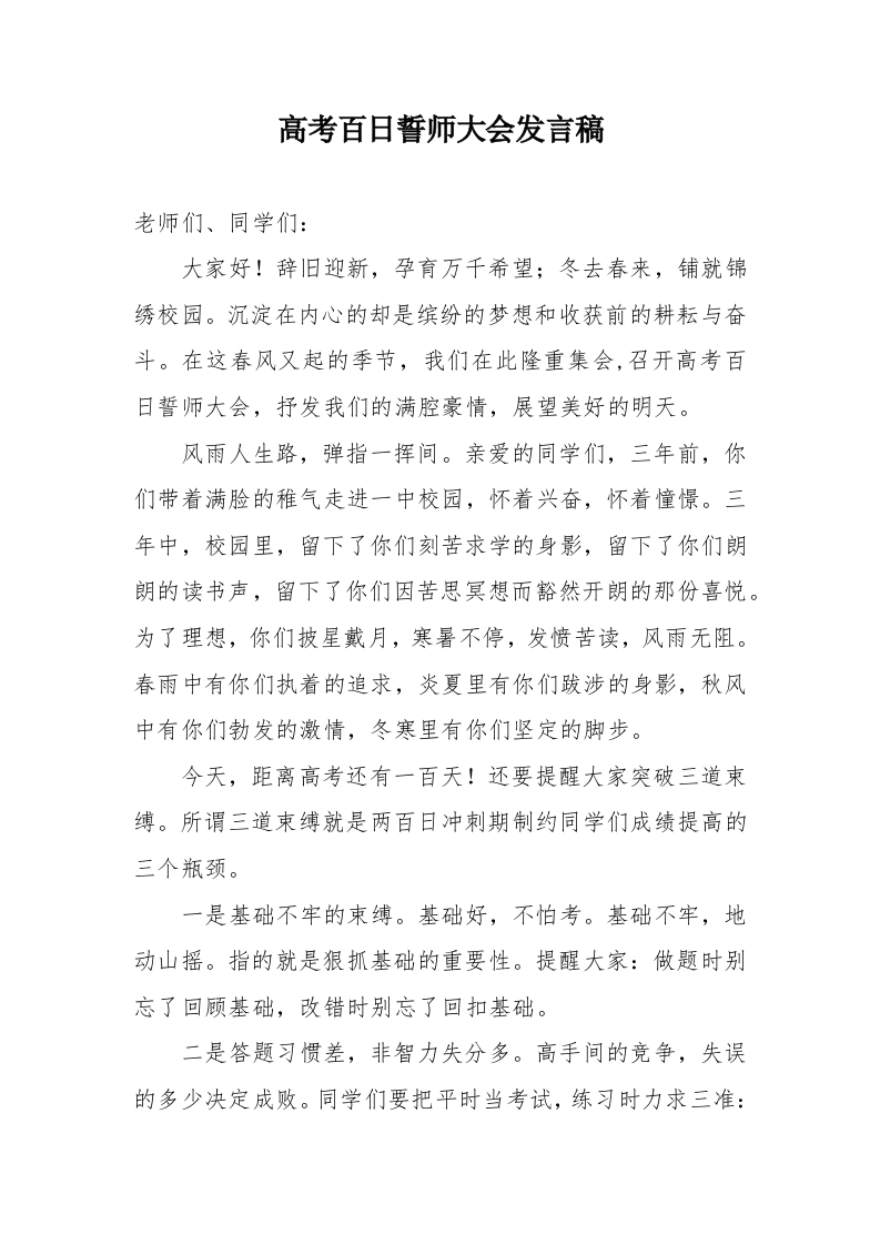 高考百日誓师大会发言稿老师们、同学们:大家好!辞旧迎新,孕育万千希望;冬去春来,铺就锦绣校园。沉淀在内心的却是缤纷的梦想和收获前的耕耘与奋斗。在这春风又起的季节,我们在此隆重集会,召开高考百日誓师大会,抒发我们的满腔豪情,展望美好的明天。风雨人生路,弹指一挥间。亲爱的同学们,三年前,你们带着满脸的稚气走进一中校园,怀着兴奋,怀着憧憬。三年中,校园里,留下了你们刻苦求学的身影,留下了你们朗朗的读书声,留下了你们因苦思冥想而豁然开朗的那份喜悦。为了理想,你们披星戴月,寒暑不停,发愤苦读,风雨无阻。春雨中有你们执着的追求,炎夏里有你们跋涉的身影,秋风中有你们勃发的激情,冬寒里有你们坚定的脚步。今天,距离高考还有一百天!还要提醒大家突破三道束缚。所谓三道束缚就是两百日冲刺期制约同学们成绩提高的三个瓶颈。一是基础不牢的束缚。基础好,不怕考。基础不牢,地动山摇。指的就是狠抓基础的重要性。提醒大家:做题时别忘了回顾基础,改错时别忘了回扣基础。二是答题习惯差,非智力失分多。高手间的竞争,失误的多少决定成败。同学们要把平时当考试,练习时力求三准: