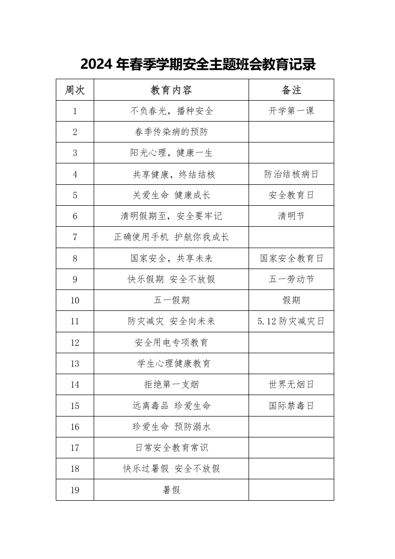 2024年春季学期安全主题班会教育记录周次教育内容备注1不负春光,播种安全开学第一课2春季传染病的预防3阳光心理,健康一生4共享健康,终结结核防治结核病日6关爱生命健康成长安全教育日6清明假期至,安全要牢记清明节7正确使用手机护航你我成长8国家安全,共享未来国家安全教育日9快乐假期安全不放假五一劳动节10五一假期假期11防灾减灾安全向未来5.12防灾减灾日12安全用电专项教育13学生心理健康教育14拒绝第一支烟世界无烟日15远离毒品珍爱生命国际禁毒日16珍爱生命预防溺水17日常安全教育常识18快乐过暑假安全不放假19暑假