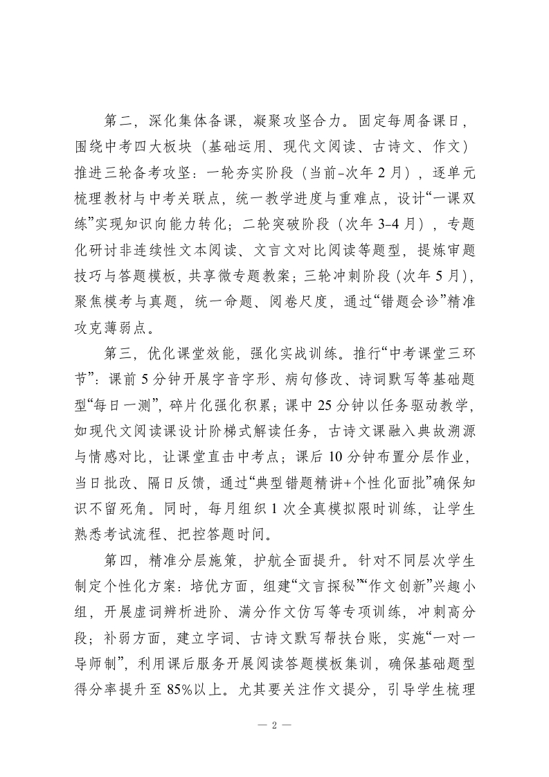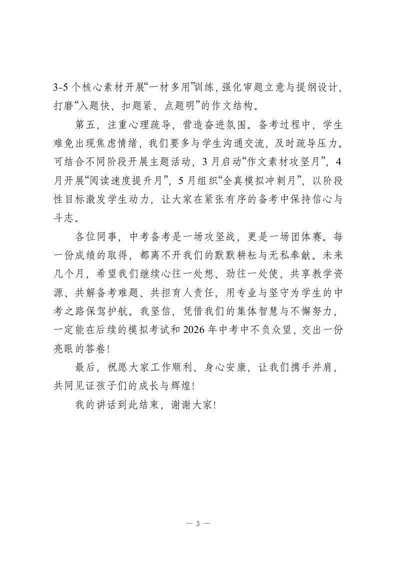 初三年级语文备课组工作部署校长讲话:凝心聚力研备考,深耕细作创佳绩各位亲爱的同事:大家下午好!时光飞逝,2025年的最后一个月已然来临,我们也正式迈入2026年中考语文备考的关键冲刺阶段。此刻,距离多轮模拟考试和最终的中考已越来越近,每一分每一秒都承载着学生的梦想、家长的期盼,更关乎我们备课组的责任与荣光。过去一段时间,在大家的并肩奋战下,我们依托集体智慧深耕教学,学生的语文素养与应试能力稳步提升,在前期检测中取得了不错的成绩。今天,我希望我们能趁热打铁、凝心聚力,以更精准的策略、更务实的行动,在后续的模拟考试和中考中续写辉煌,再创佳绩!要实现目标,离不开科学的备考规划与高效的团队协作。结合《义务教育语文课程标准(2022年版)》要求与2026年中考命题趋势,我对后续工作提几点具体建议,与大家共勉:第一,锚定备考方向,筑牢教研根基。我们要集体深入研读课标中的“学业质量标准”,结合近年中考真题与最新模拟卷,每月开展2次专题研讨,重点聚焦“任务群教学落地”“整本书阅读与中考衔接“传统文化素材活用”等核心议题。通过“课标理论+命题分析”的深度融合,统一教学认知,让每一节课都精准对接中考核心能力要求,确保备考不偏航、不盲目。1