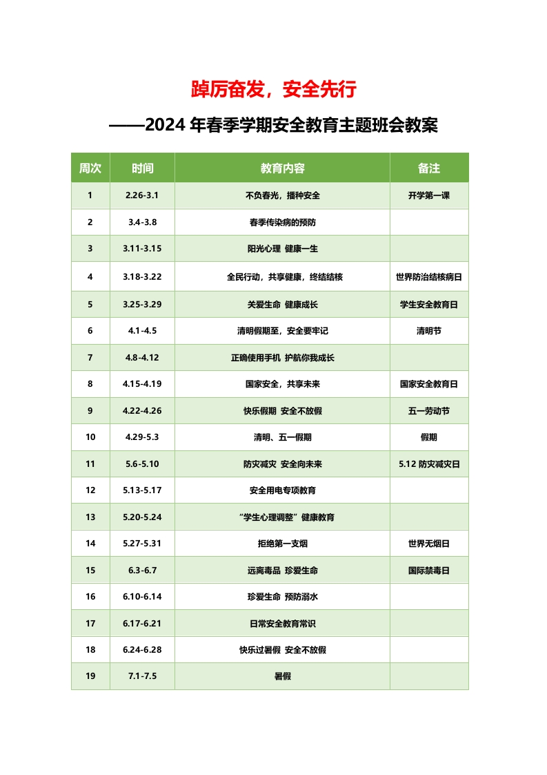踔厉奋发,安全先行2024年春季学期安全教育主题班会教案周次时间教育内容备注2.26-3.1不负春光,播种安全开学第一课23.4-3.8春季传染病的预防3.11-3.15阳光心理健康一生3.18-3.22全民行动,共享健康,终结结核世界防治结核病日3.25-3.29关爱生命健康成长学生安全教育日4.1-4.5清明假期至,安全要牢记清明节4.8-4.12正确使用手机护航你我成长4.15-4.19国家安全,共享未来国家安全教育日94.22-4.26快乐假期安全不放假五一劳动节104.29-5.3清明、五一假期假期115.6-5.10防灾减灾安全向未来5.12防灾减灾日125.13-5.17安全用电专项教育135.20-5.24”学生心理调整”健康教育145.27-5.31拒绝第一支烟世界无烟日156.3-6.7远离毒品珍爱生命国际禁毒日166.10-6.14珍爱生命预防溺水176.17-6.21日常安全教育常识186.24-6.28快乐过暑假安全不放假197.1-7.5暑假
