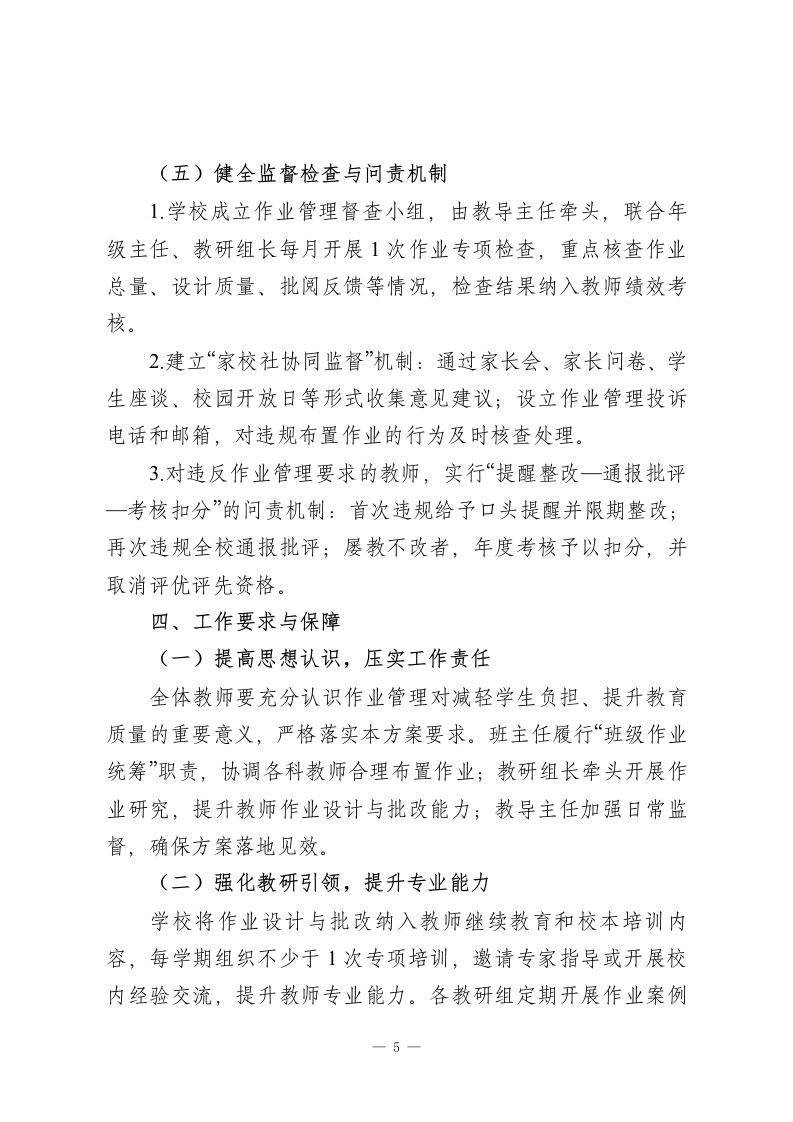 小学作业管理工作方案(试行)为深入贯彻“双减”政策要求,切实减轻学生过重学业负担,促进学生全面发展与健康成长,进一步规范我校作业管理流程、提升教育教学质量,结合我校办学实际、师资水平及学生发展特点,特制定本作业管理工作方案。一、指导思想以习近平新时代中国特色社会主义思想为指导,全面贯彻党的教育方针,落实立德树人根本任务,深入学习全国教育大会、省教育大会精神及《关于进一步减轻义务教育阶段学生作业负担和校外培训负担的意见》《省中小学教学基本规范》等文件要求,坚持“以生为本、提质增效、科学规范”原则,构建“减量、提质、增效”的作业管理体系,让作业真正成为巩固知识、培养能力、发展素养的重要载体,助力学生核心素养全面提升。二、组织机构及职责为确保作业管理工作有序推进、落地见效,成立学校作业管理工作领导小组,明确职责分工,形成“校长统筹、分管领导牵头、部门协同、教师落实、家校联动”的工作格局。(一)领导小组组长:XXX(校长)一全面统筹作业管理工作,审批方案、协调资源、监督落实;副组长:XXX(分管教学副校长)、XXX(教导主任)一具体负责方案实施,组织教研、检查督导、处理反馈问题;一1
