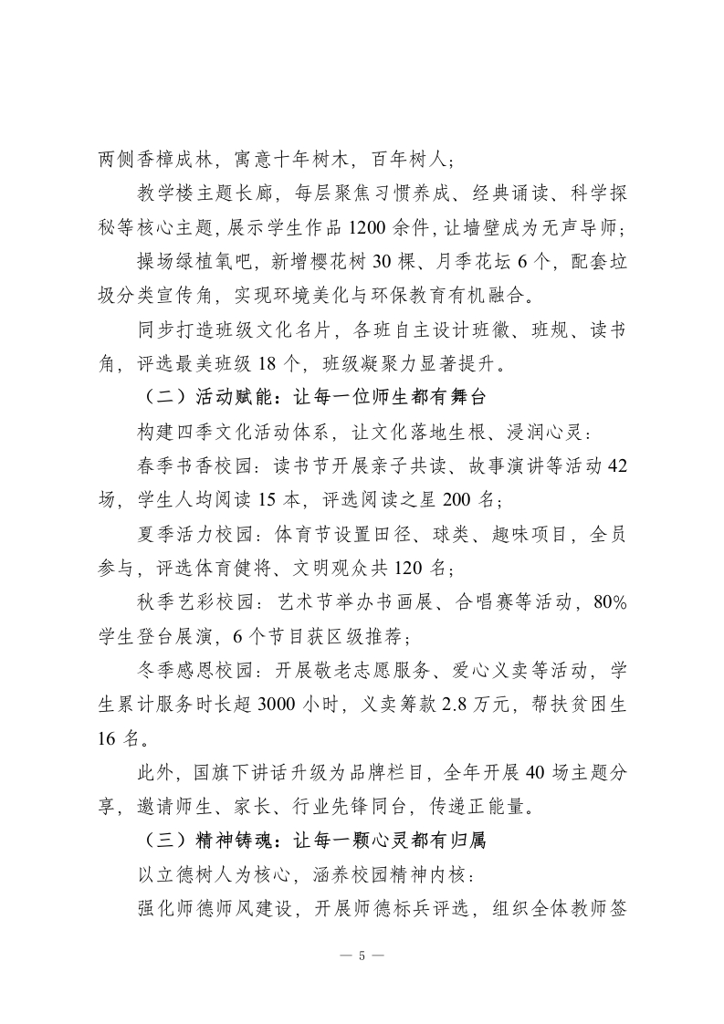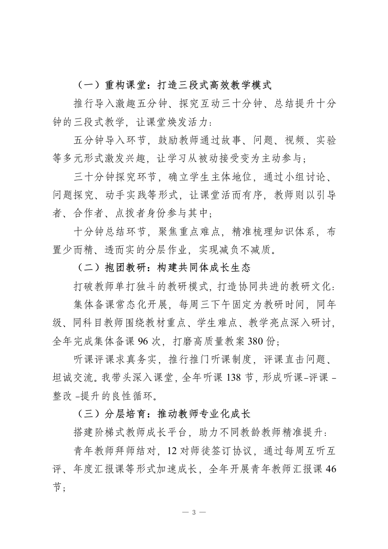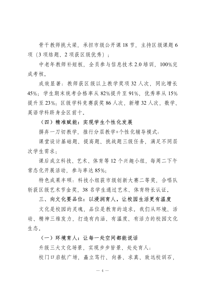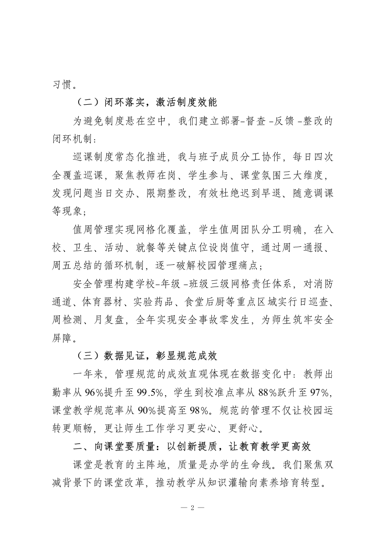 校长年度述职报告:守正创新谋发展,凝心聚力育新人各位领导、老师们:大家好!回望过去一年的教育征程,我始终坚守“向管理要规范,向课堂要质量,向文化要品位”的核心主线,这既是我履职尽责的行动指南,更是全校师生凝心聚力、共同奋进的奋斗方向。今天,我将从工作实践、成效亮点、反思不足与未来规划四个方面,向大家作详细述职,请予评议。一、向管理要规范:以制度赋能,让校园运转更有序管理的本质是激活效能,规范的核心是护航发展。我们坚持严而有爱、细而不苛的管理理念,推动校园管理从松散化向精细化转变。(一)立规明矩,筑牢制度根基“其身正,不令而行”。我坚持每日七点到校,在校园门口巡查学生入校秩序、督查值班教师到岗情况,以常态化示范引领,带动全体教职工践行岗位职责。在制度建设上,我们摒弃形式主义,构建实用、管用、好用的制度体系:考勤管理实行指纹打卡+月度公示制,做到公开透明;请假流程严格执行分级审批,确保教学秩序不受影响;教学常规明确五个必须:备课提前一周、作业当日批改、辅导因材施教、考试严格监考、分析及时反馈,将要求固化为-1