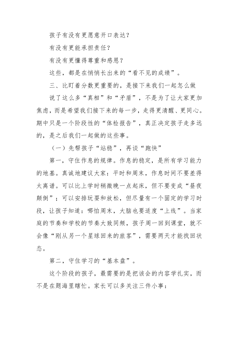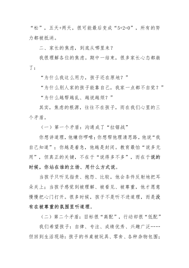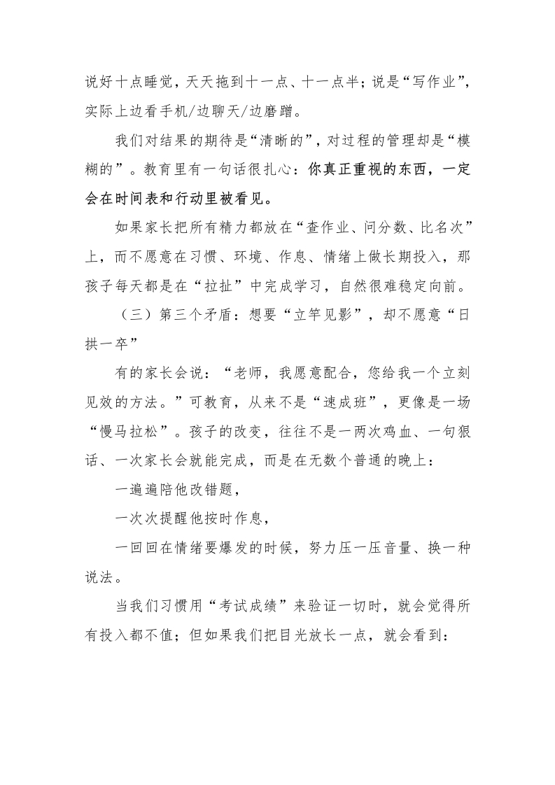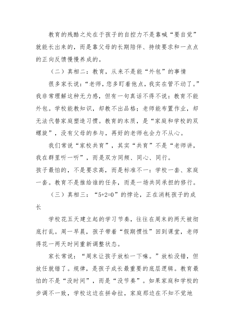 致不容易的家长—2025年秋季期中家长会发言稿各位家长,晚上好。今天的家长会,我不想说那些听起来温柔却没用的安慰话,也不打算照本宣科讲流程。期中考试刚结束,成绩已经摆在那里有人欣慰,也有人焦虑。但我想,我们今天不该只谈分数,而应该谈谈教育的真相:孩子为什么学得慢?为什么家长越来越累?为什么明明都在努力,却看不见进步?今天,我想和大家聊聊那些看似扎心,却最值得面对的事实。一、三个不太好听,但必须认清的真相(一)真相一:真正自律的孩子,少之又少十几年教学生涯里,我遇到过几千个孩子,但“天生自觉”的,几乎没有。那些你以为“从不需要家长操心”的孩子,其实背后都有父母长期“他律”的陪伴:有人陪他早起读书,有人陪他练字到深夜,有人默默在灯下帮他整理错题、检查作业。孩子的“自觉”,往往是父母长年“坚持”的延续。别把“自律”当作天赋,它是被陪出来、被熬出来、被坚持出来的。